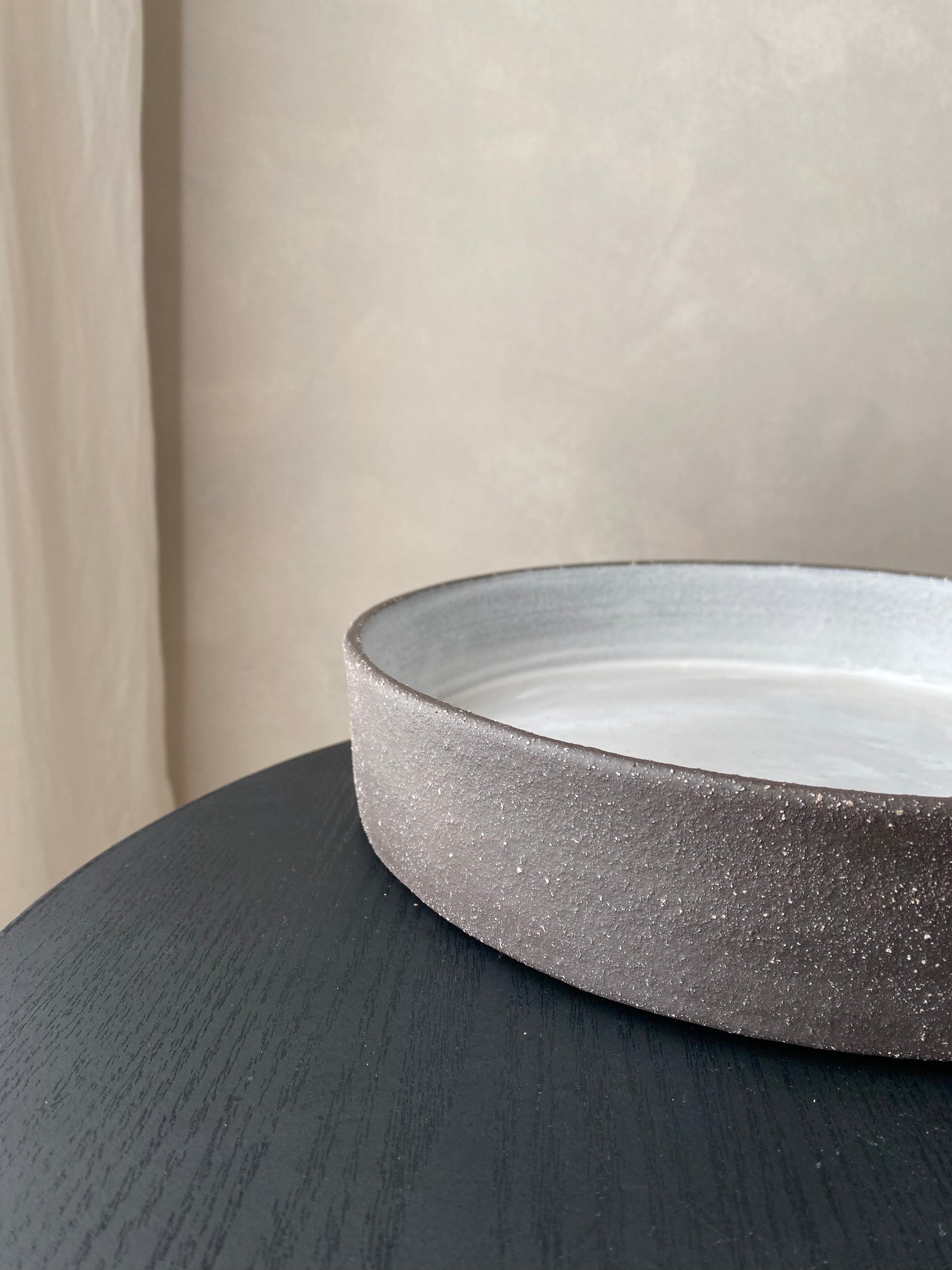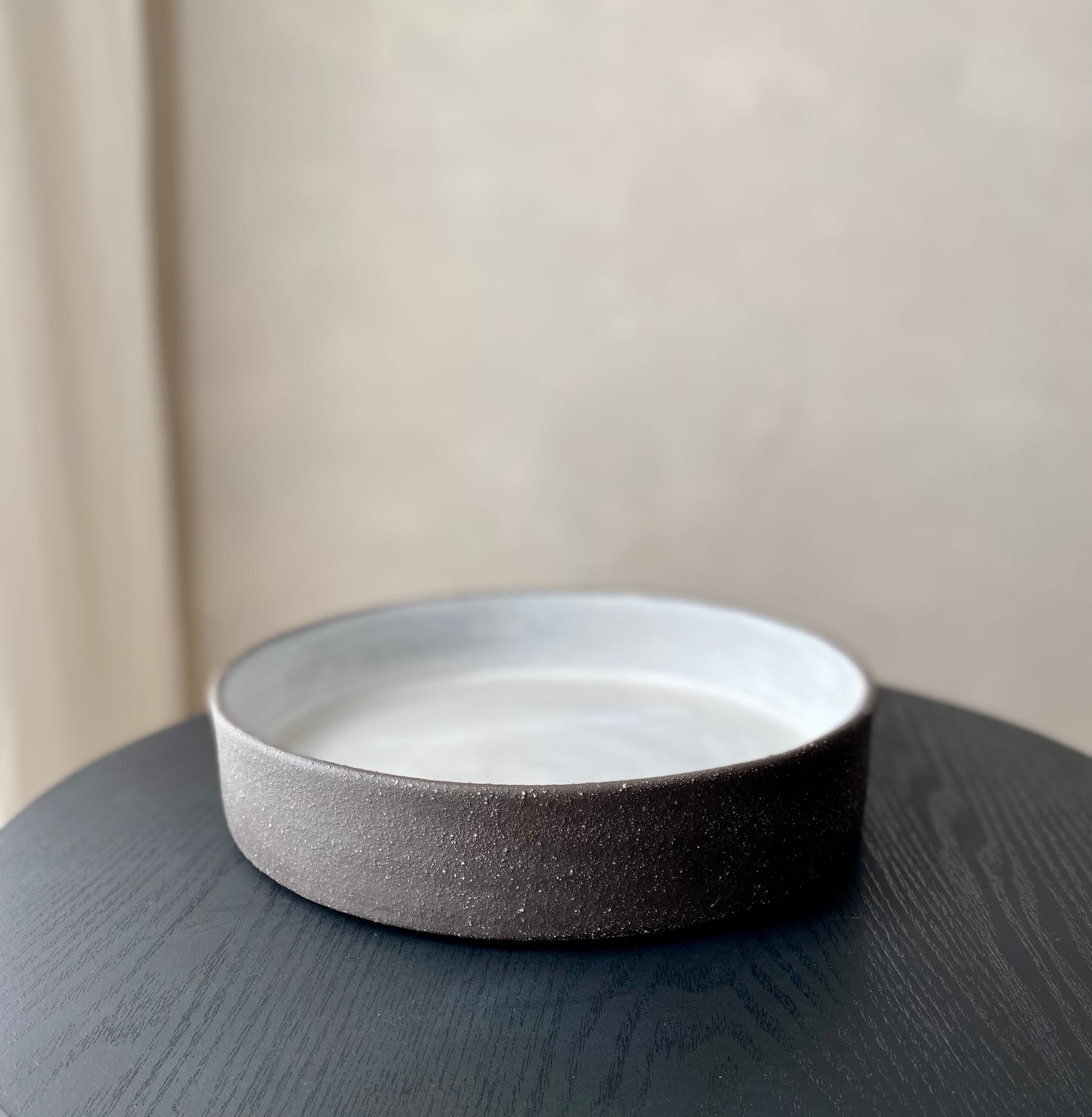 Wheel formed black stoneware with an internal glossy white glaze.