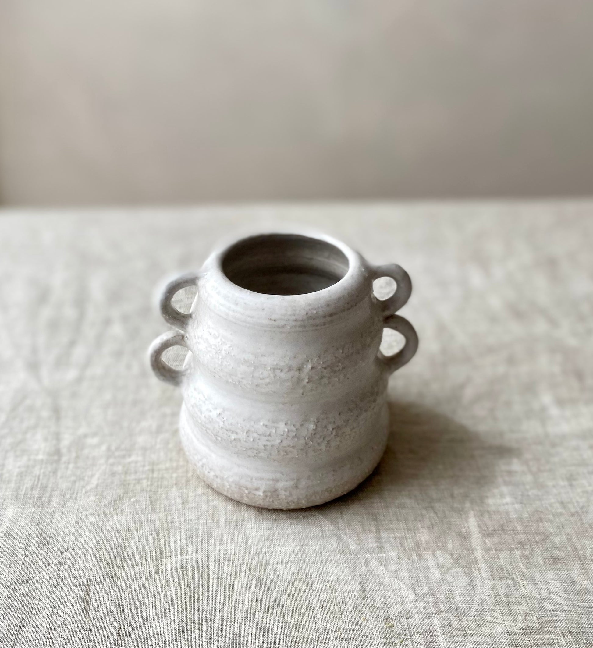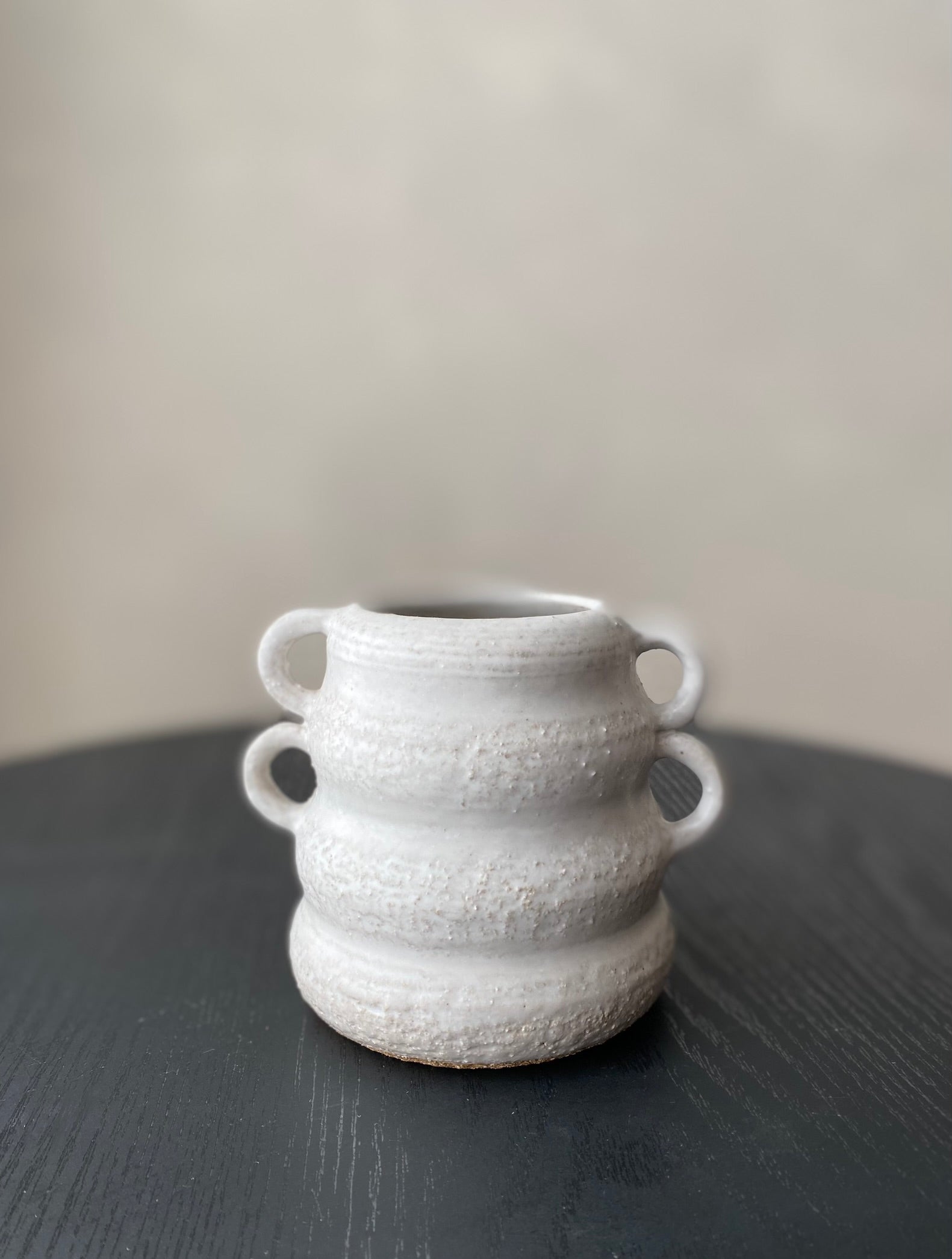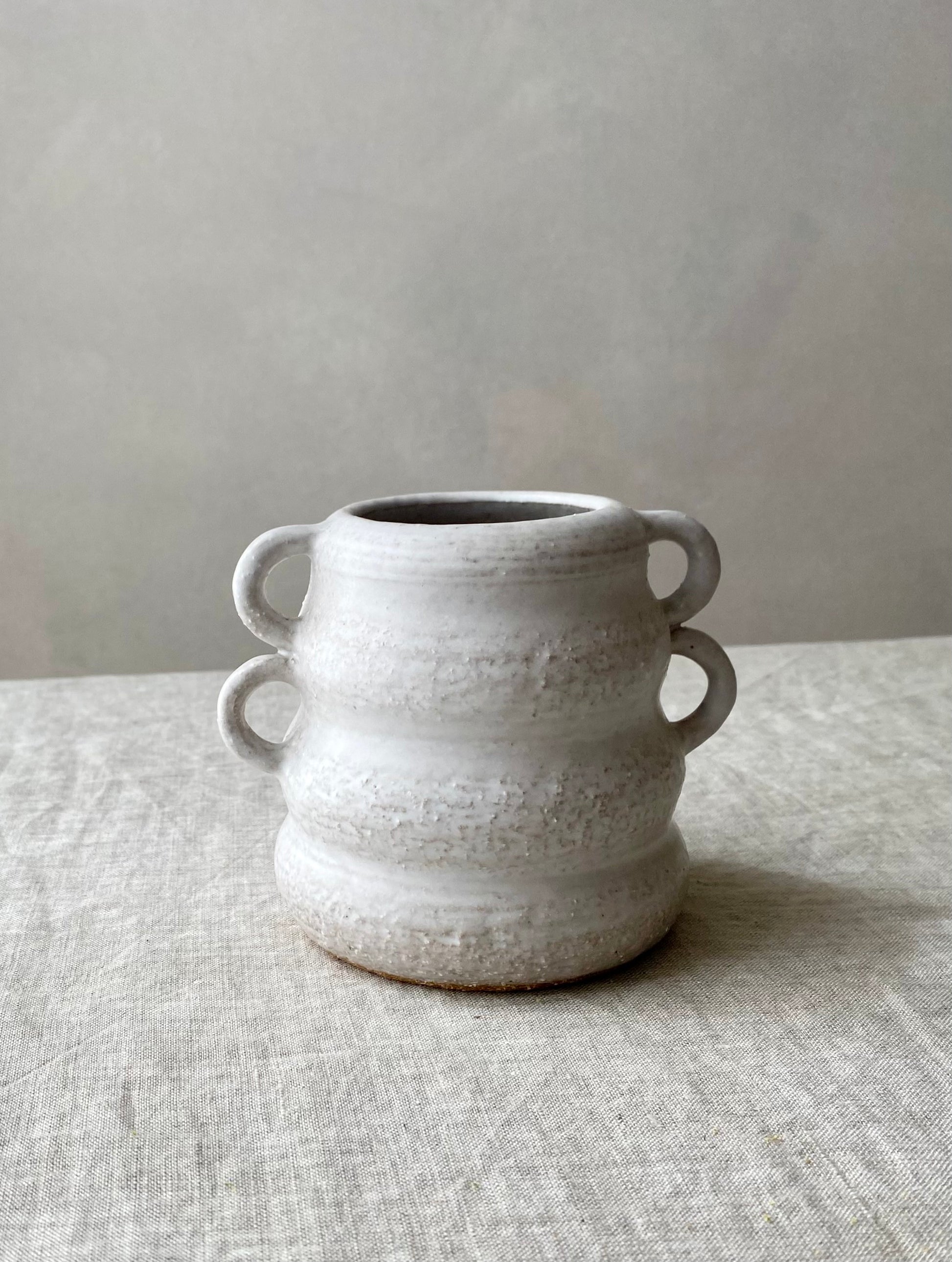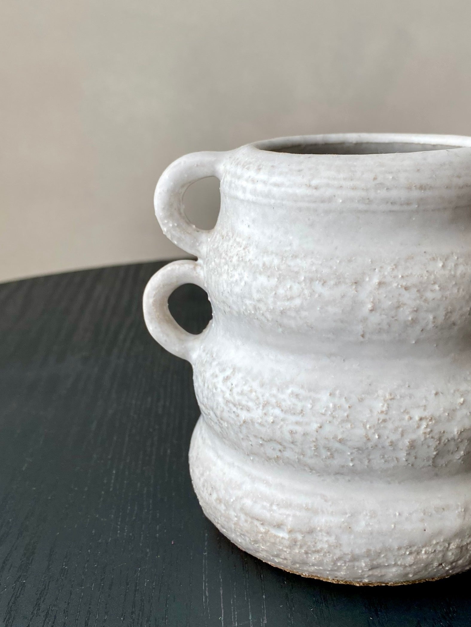 Wheel formed textured stoneware with a matte white glaze and hand formed decoration