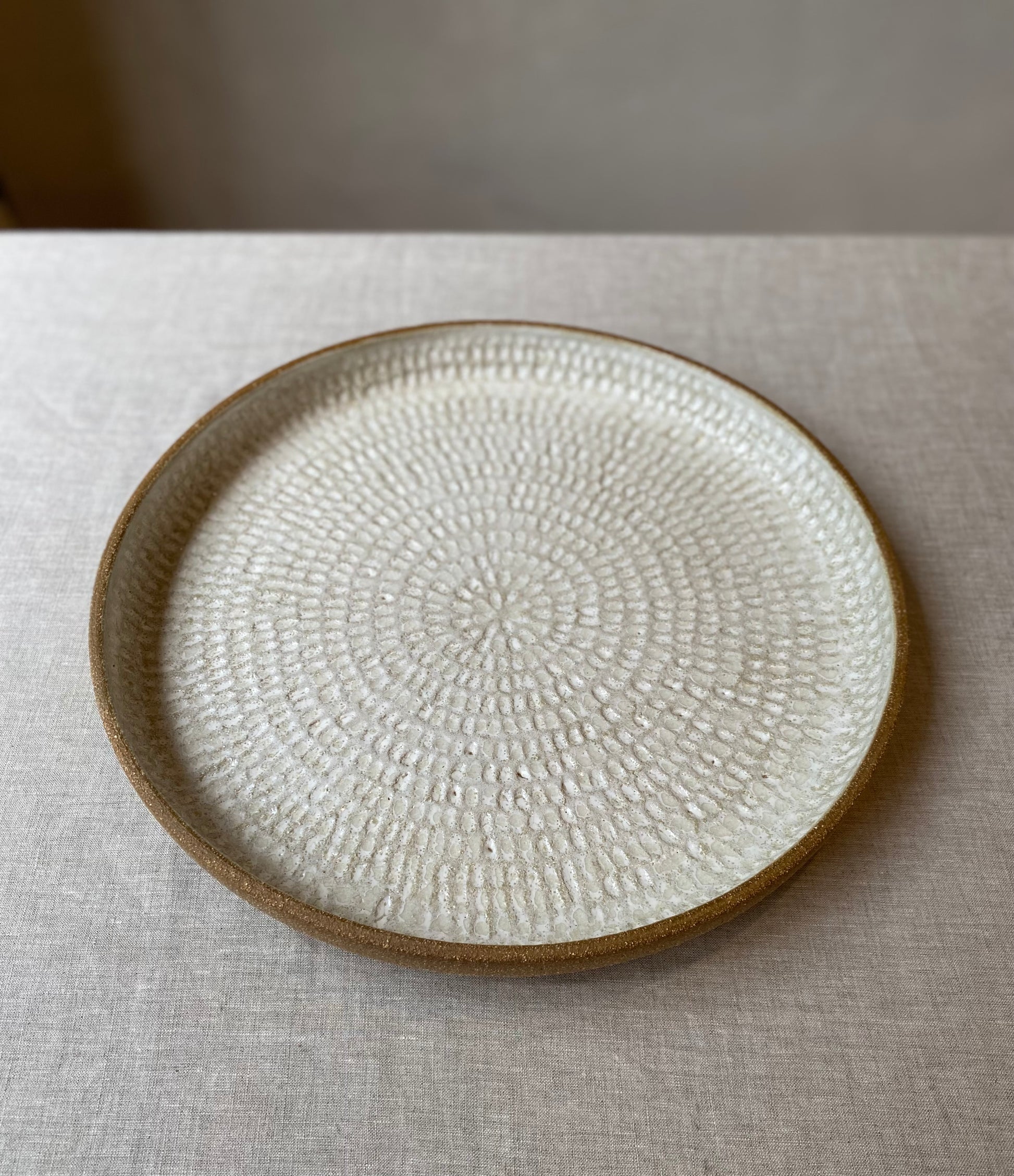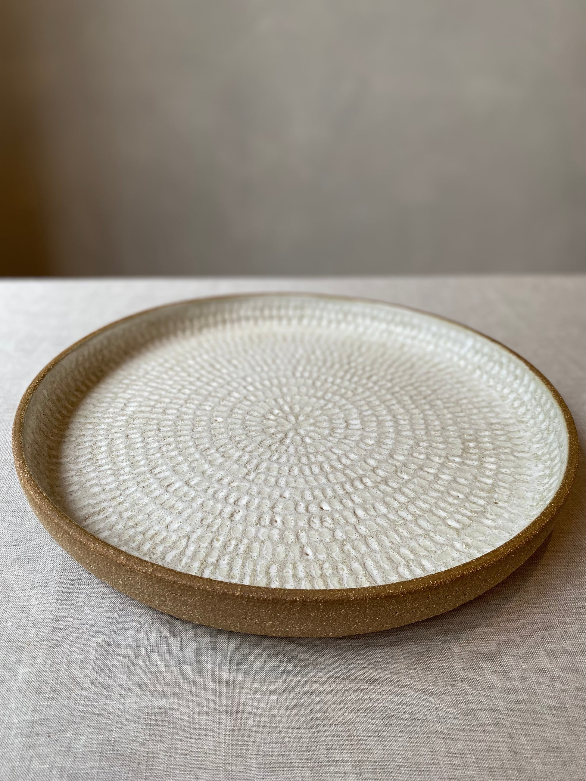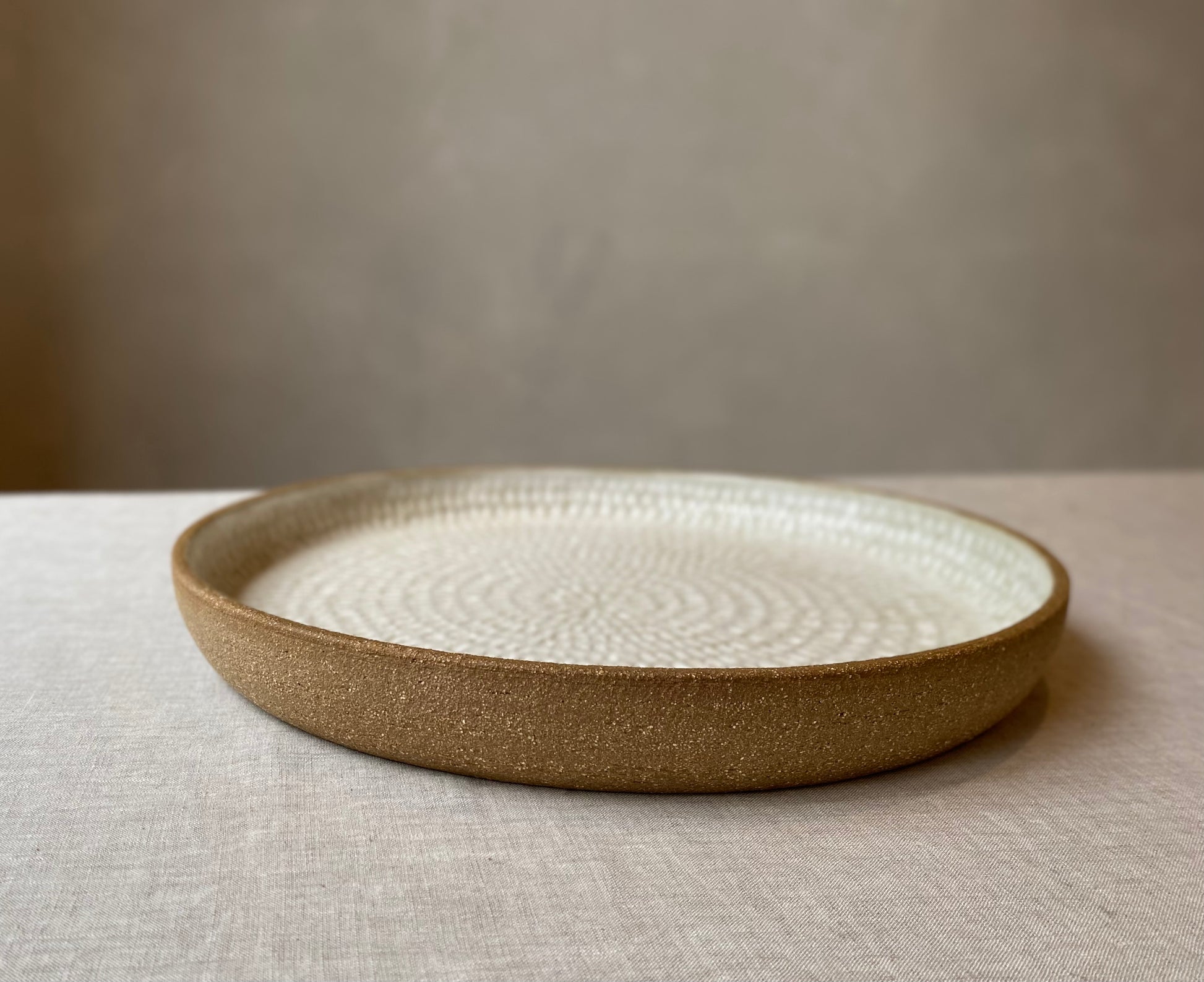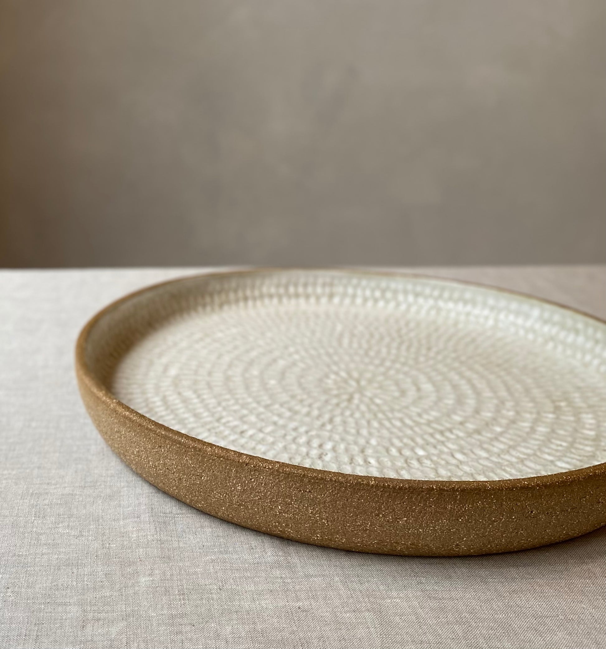 Wheel formed stoneware with satin buff glaze and hand carved decoration