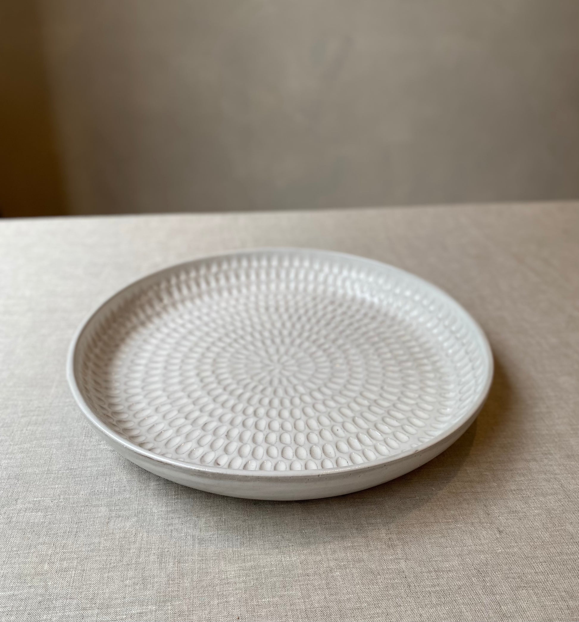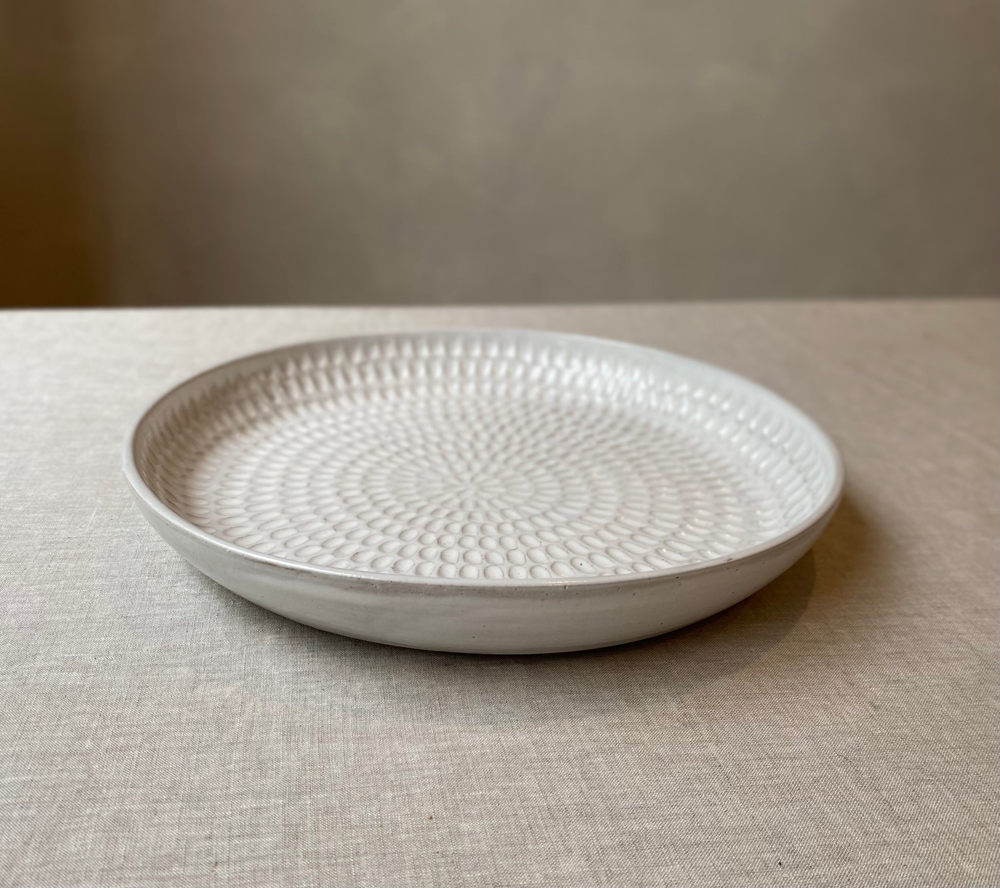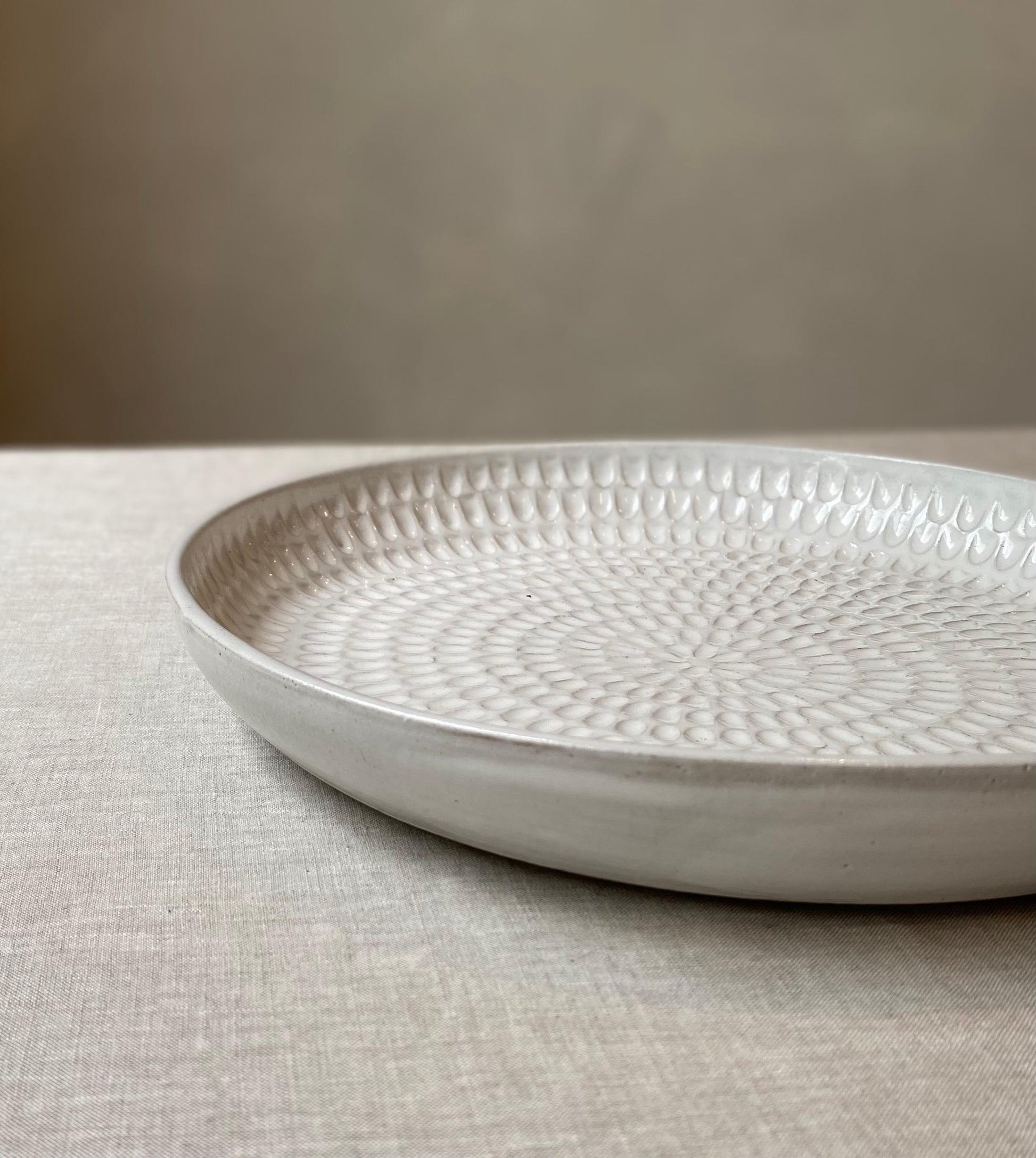 Wheel formed in textured stoneware with gloss white glaze. Hand carved decoration.