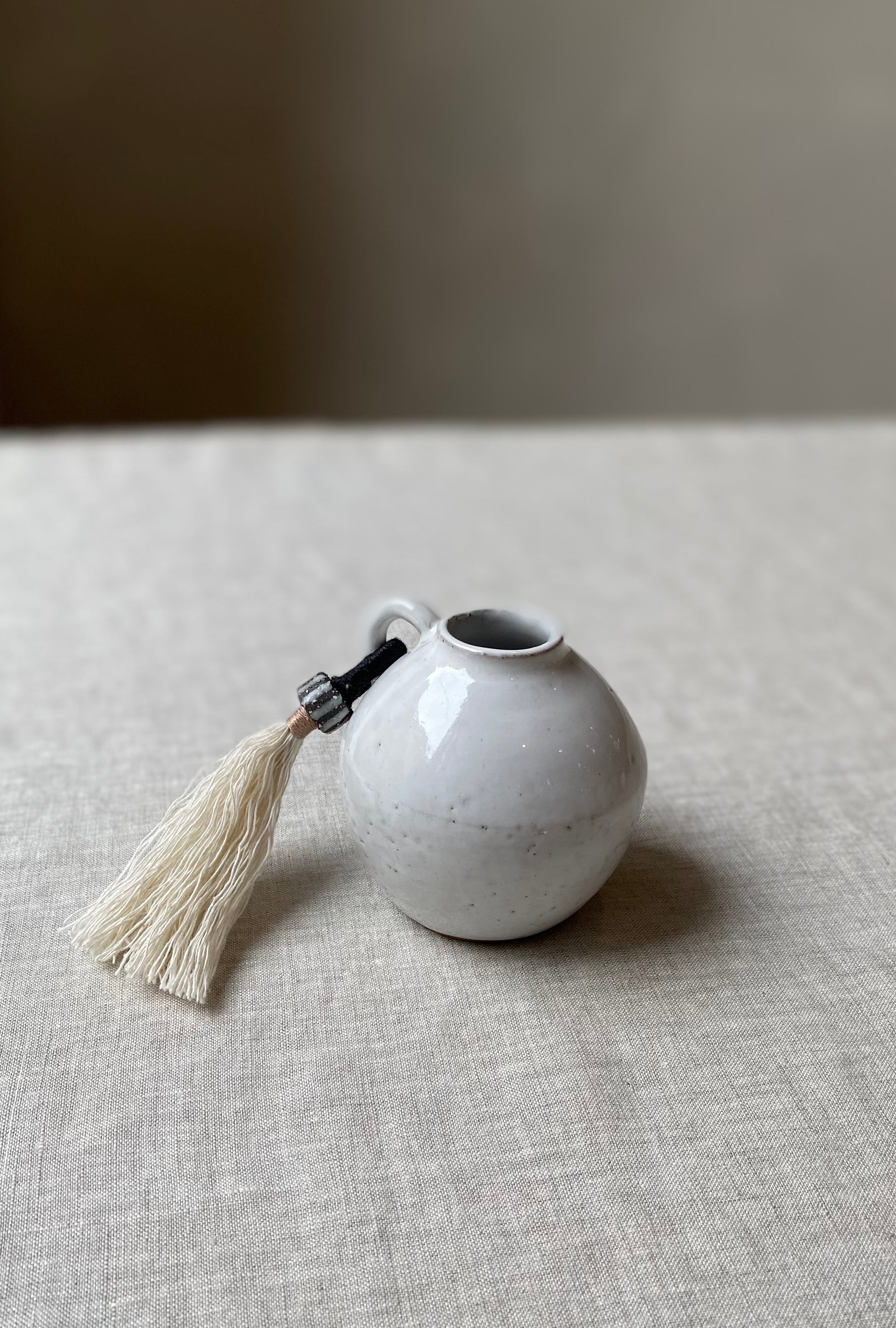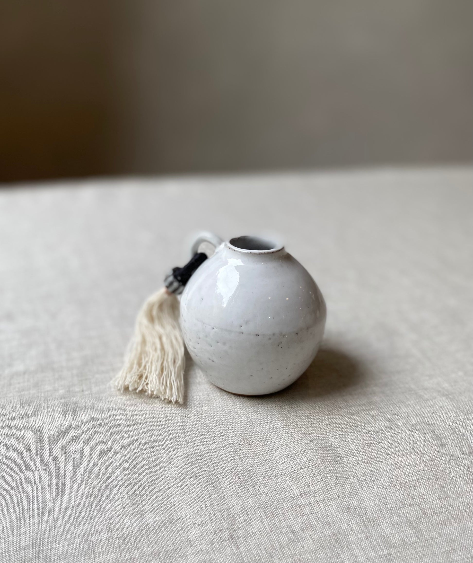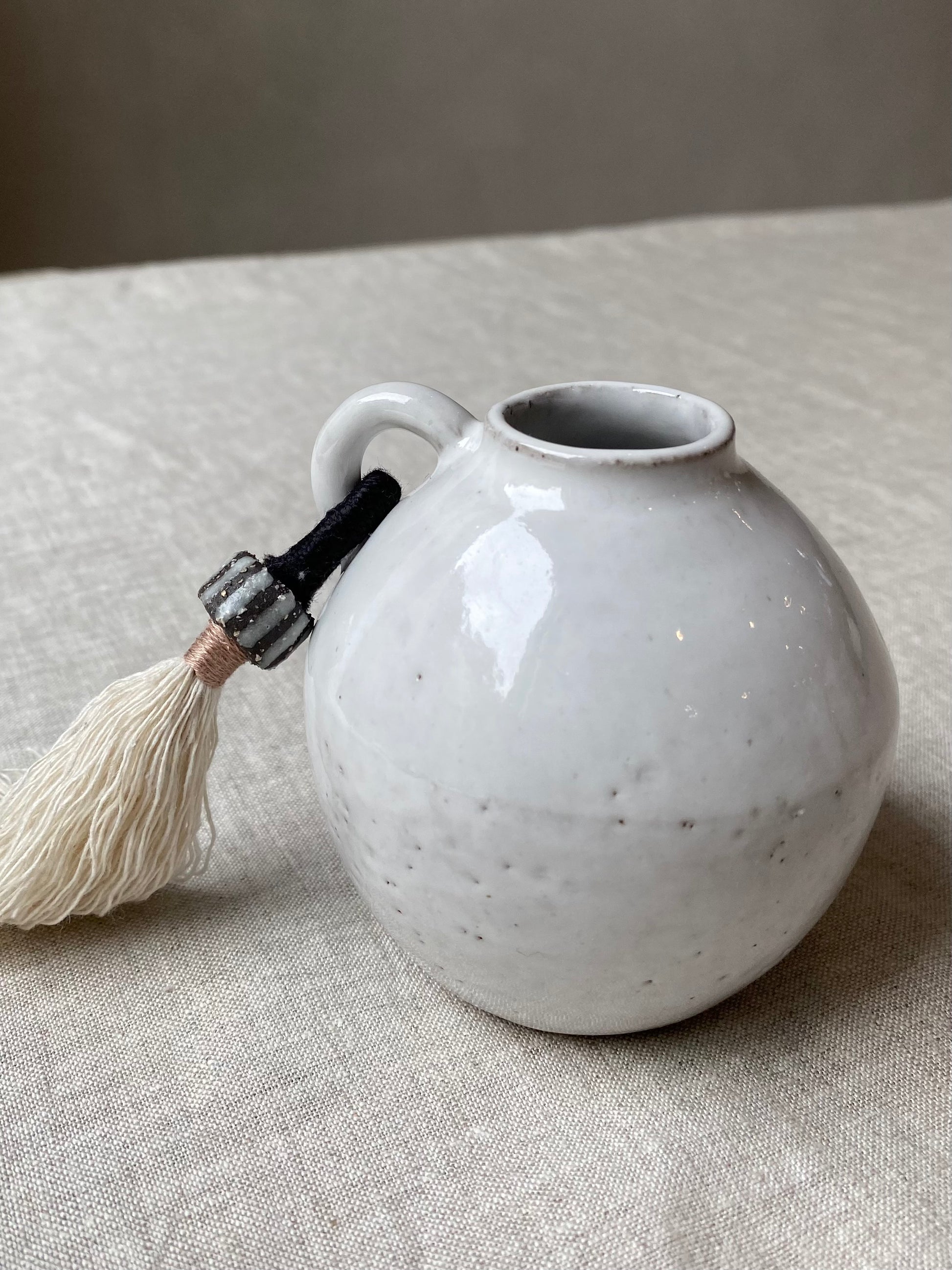 Wheel formed stoneware with gloss white glaze and hand made stoneware bead and tassel.