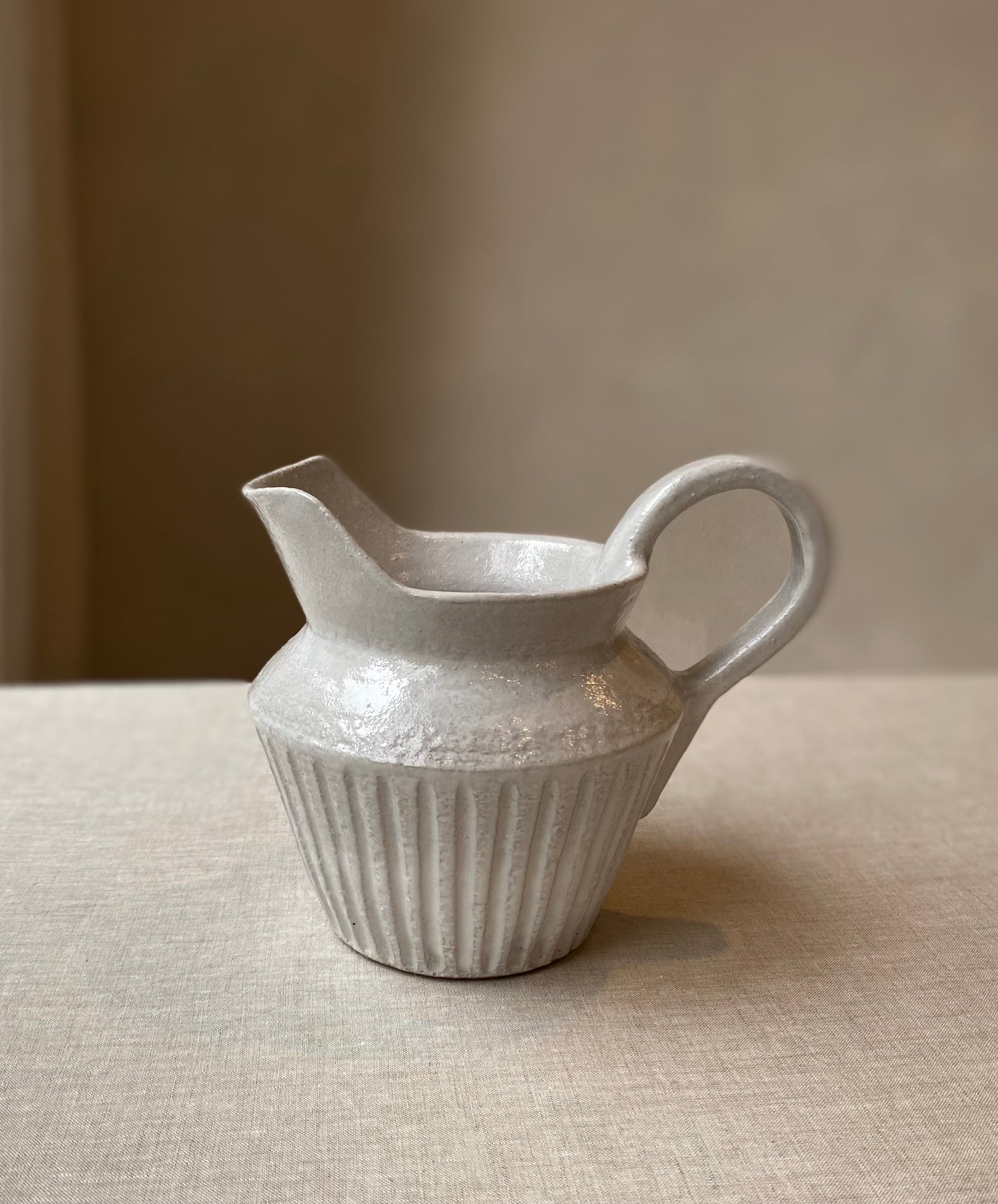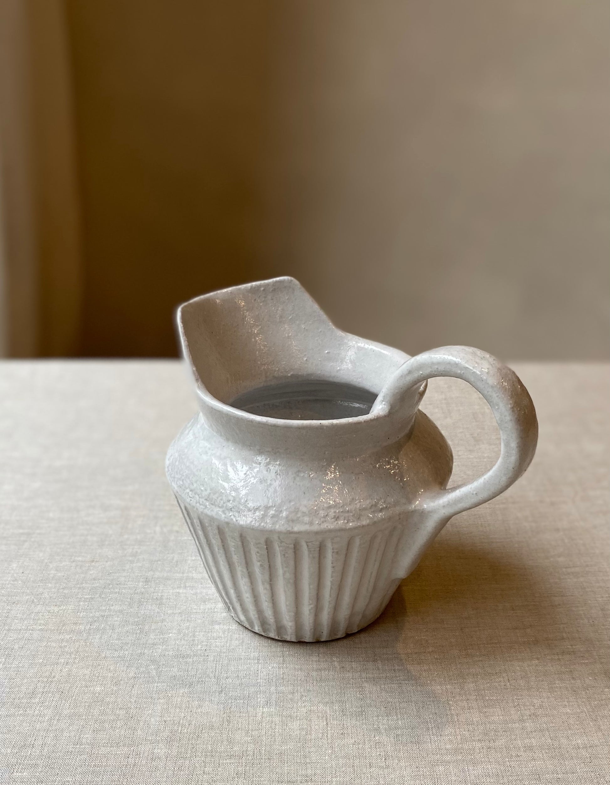 Wheel and hand formed jug in textured stoneware with a gloss white glaze. Hand carved fluting around the base.