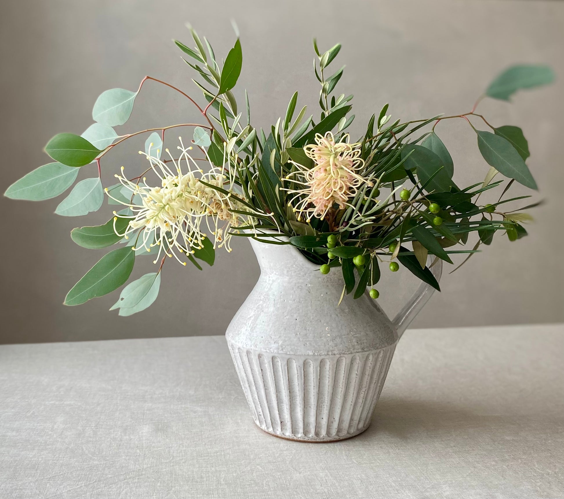 Wheel and hand formed jug in textured stoneware with a gloss white glaze. Hand carved fluting around the base.