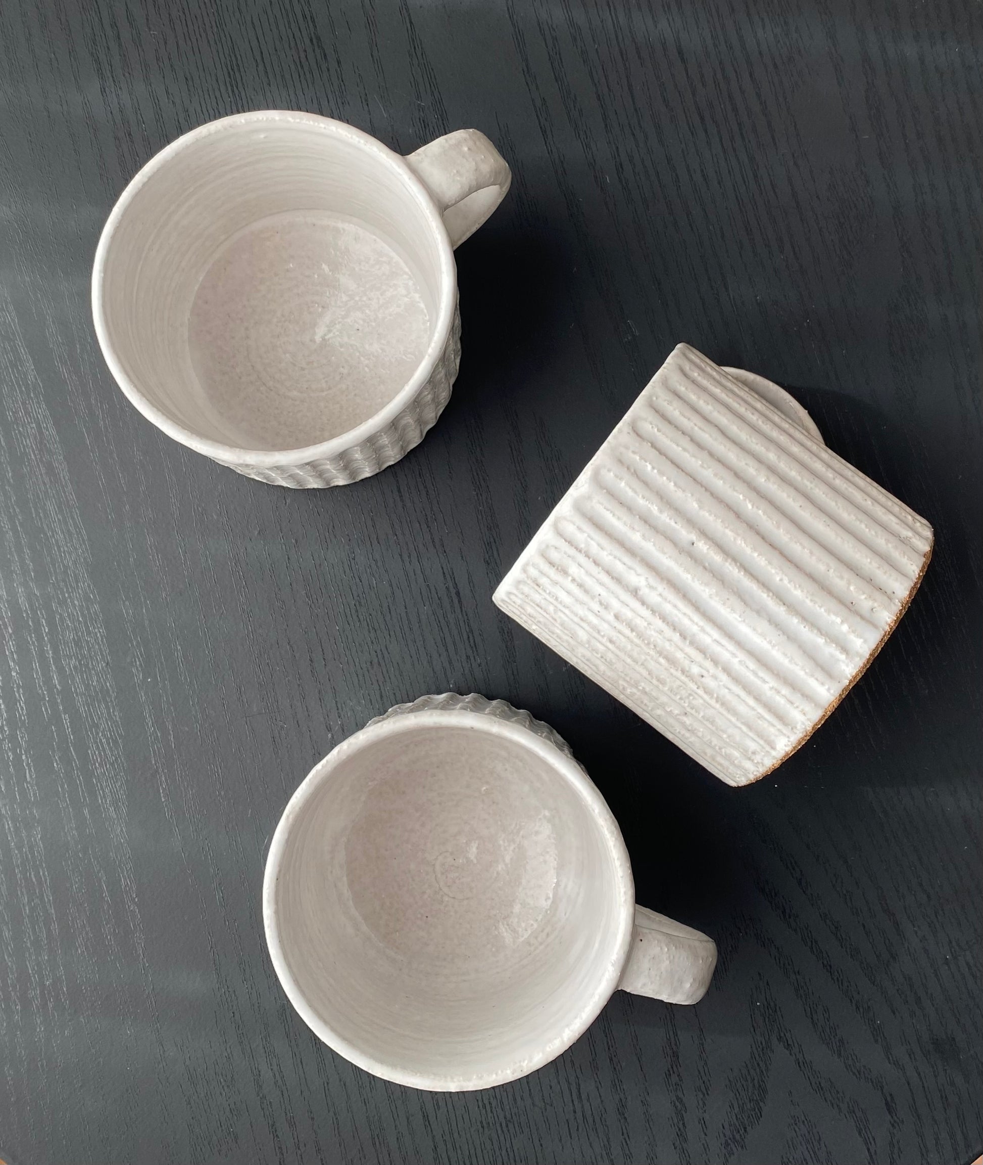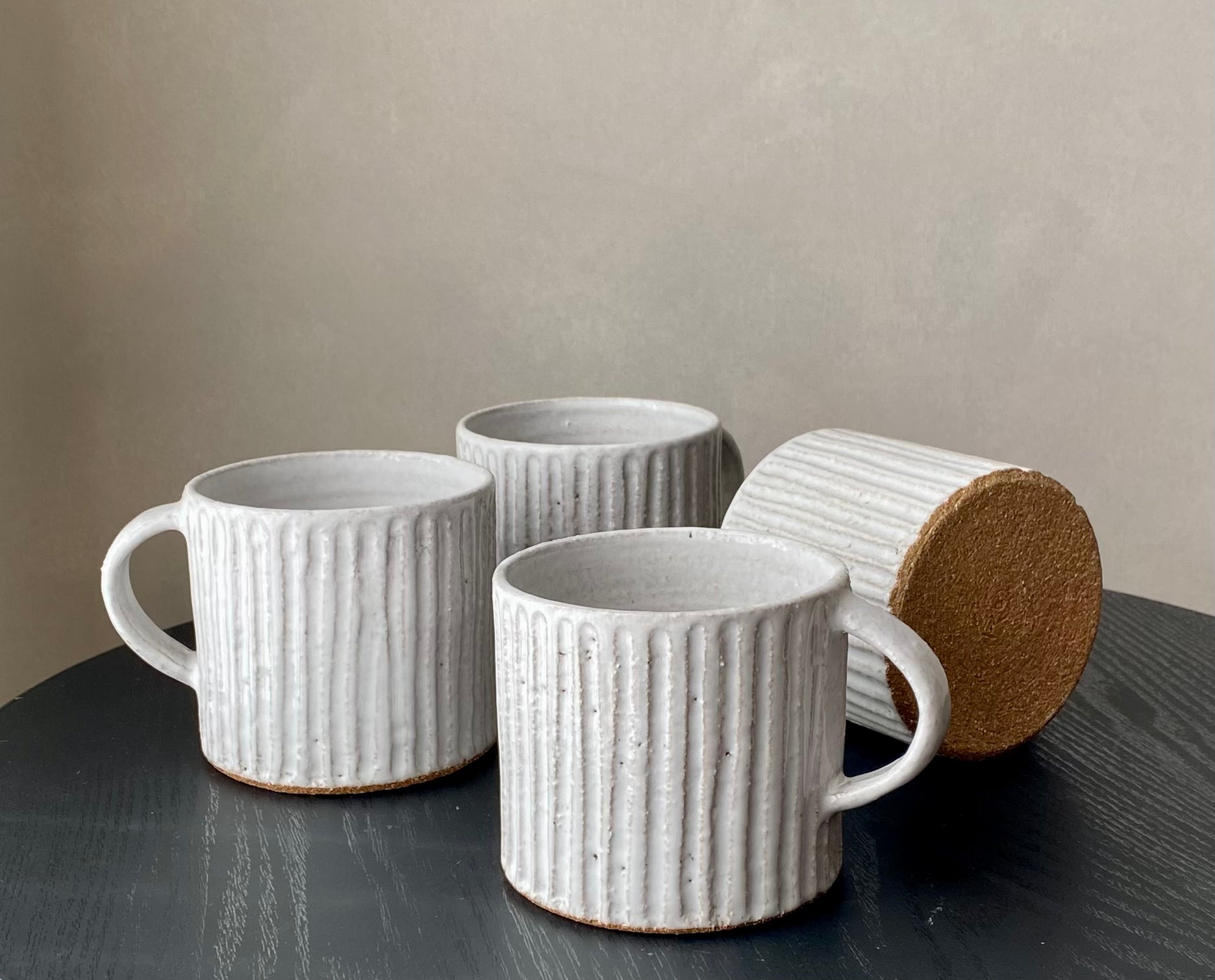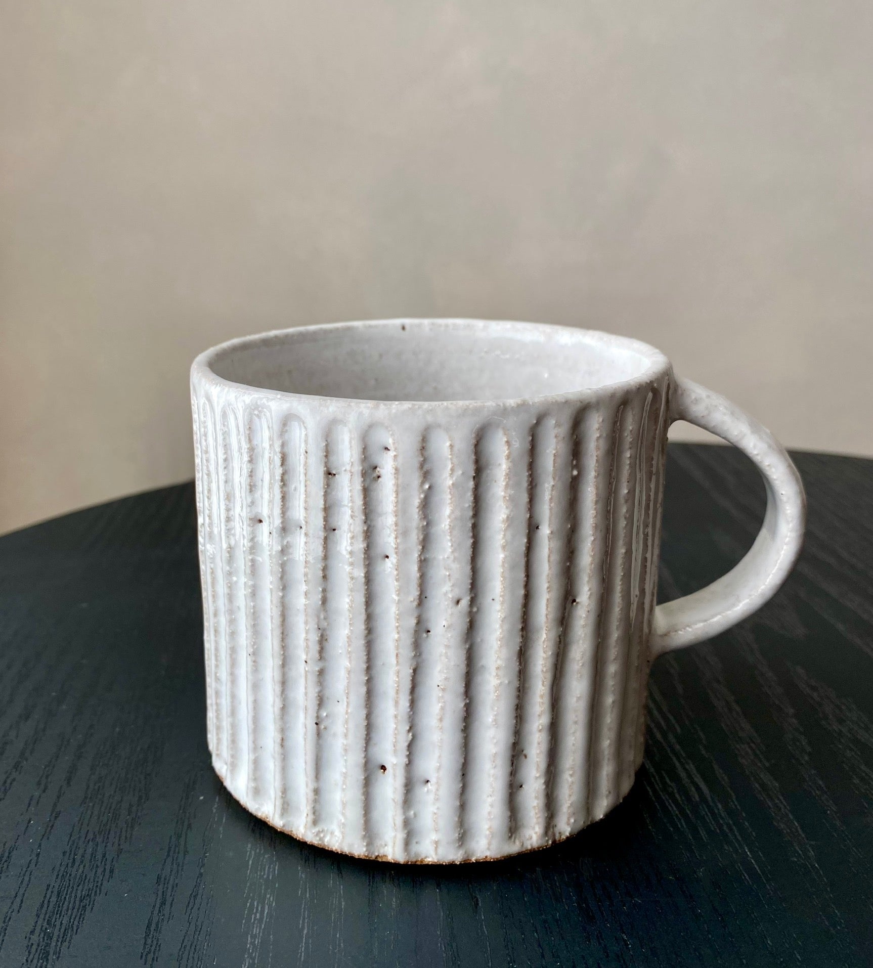 Wheel formed in textured stoneware with a glossy white glaze and handcarved fluting.