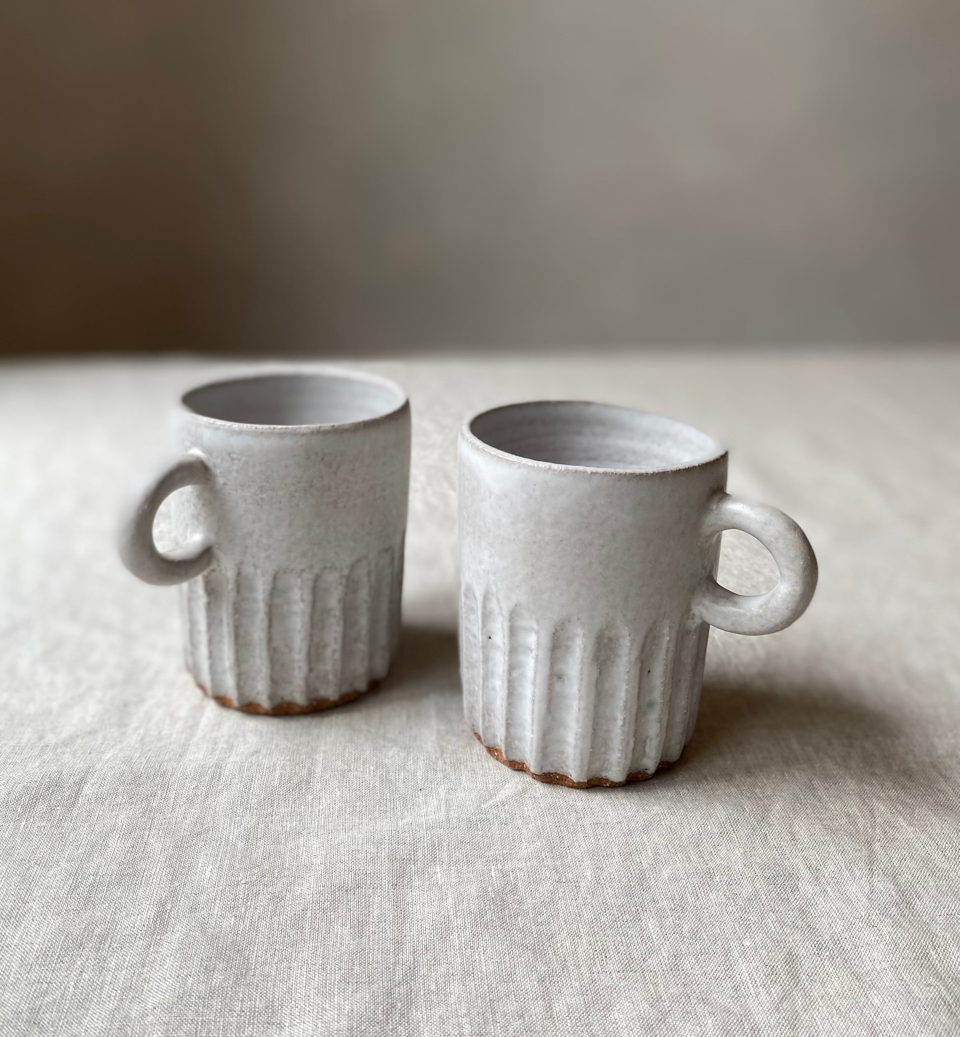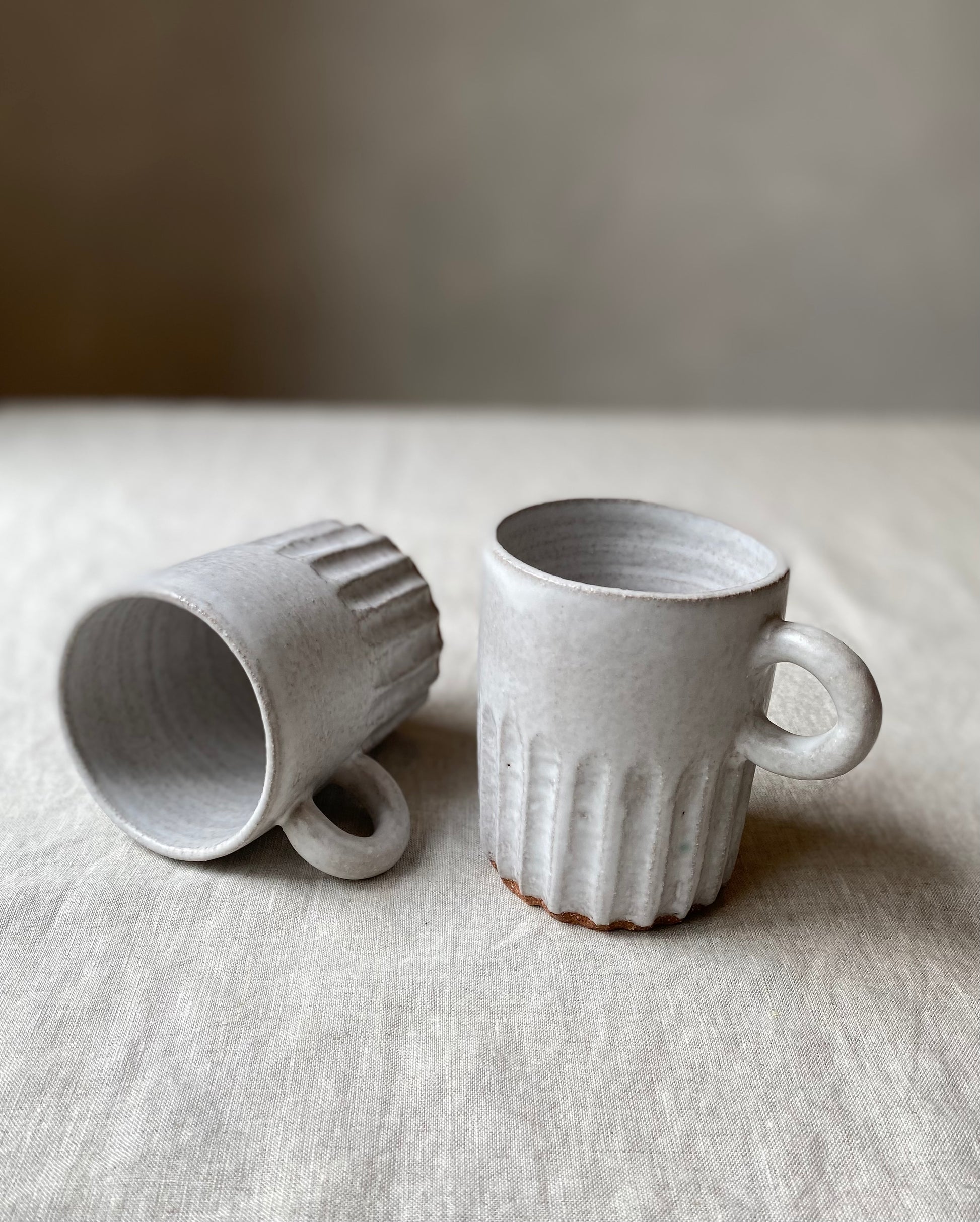 Wheel formed in textured stoneware with matte white glaze and fluted base.