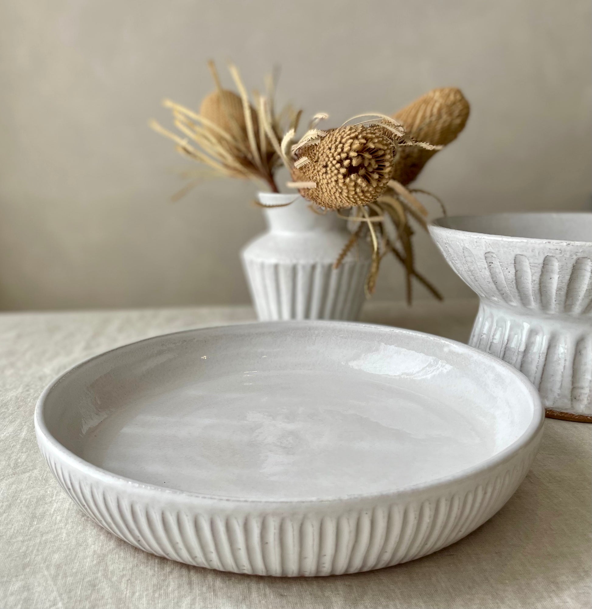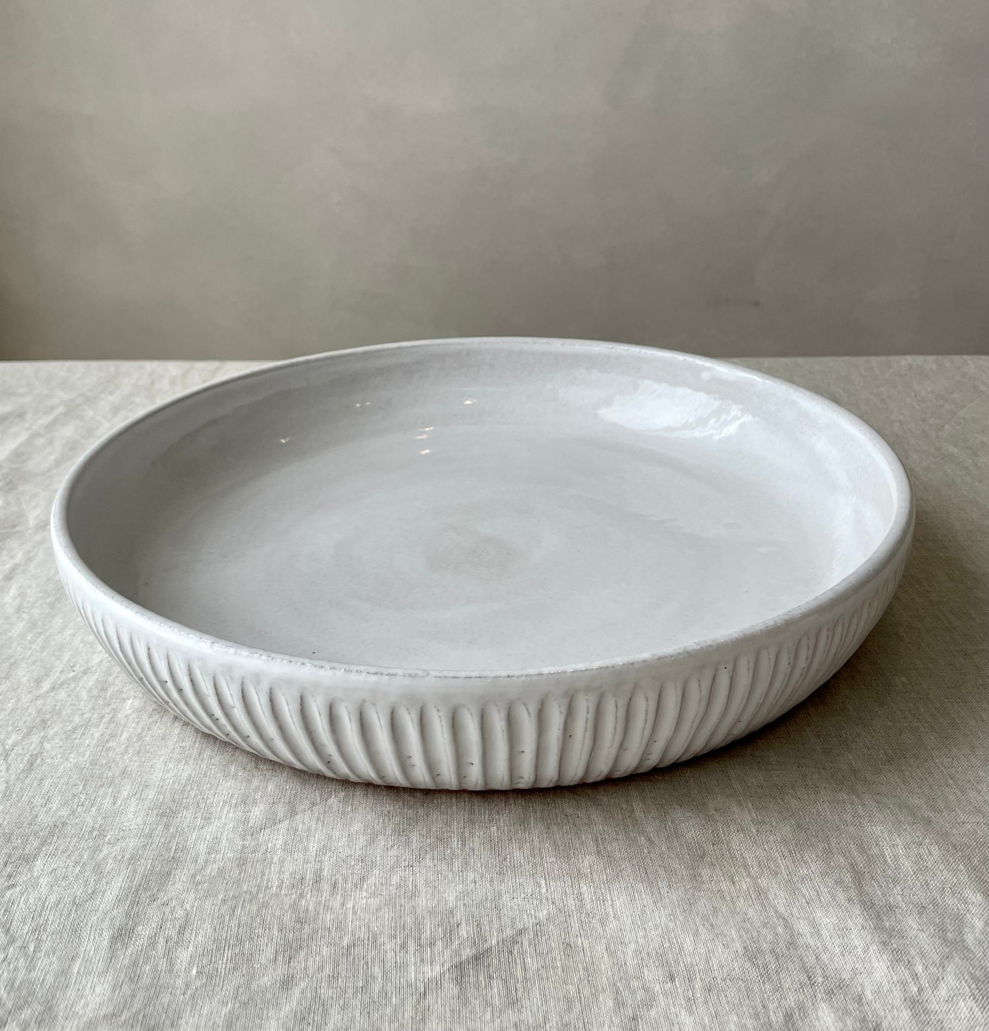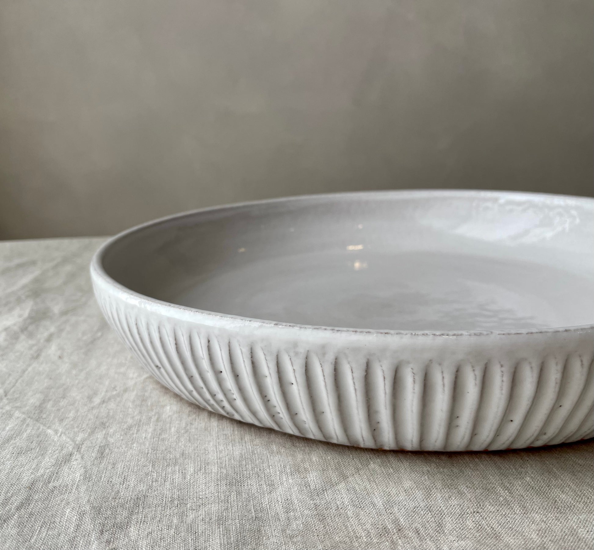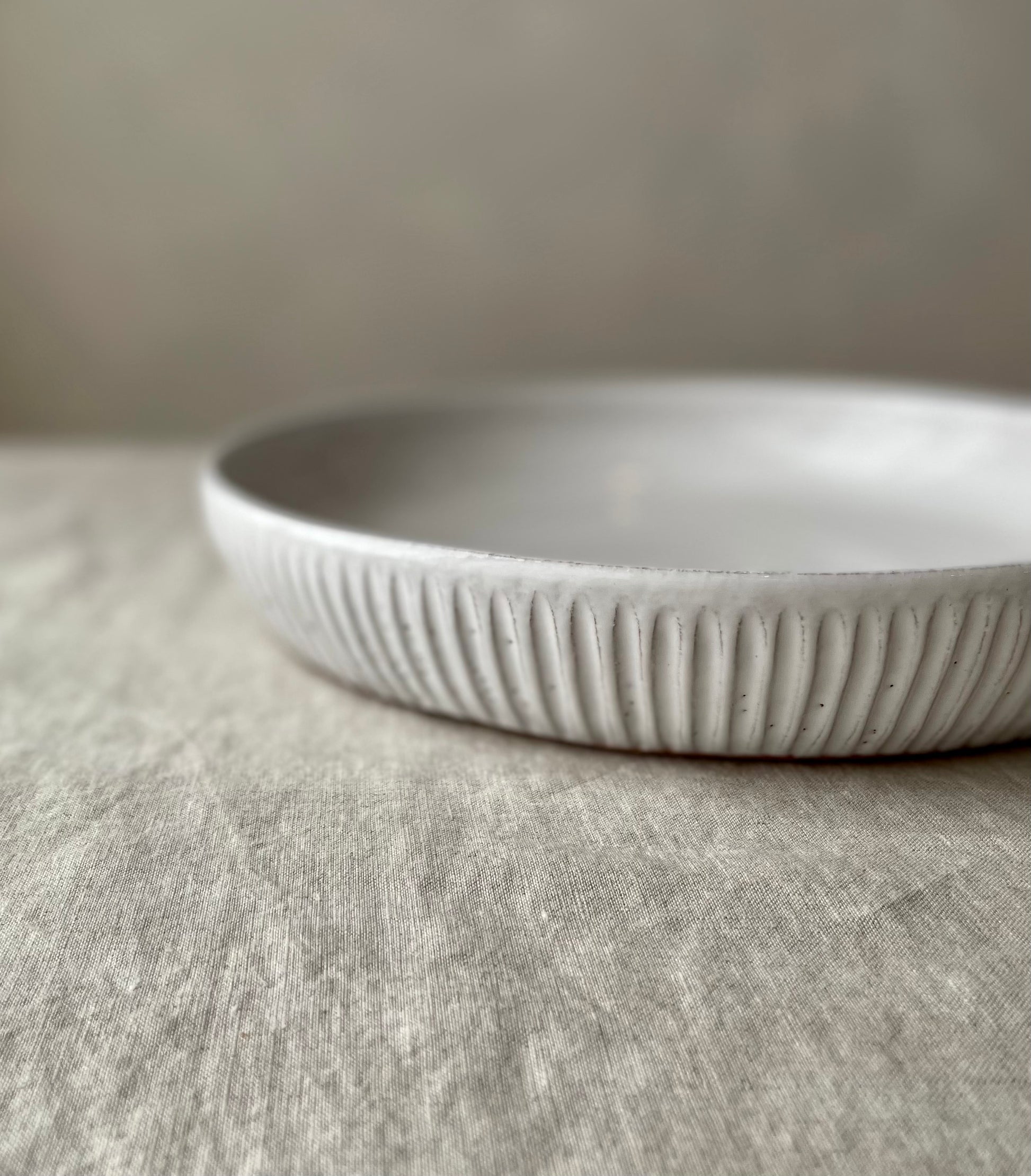 Textured stoneware with gloss white glaze. Hand carved fluting.