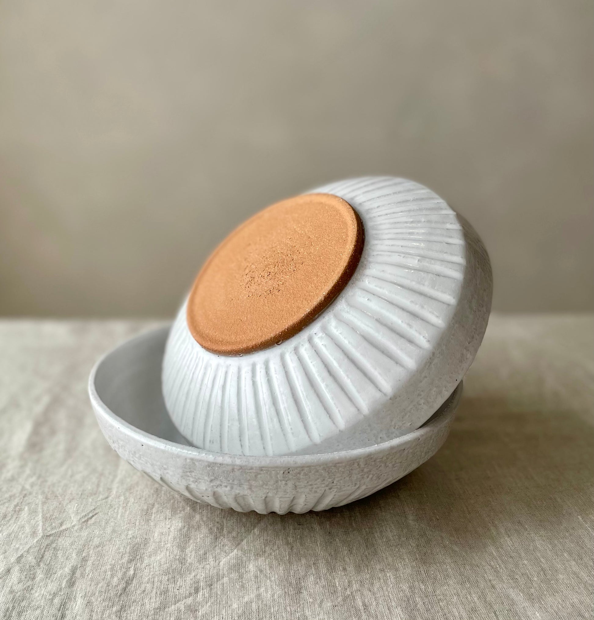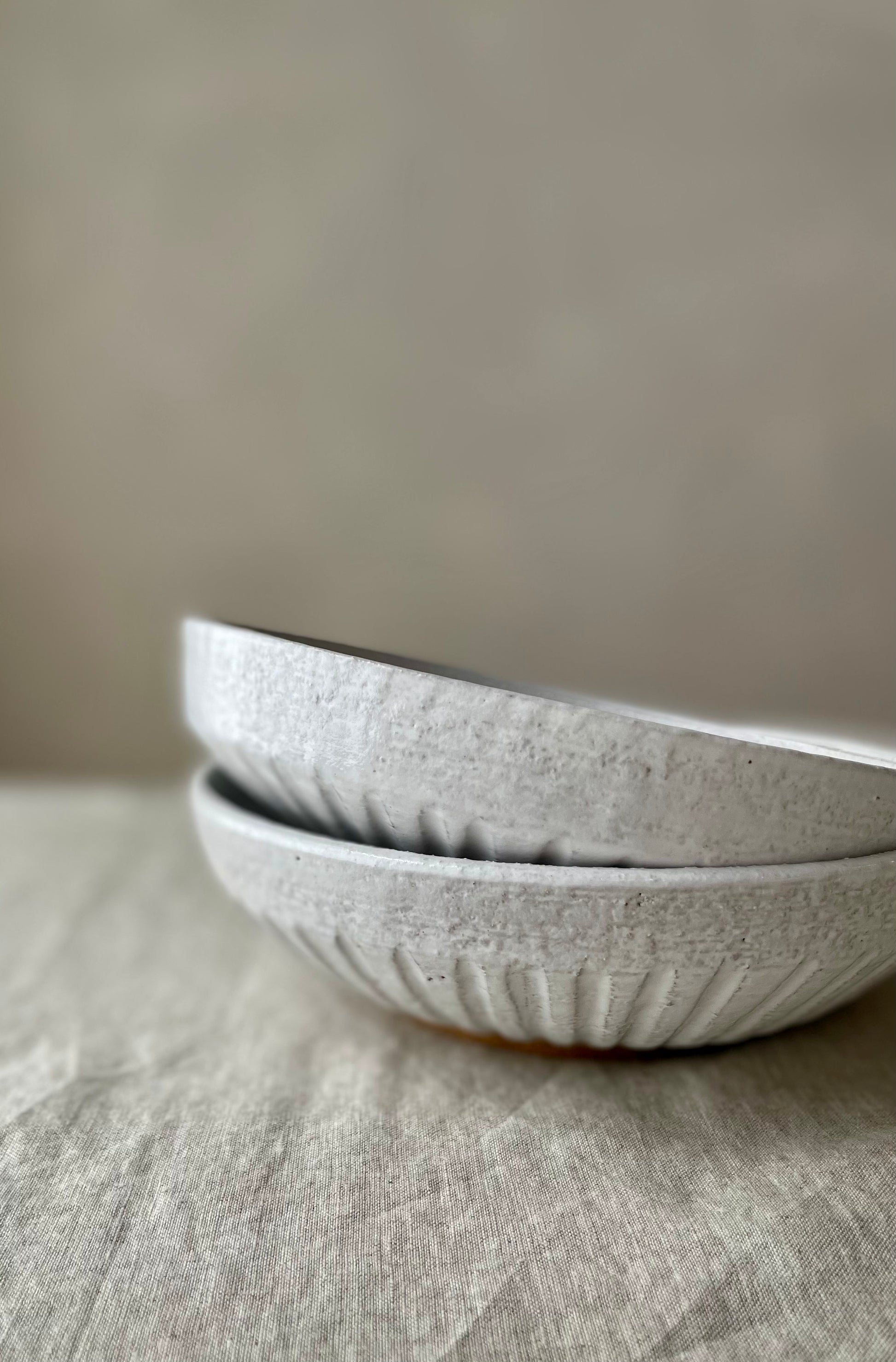 Wheel formed textured stoneware with matte white glaze and hand carved fluting on external surface