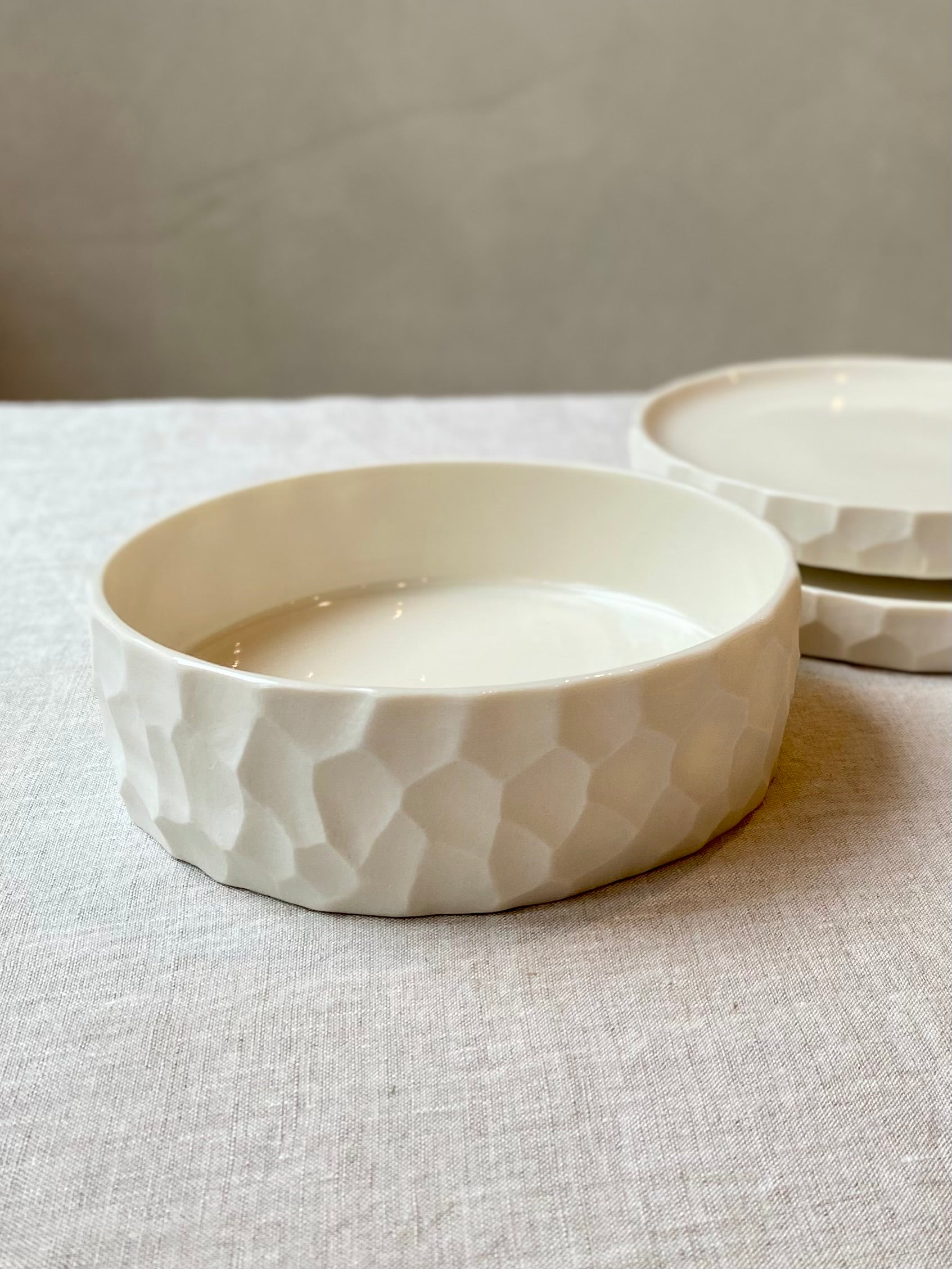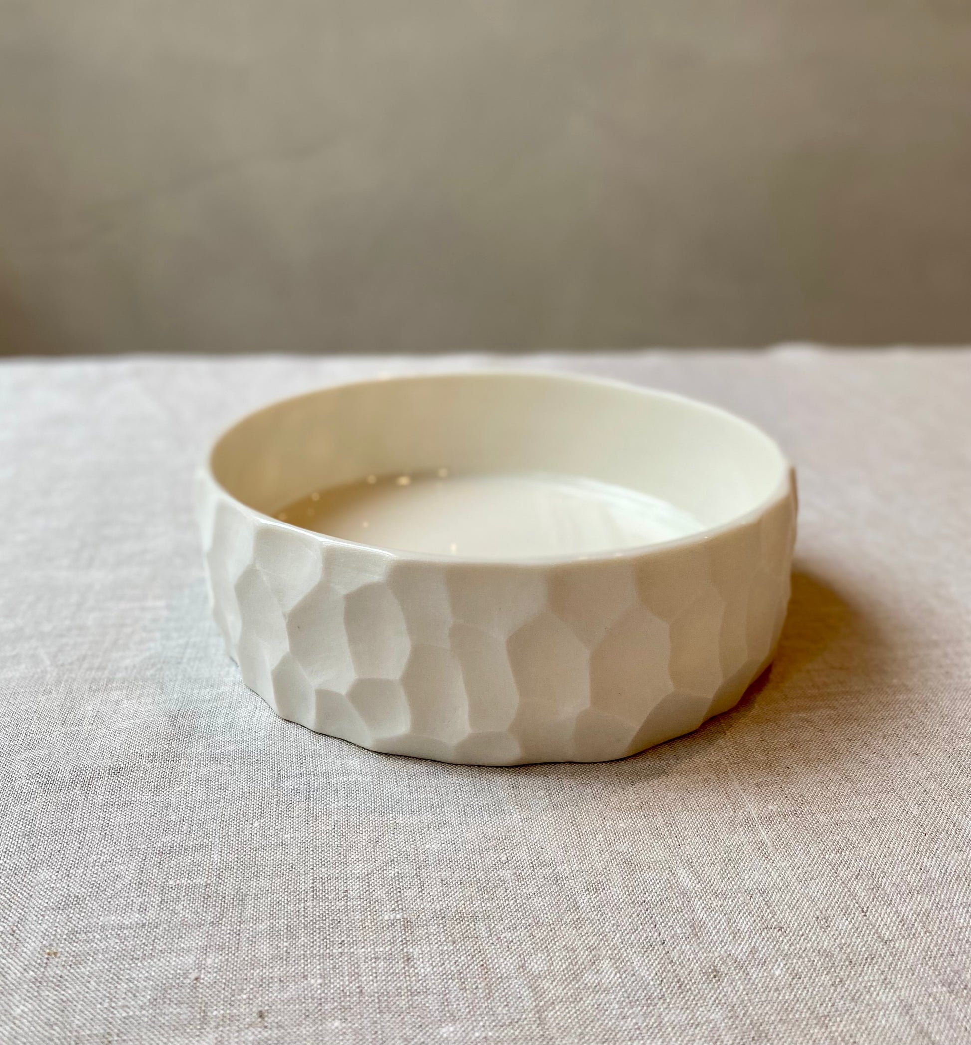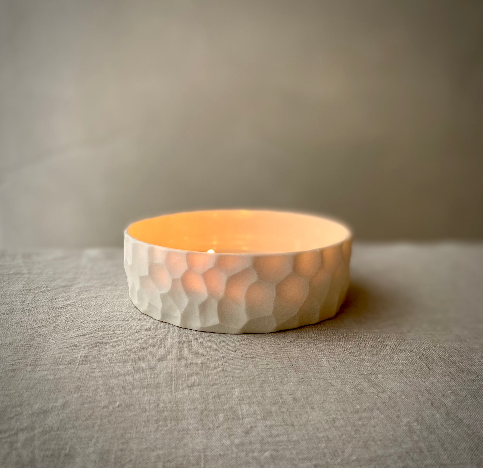 Wheel formed porcelain with a clear gloss glaze and hand carved faceted surface.