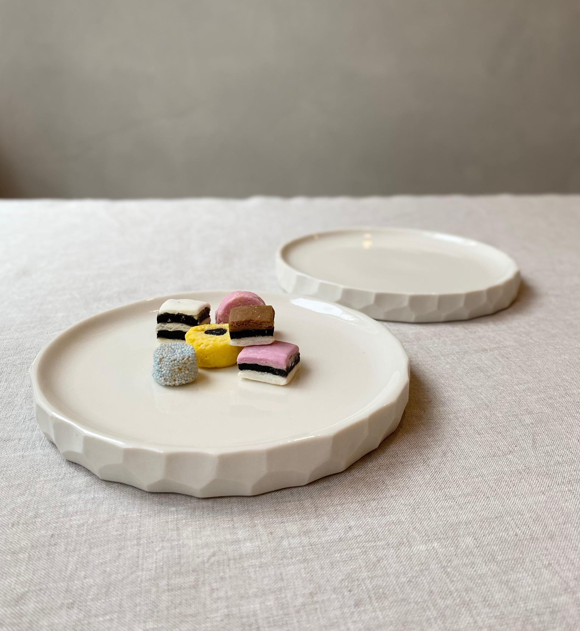 Wheel formed porcelain with a clear gloss glaze and hand carved faceted surface.