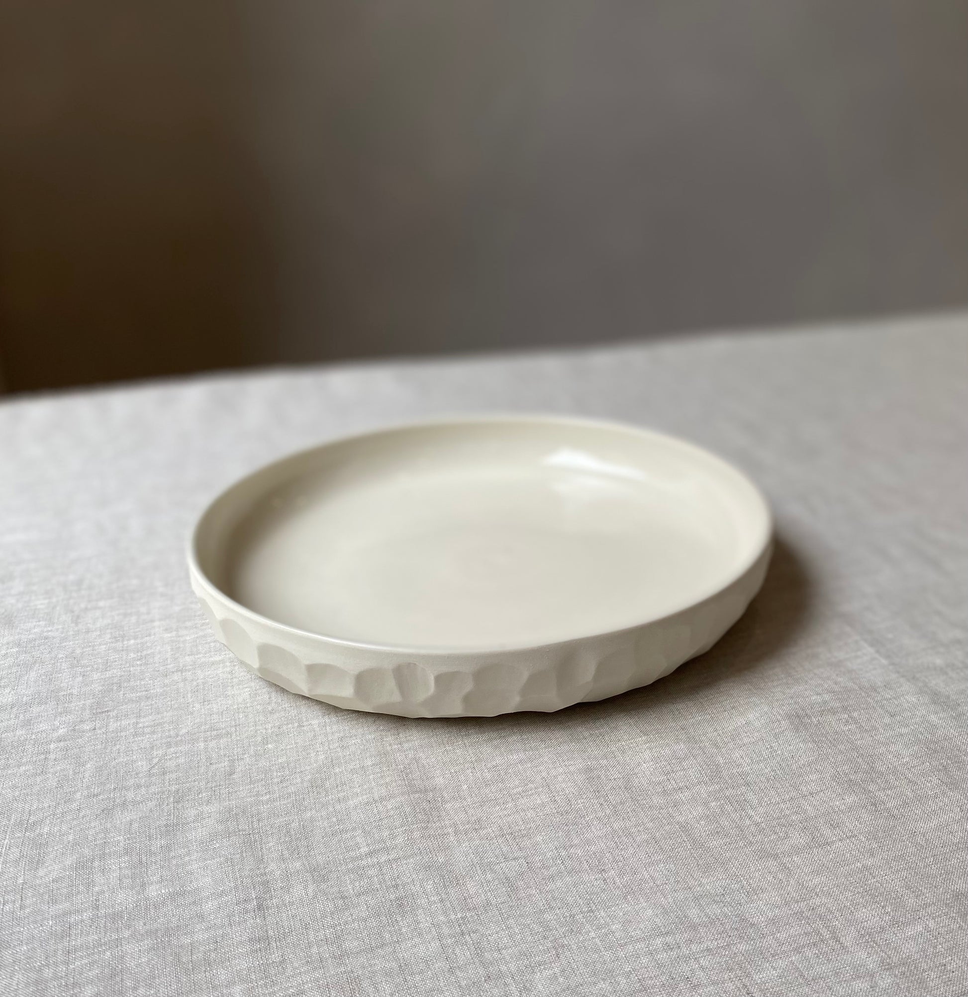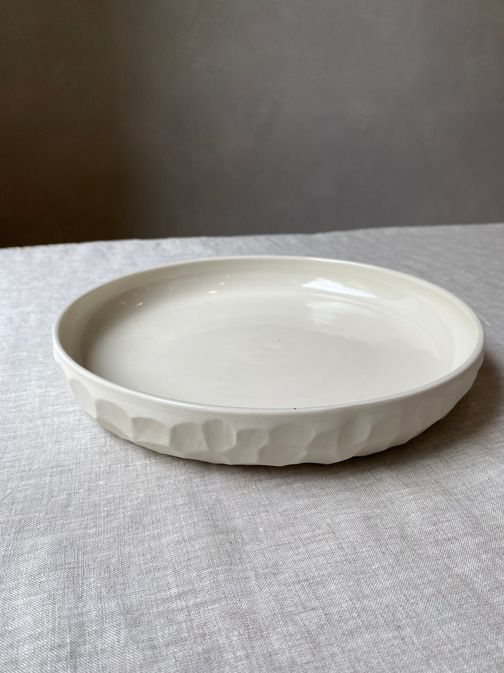 Wheel formed white stoneware with gloss white glaze and hand carved faceted surface.