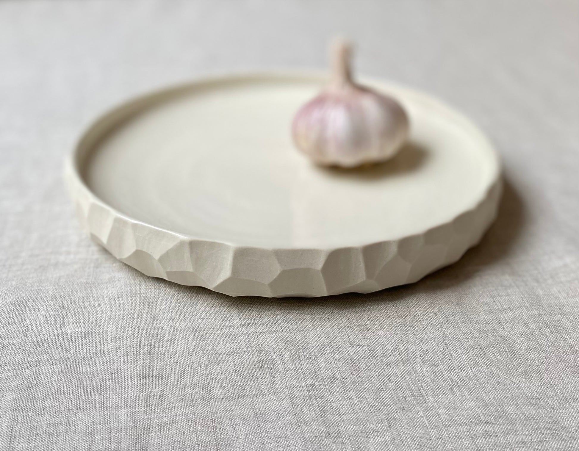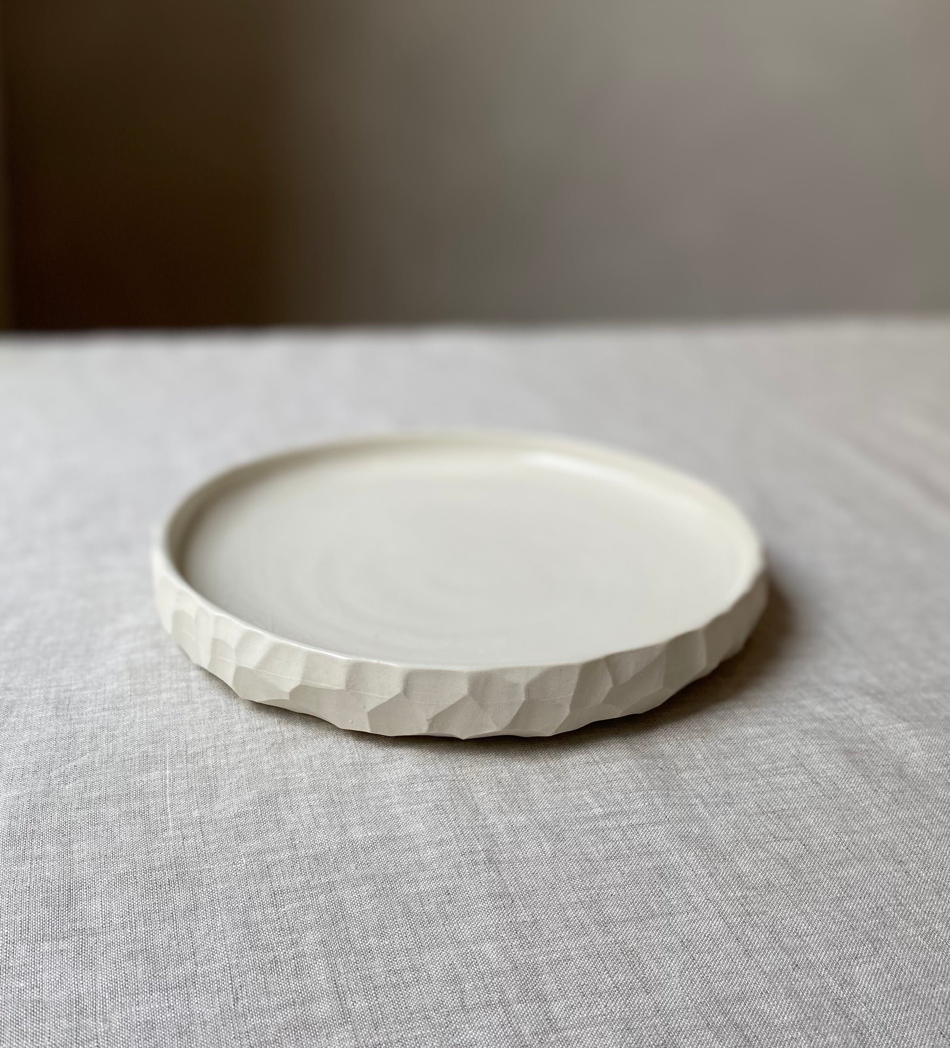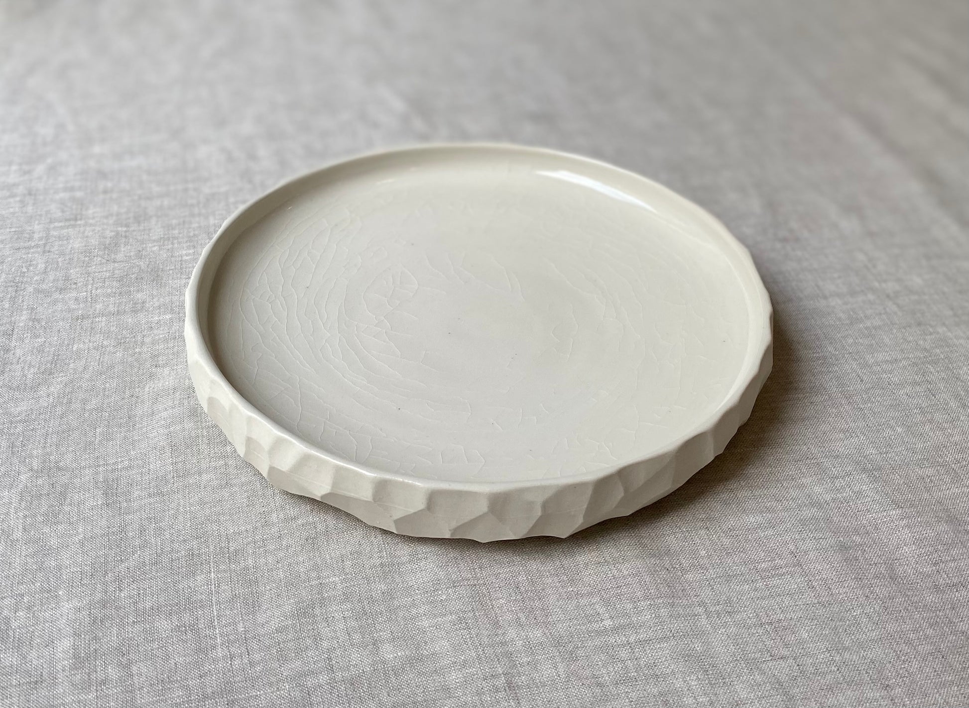 Wheel formed white stoneware with clear gloss crackle glaze and hand carved faceted surface.