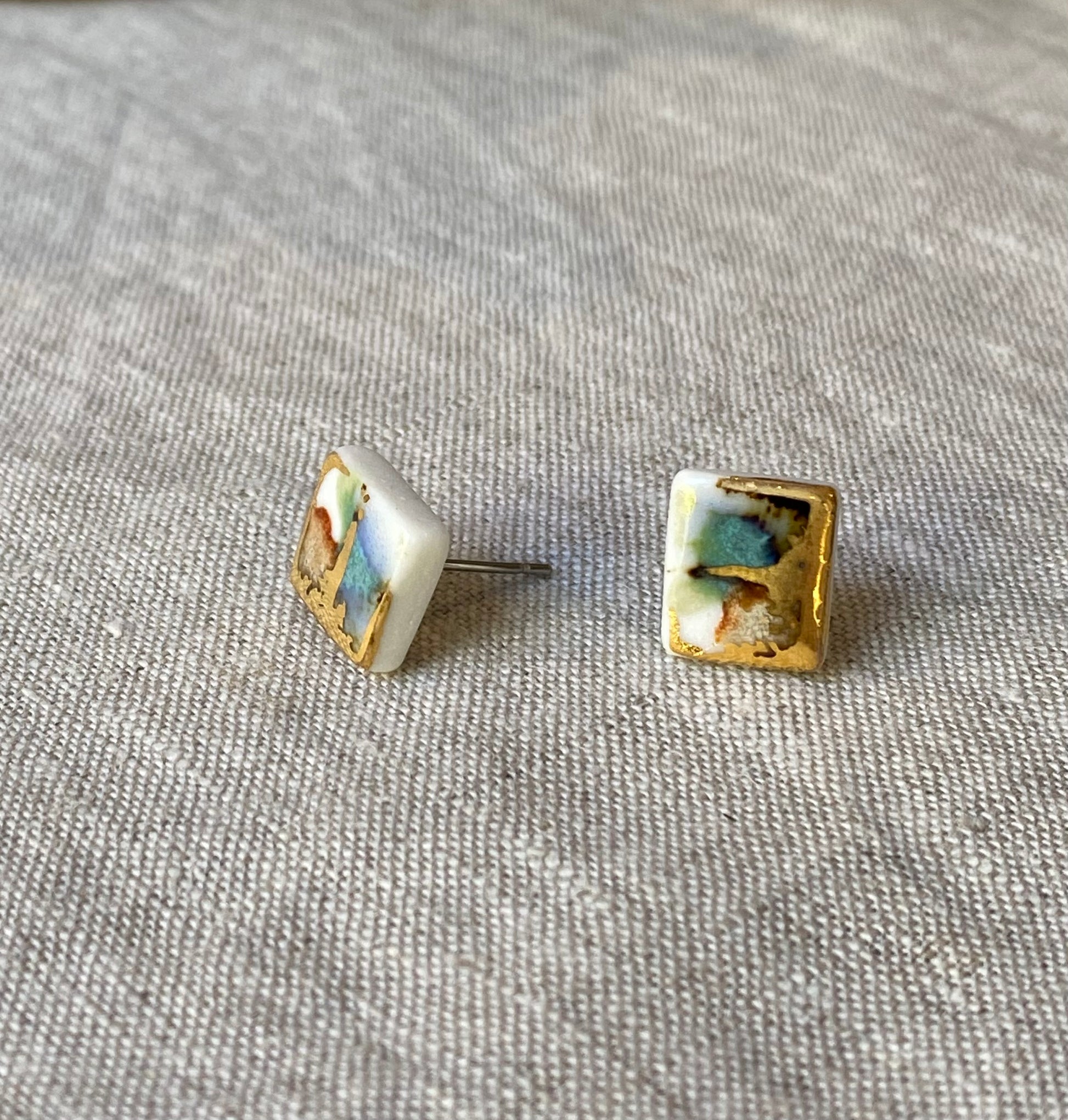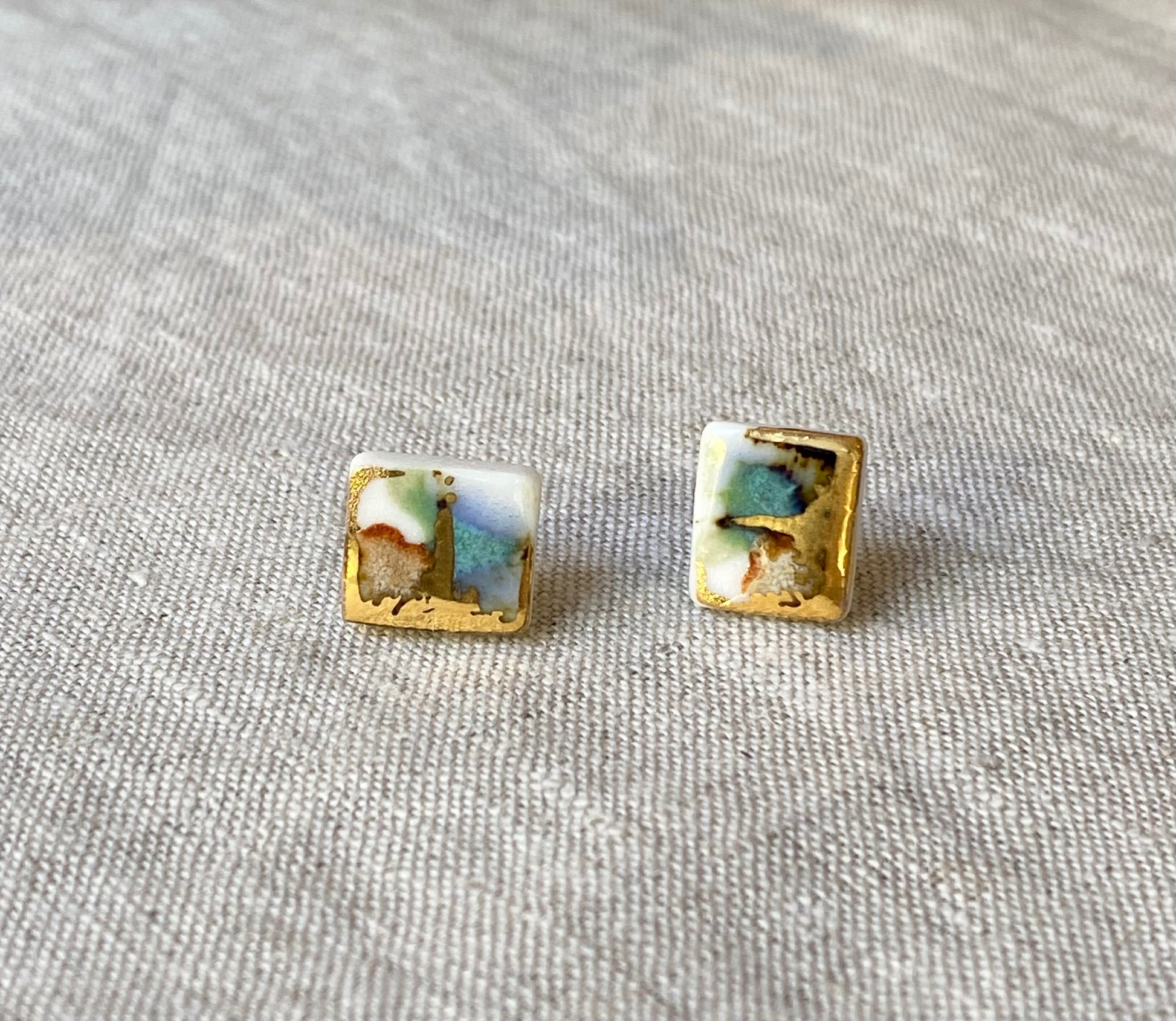 Australian porcelain, blue and turquoise glaze with rust accent and gold lustre.