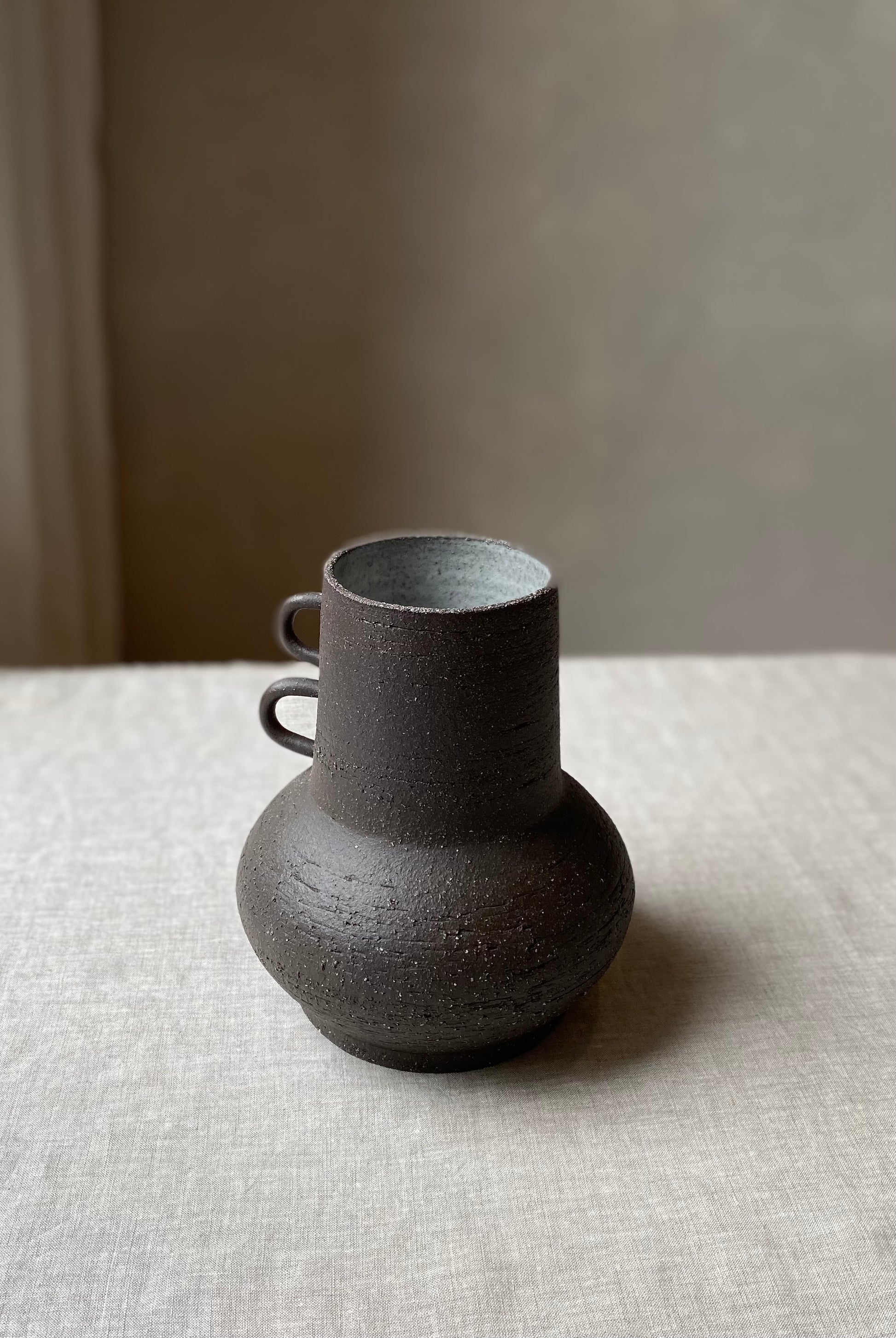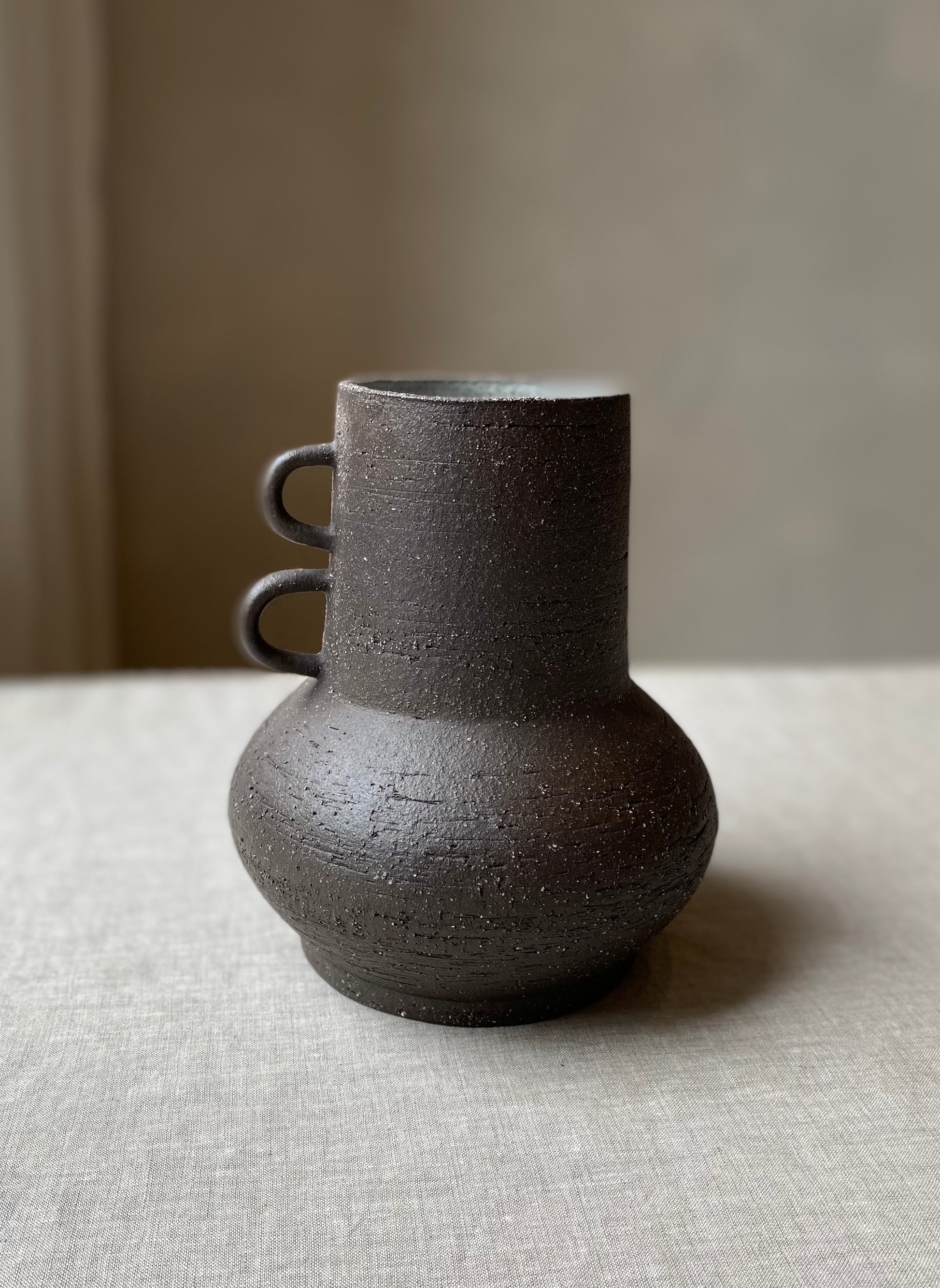 Wheel formed textured black stoneware, unglazed exterior with matte white glaze on the interior and hand formed 'loop' decoration