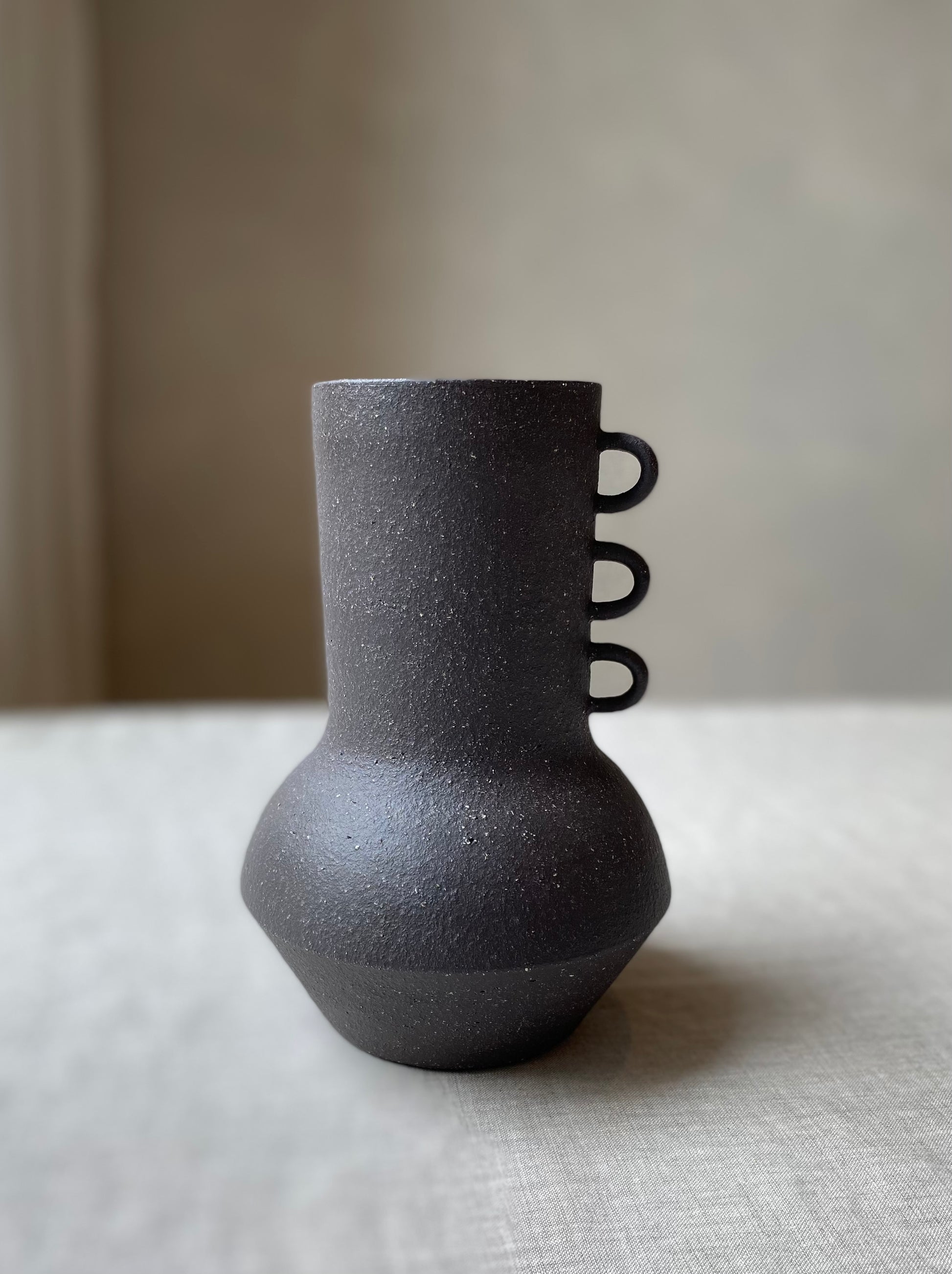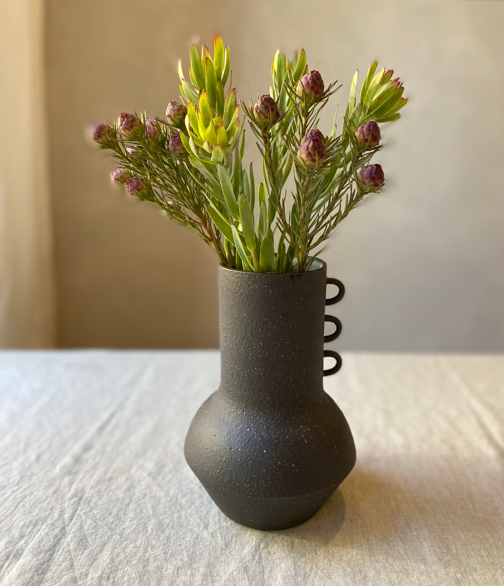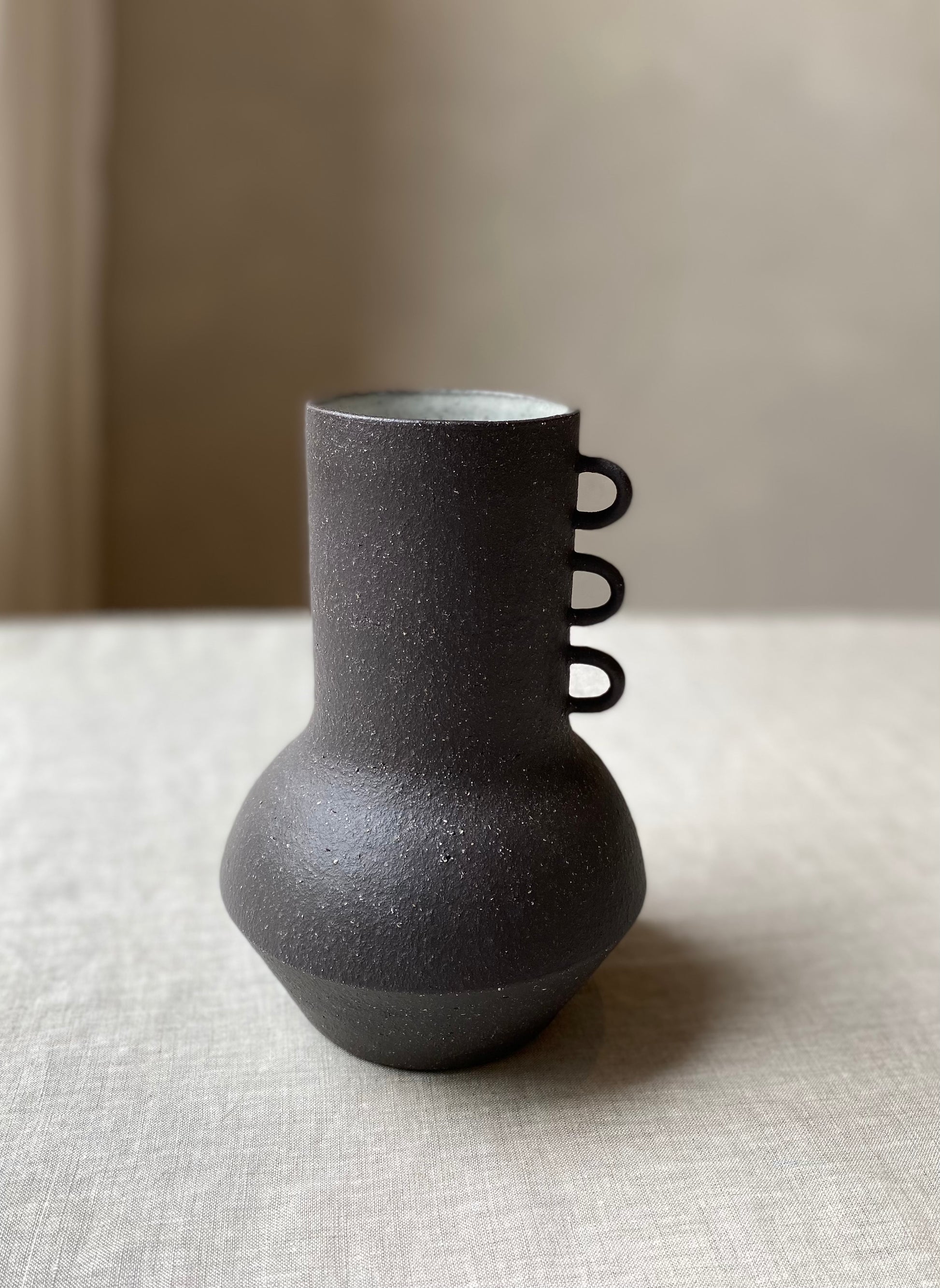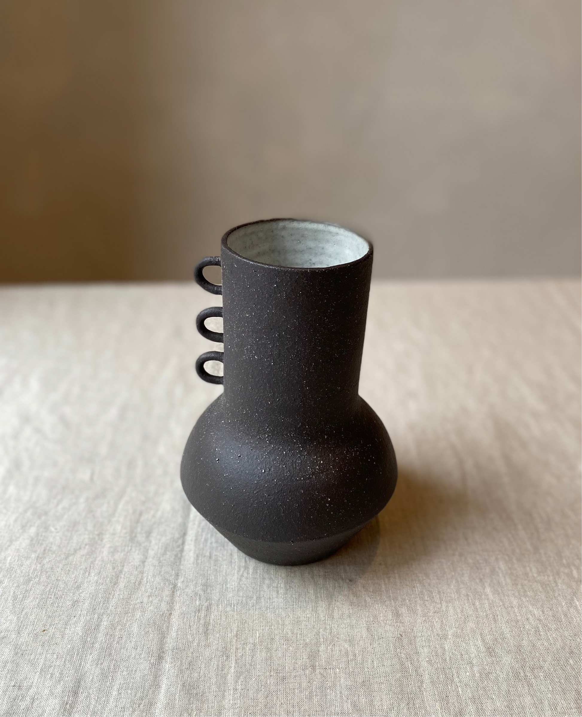 Wheel formed textured black stoneware, unglazed exterior with matte white glaze on the interior and hand formed 'loop' decoration