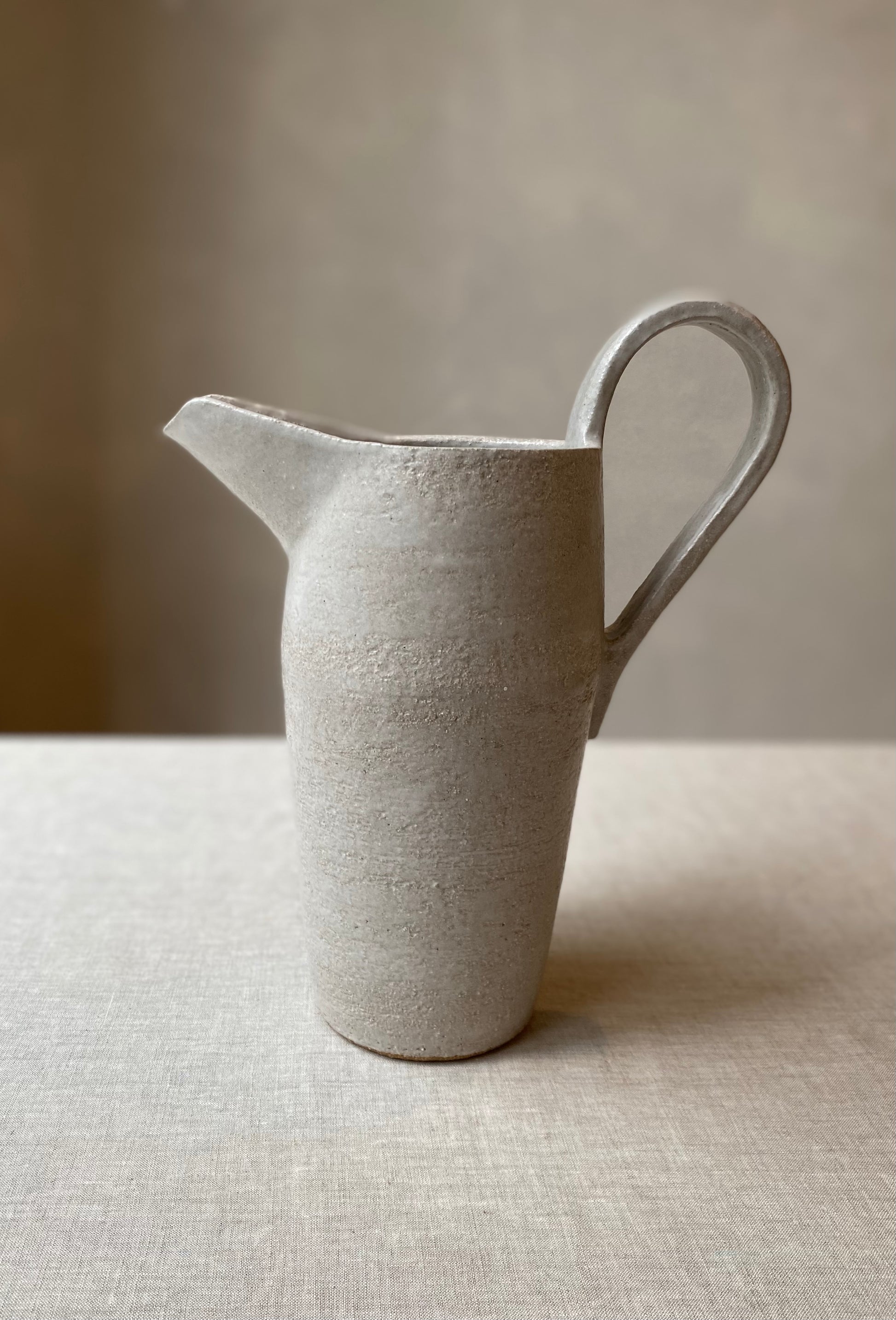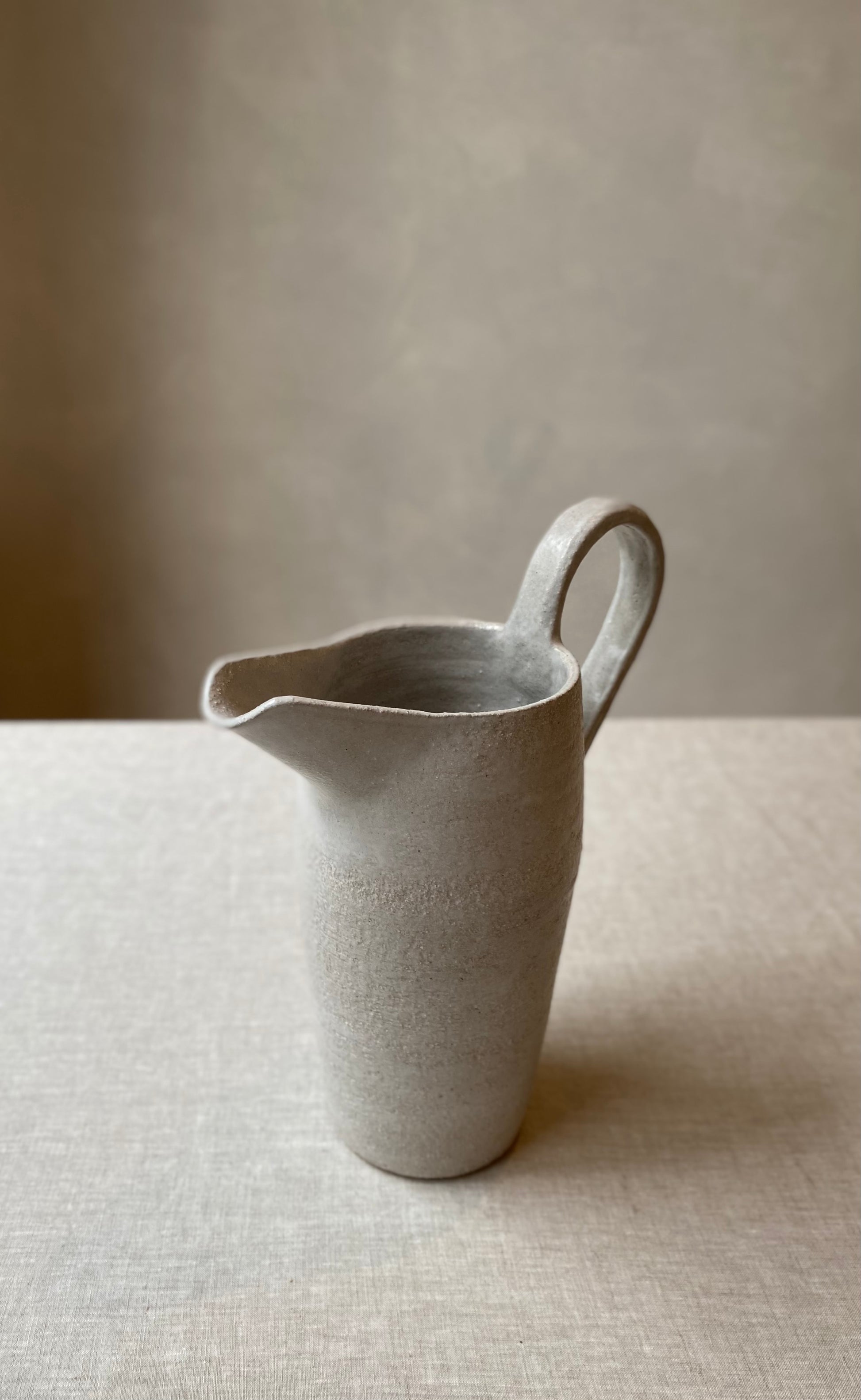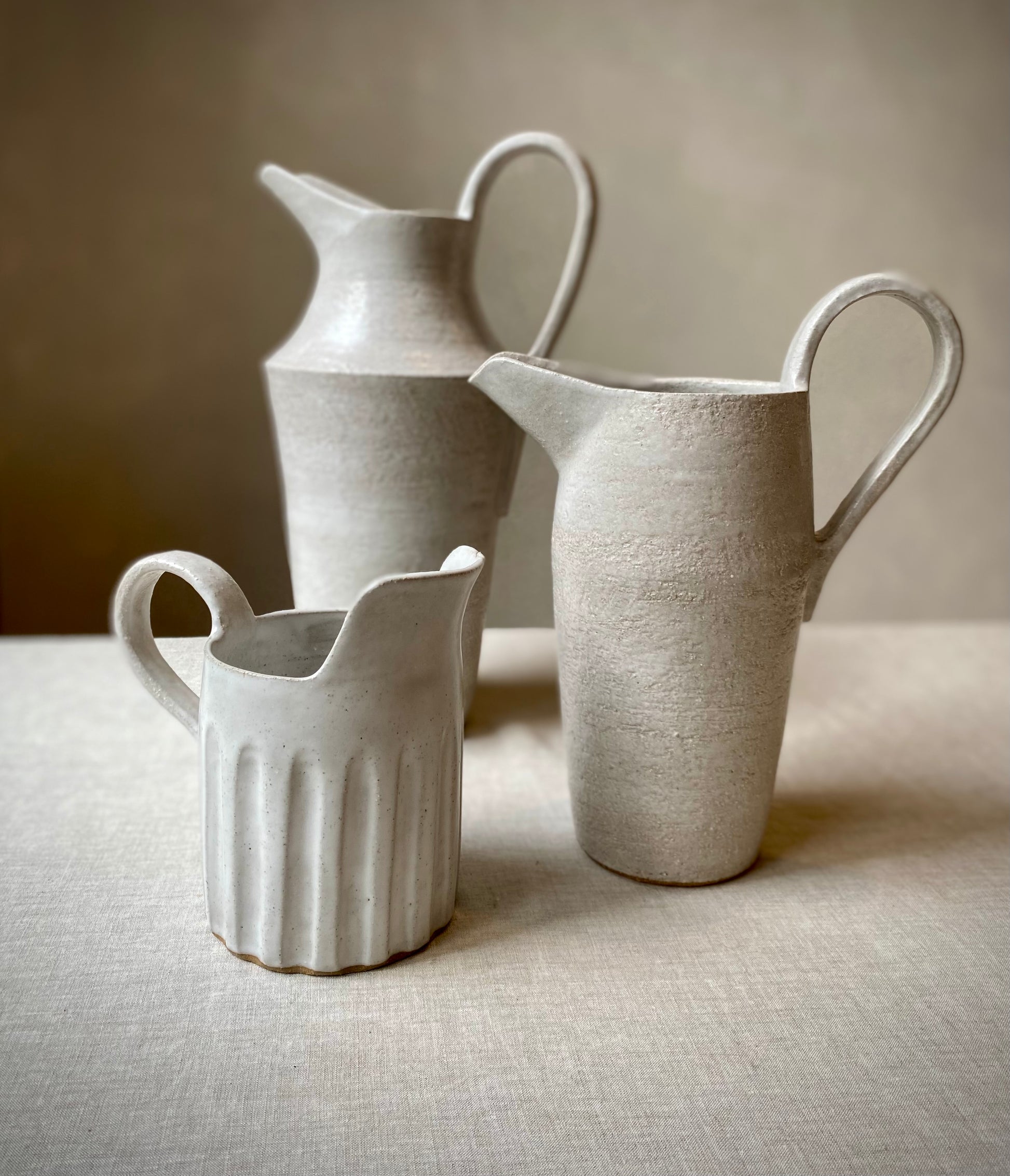 Wheel and hand formed jug in textured stoneware with a matt white glaze.