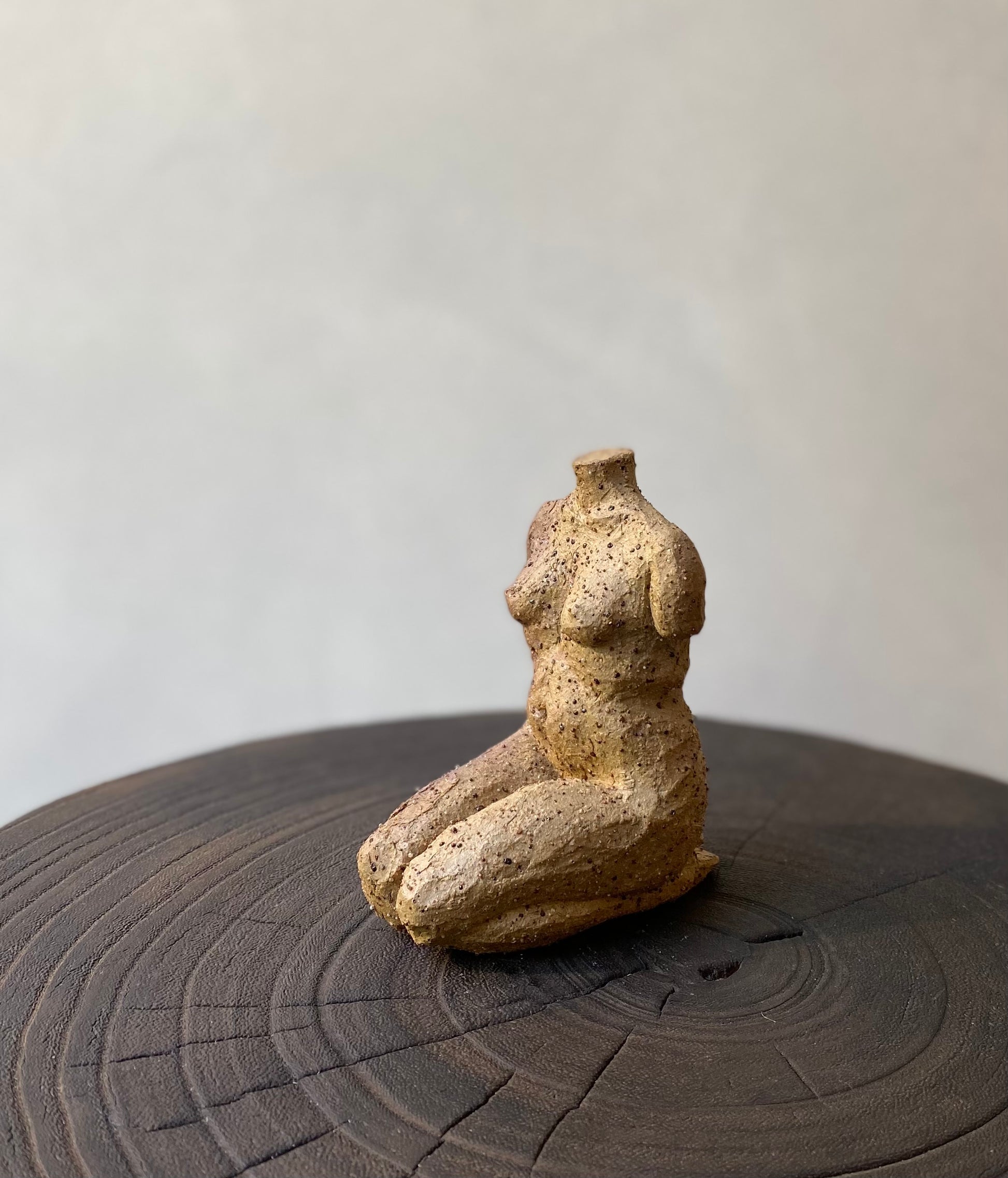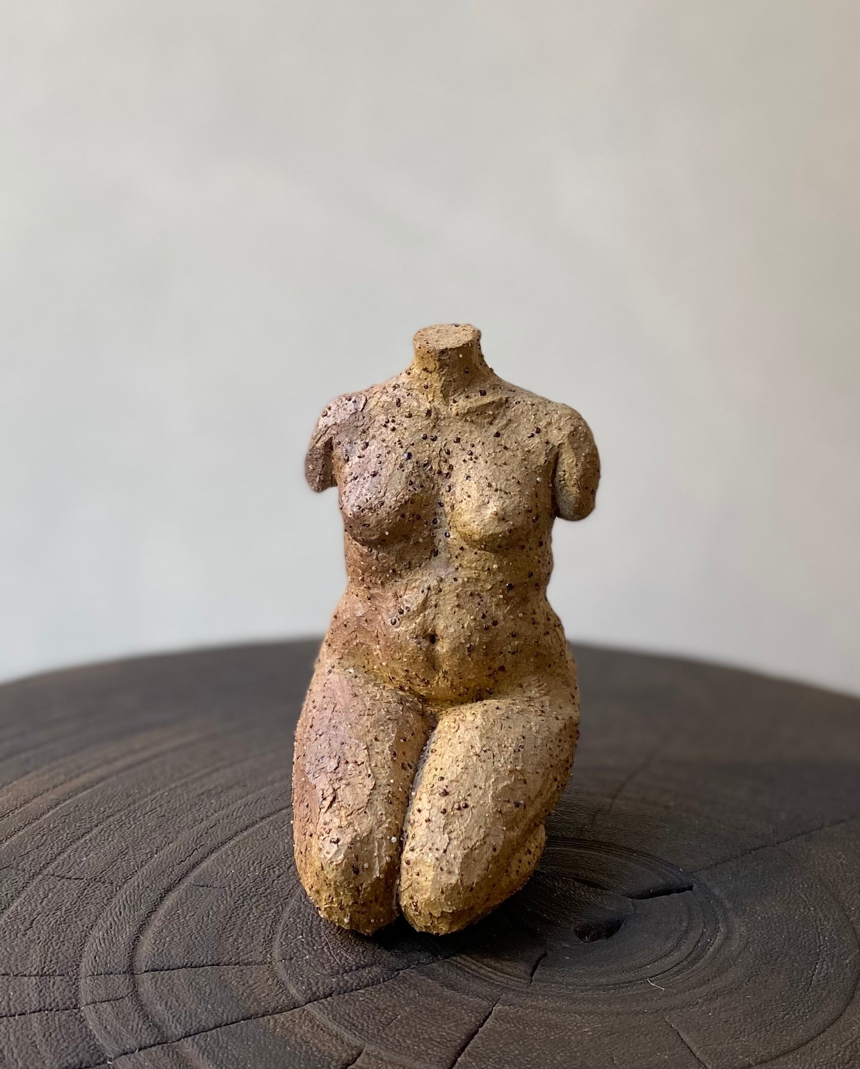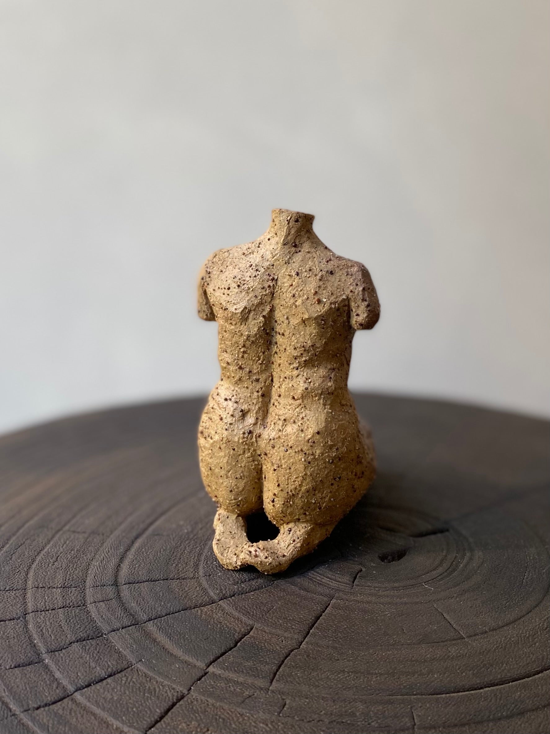 Hand formed in highly textured stoneware, this little nude has a beautiful 'bloom' down her right side. This happens when hotter pockets of air in the kiln are trapped and may be slower to escape, producing colouration on the surface of pieces exposed to the higher temperature. In the case of this little nude, a beautiful chocolate bloom has spanned down one side of her body.