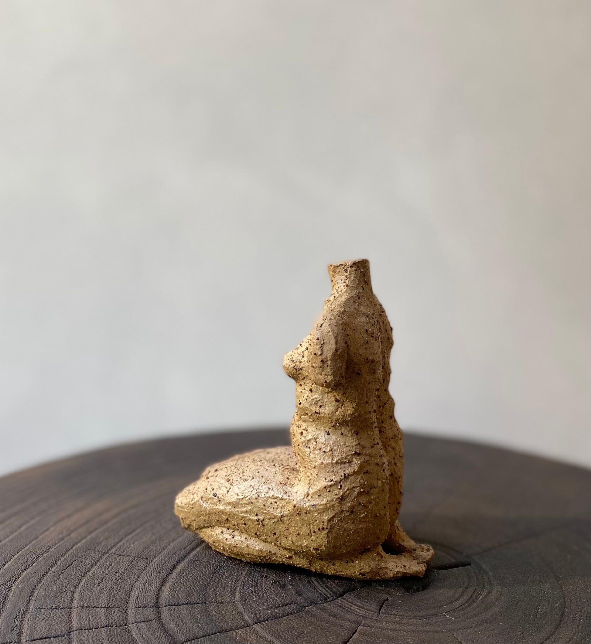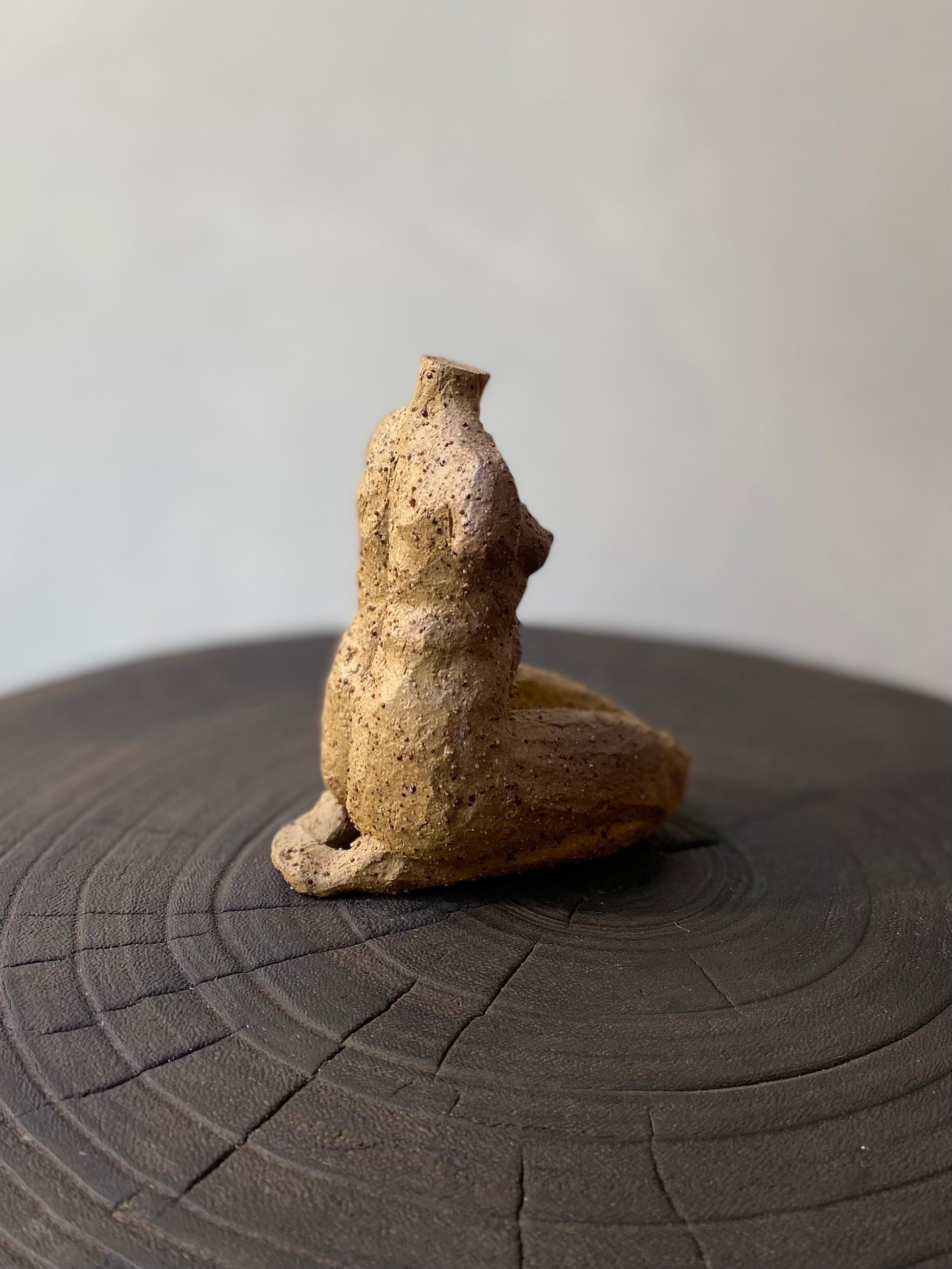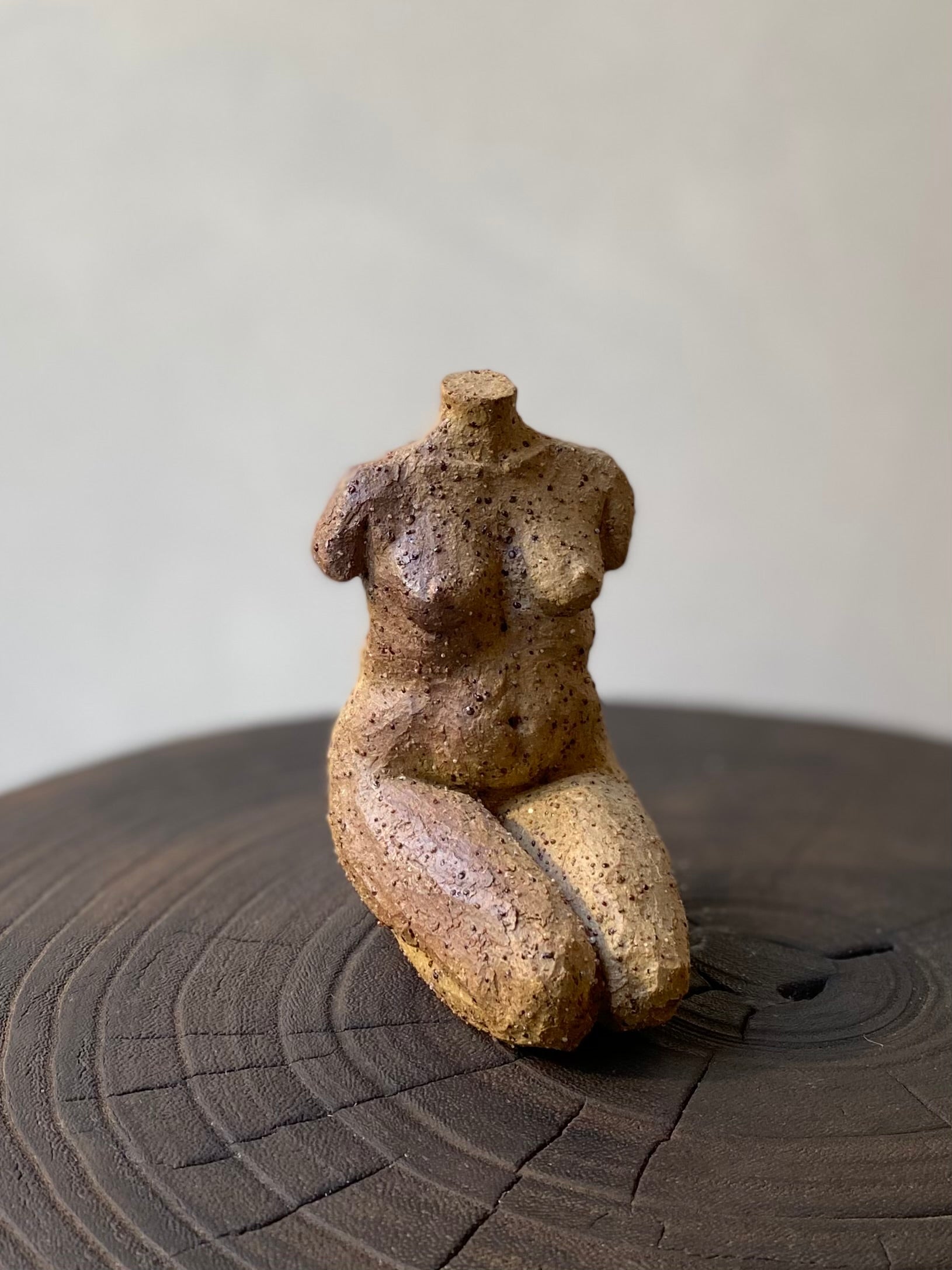 Hand formed in highly textured stoneware, this little nude has a beautiful 'bloom' down her right side. This happens when hotter pockets of air in the kiln are trapped and may be slower to escape, producing colouration on the surface of pieces exposed to the higher temperature. In the case of this little nude, a beautiful chocolate bloom has spanned down one side of her body.