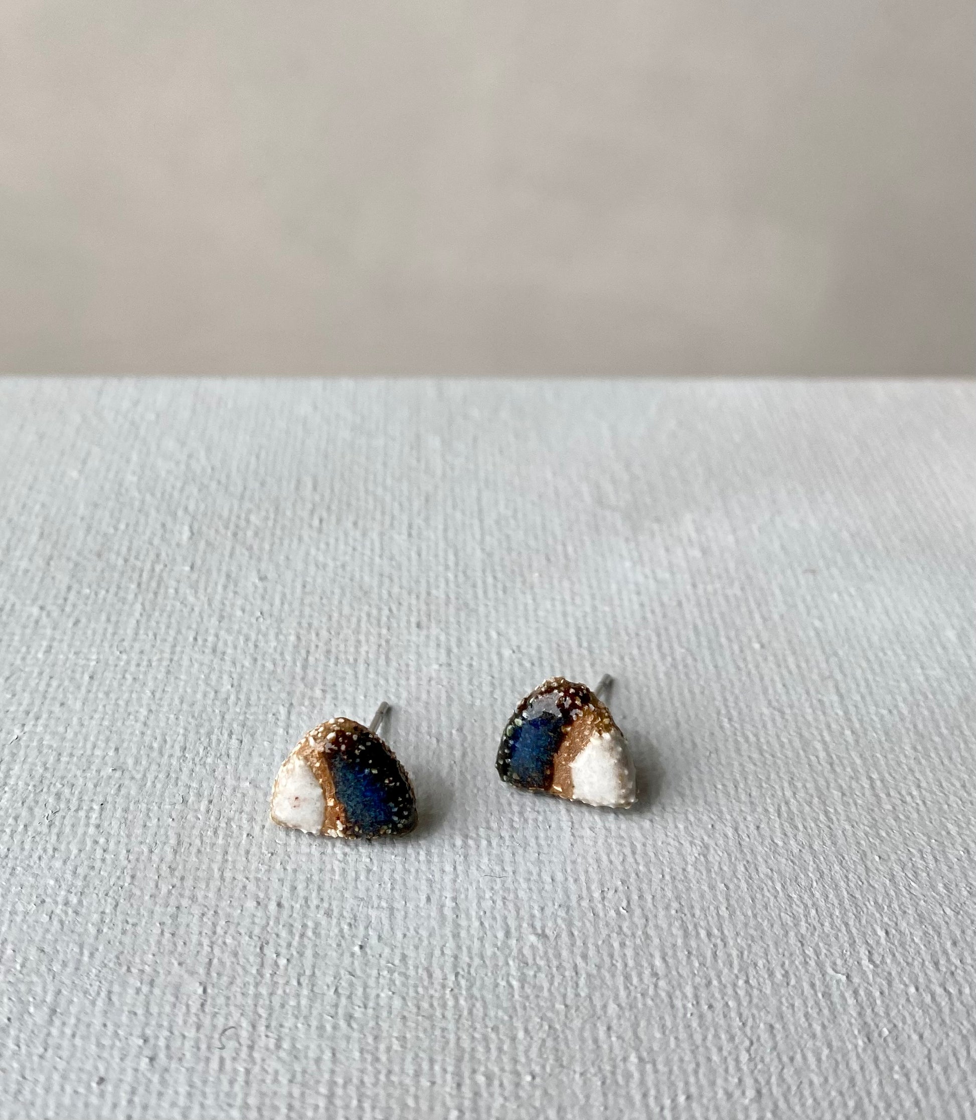 Textured brown speckled stoneware with hand painted deep blue and speckled white glaze.
