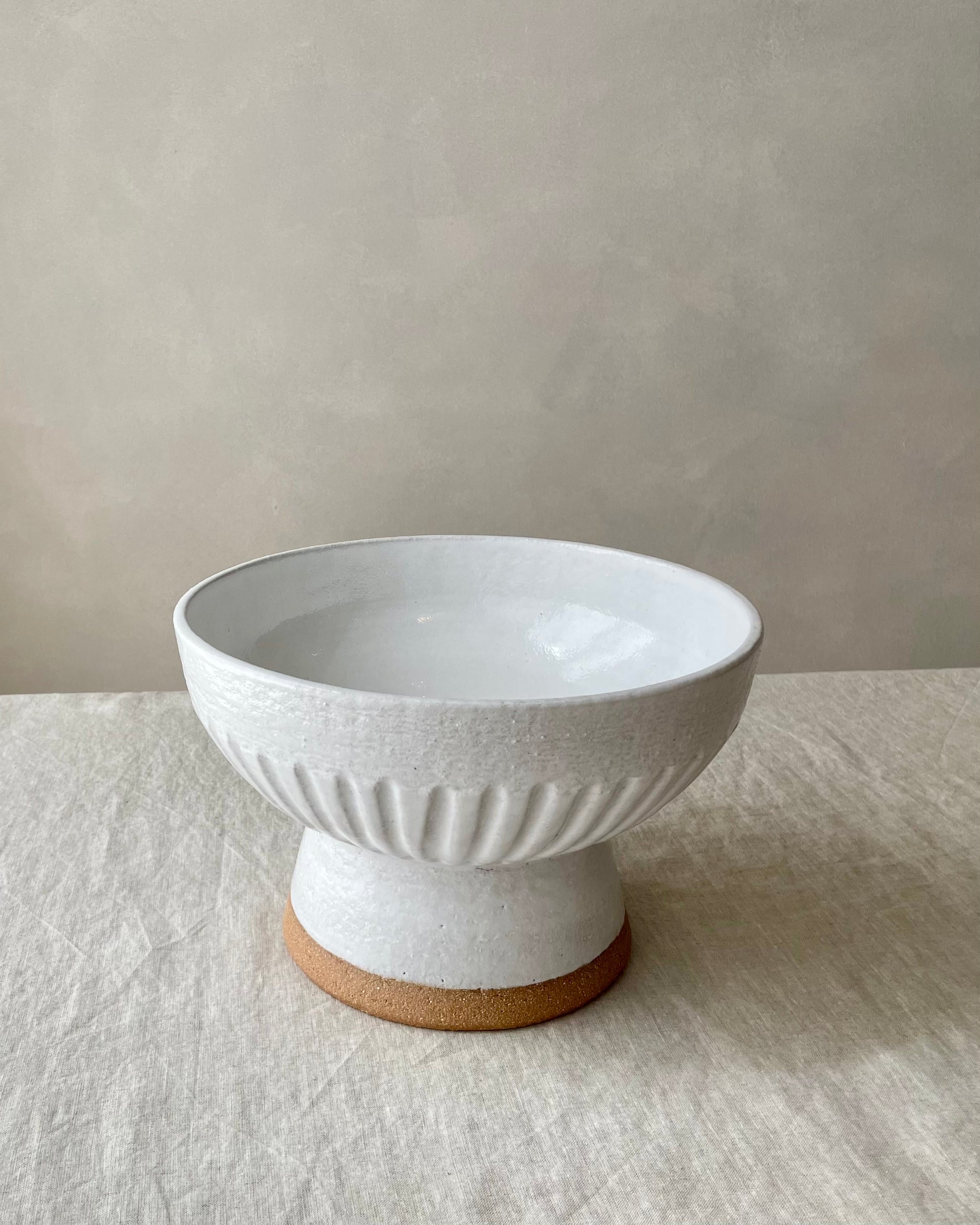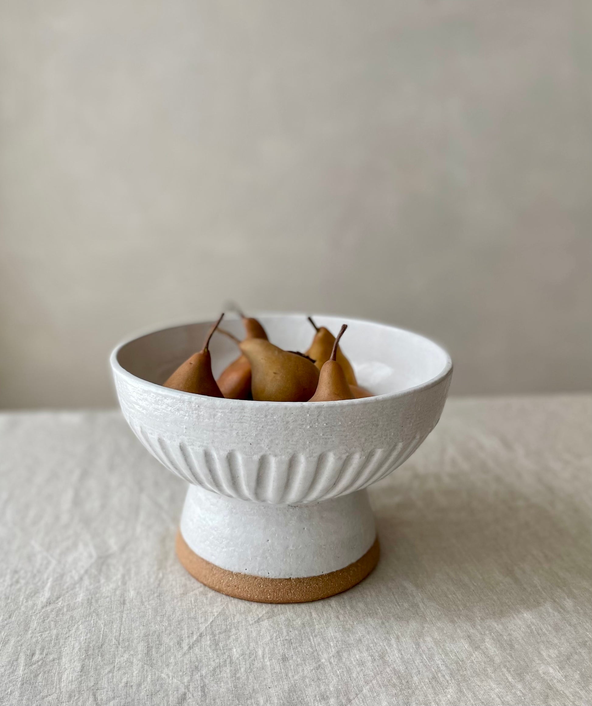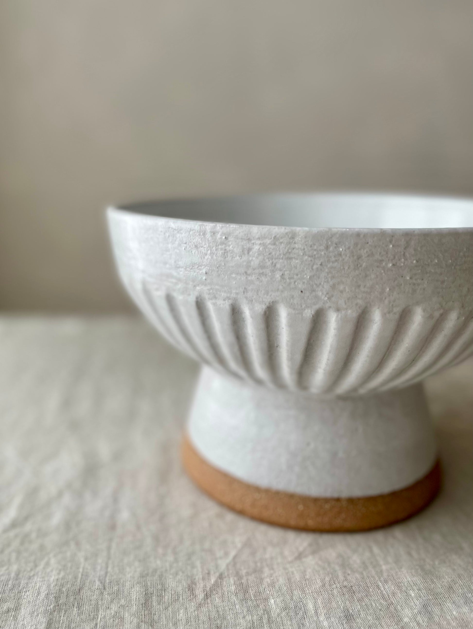 Wheel formed textured stoneware with matte white glaze and hand carved fluting on external surface