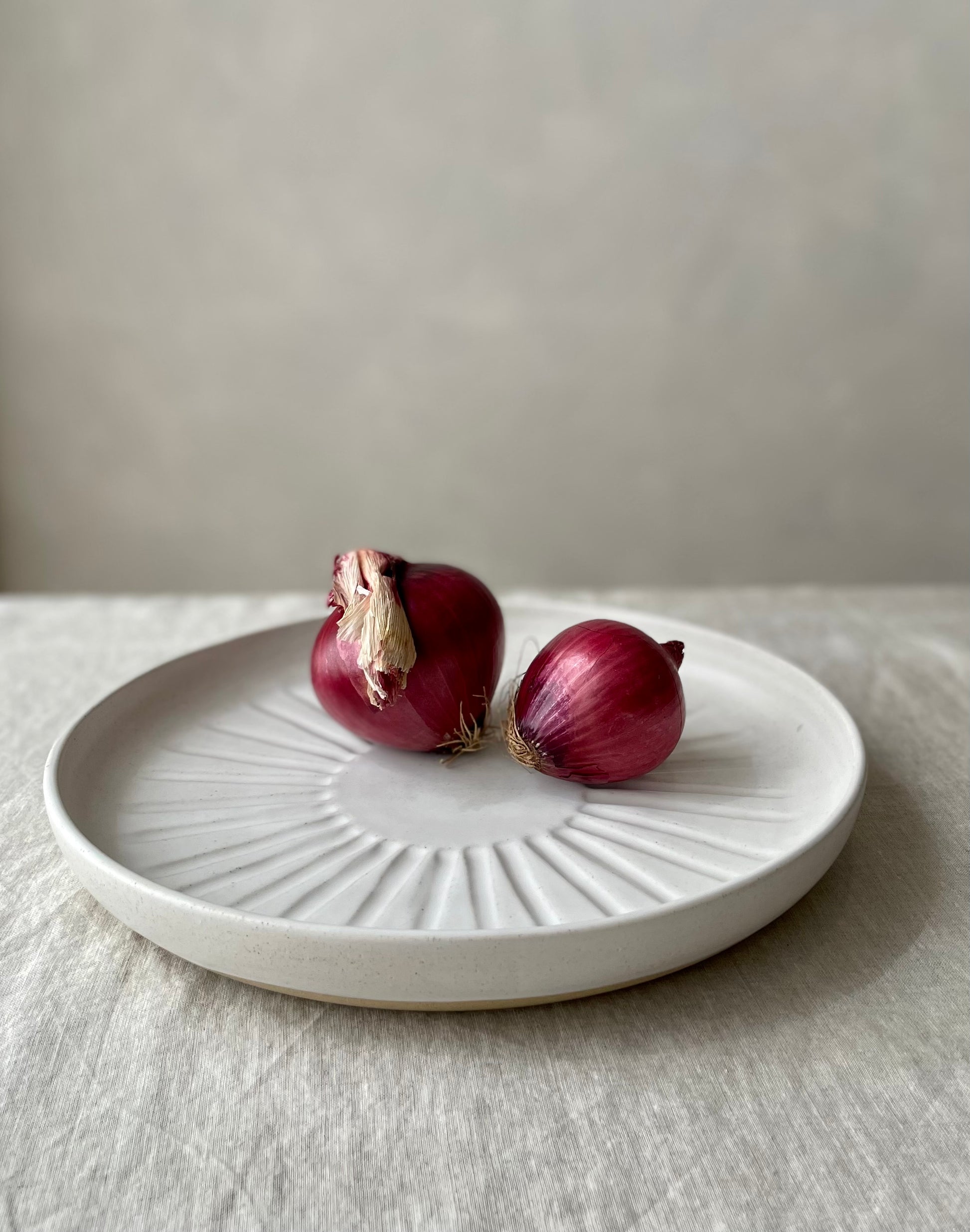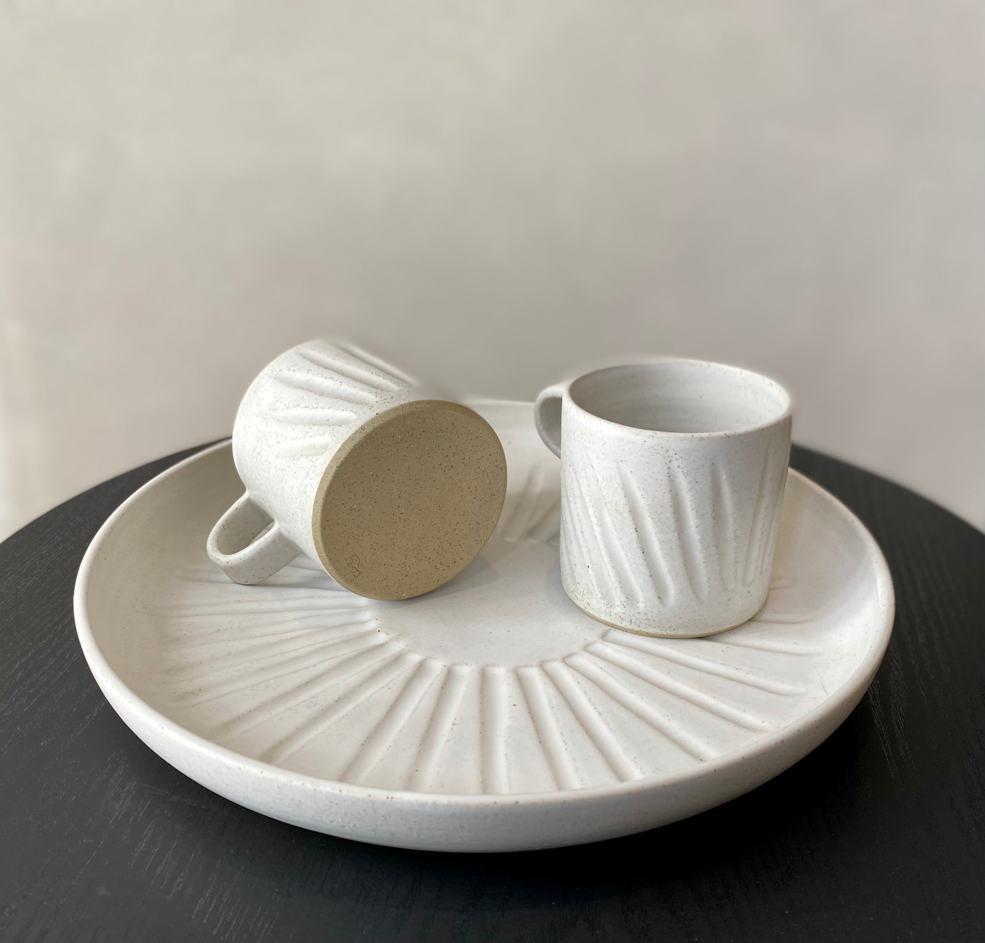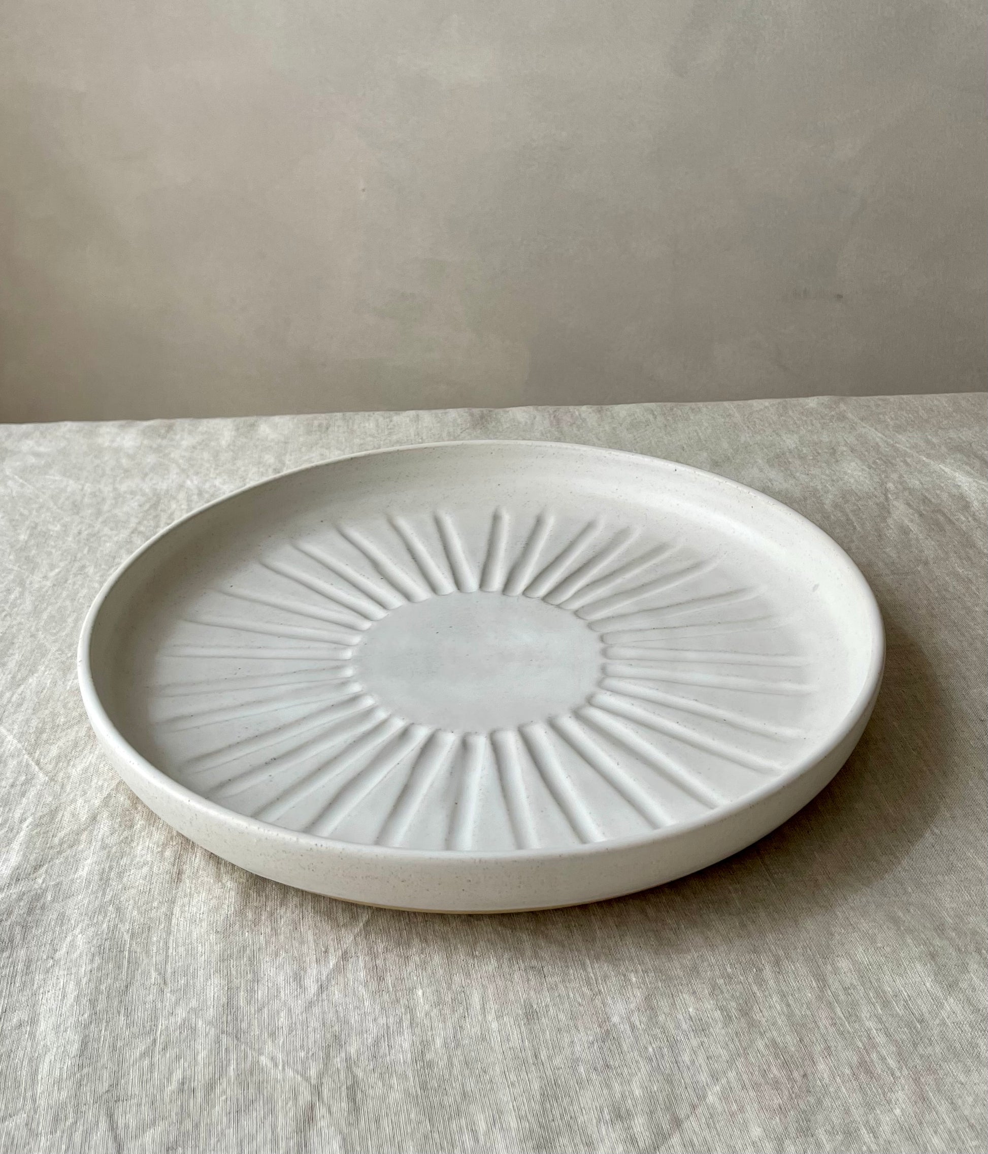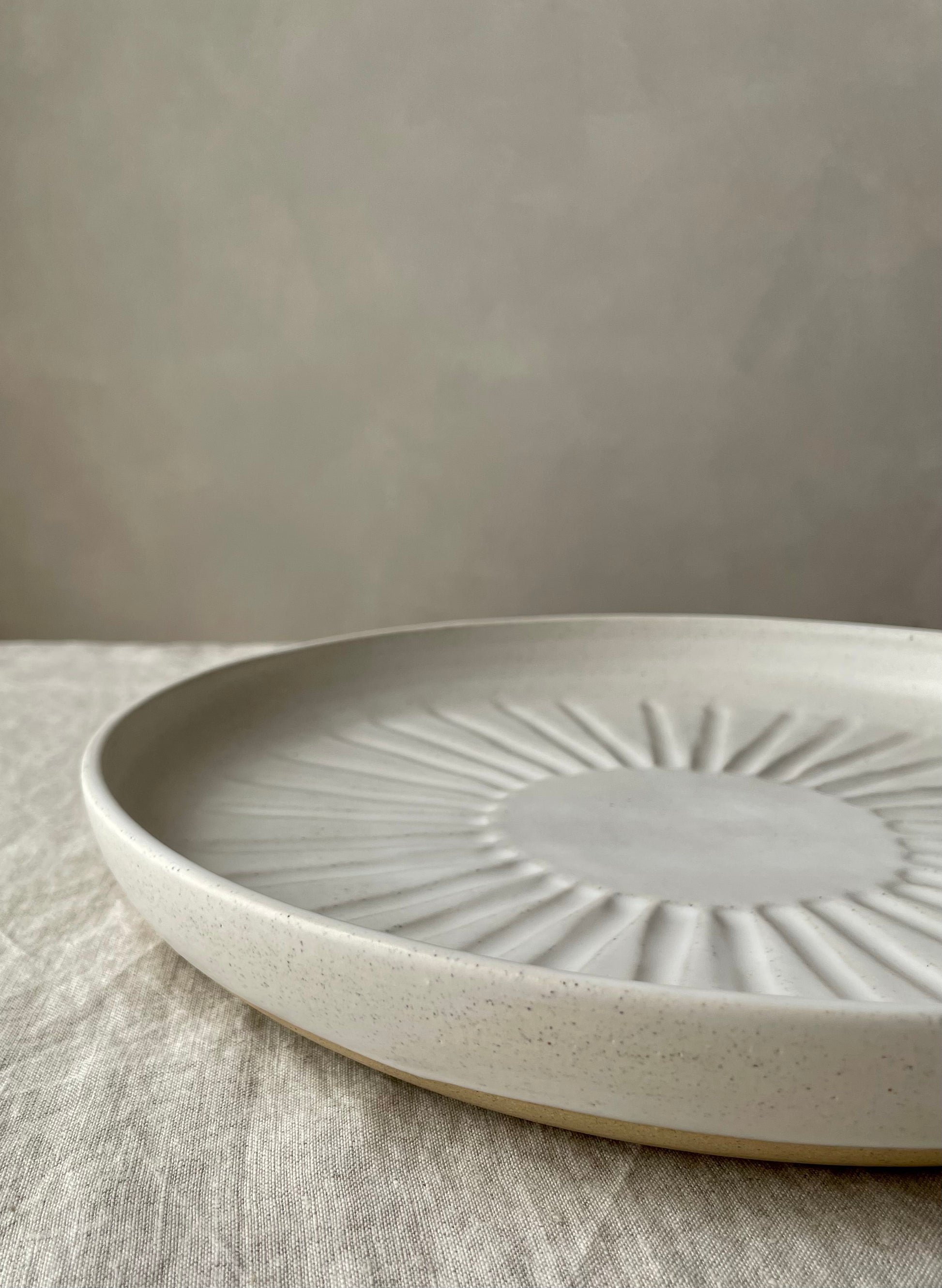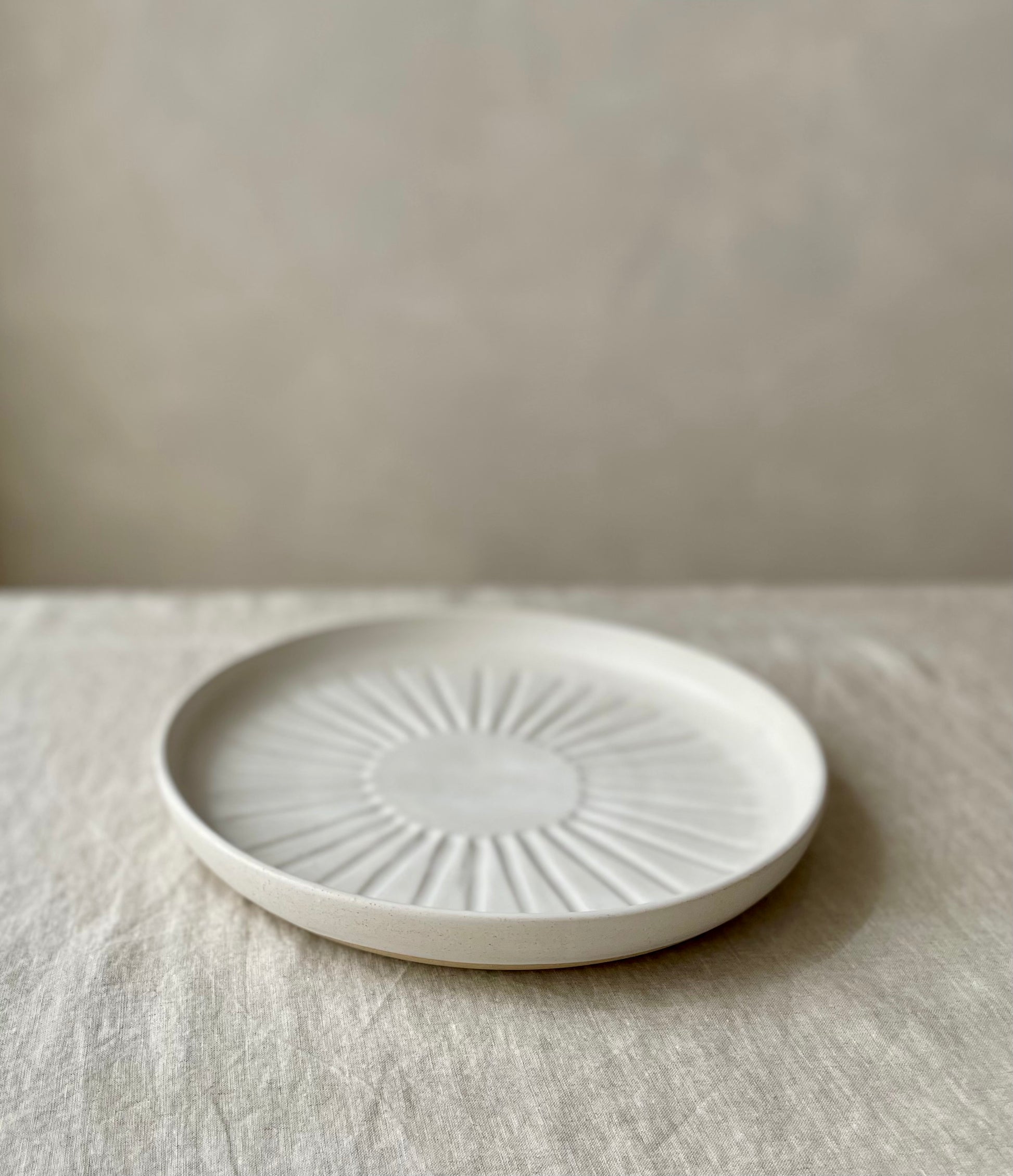Wheel formed stoneware with matte white glaze and hand carved sunburst decoration