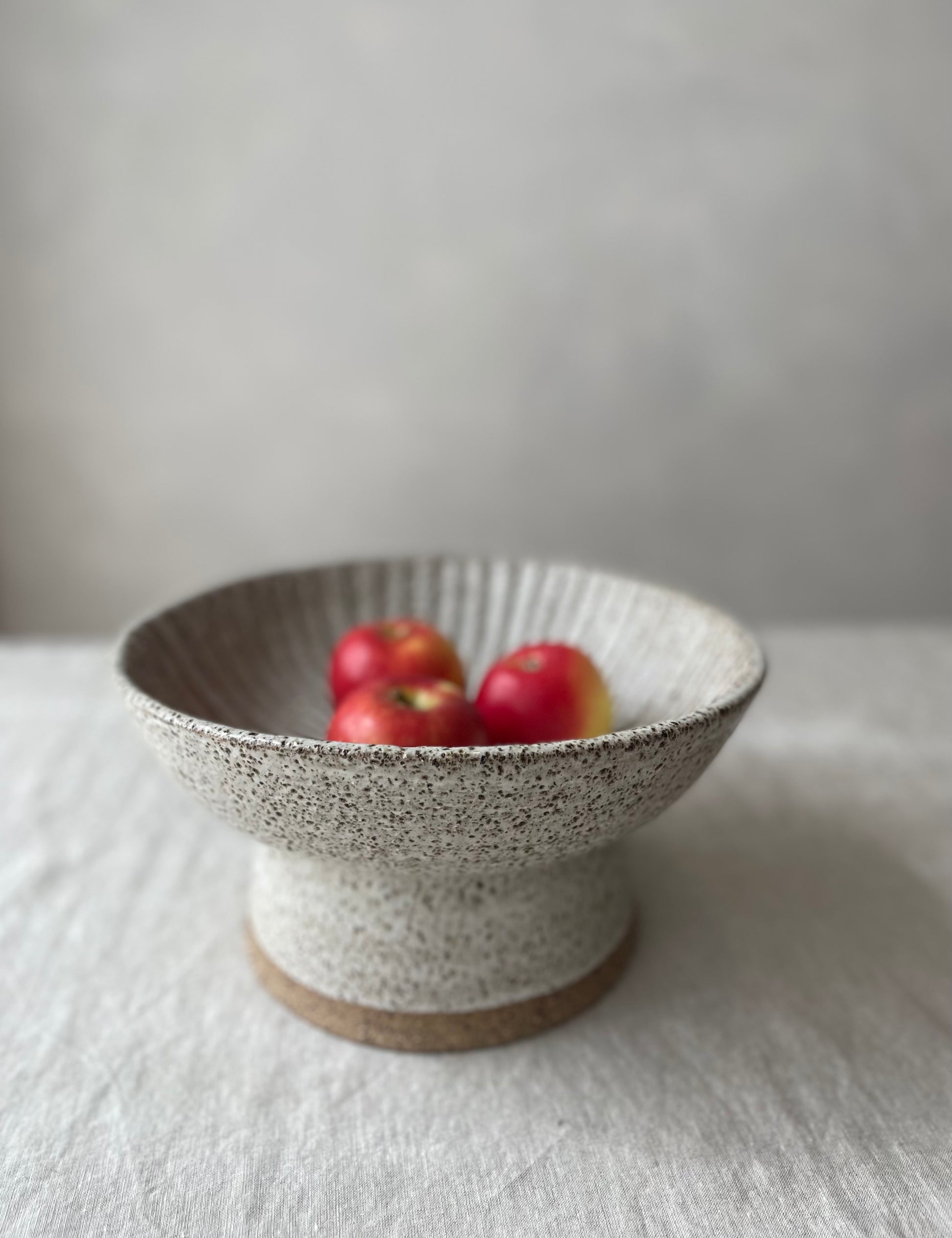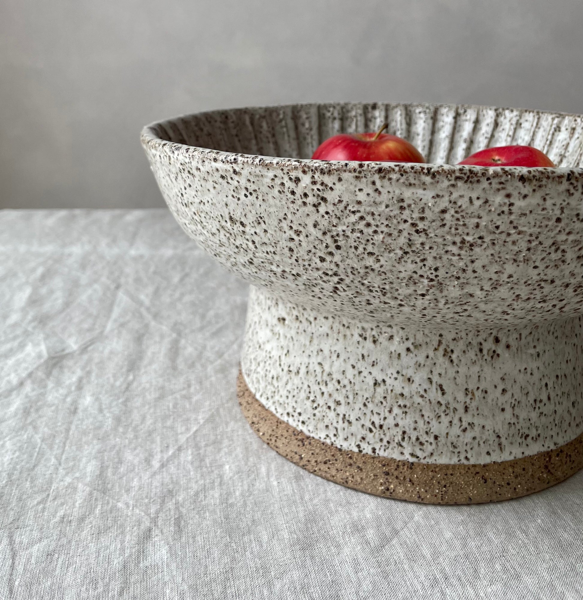Wheel and hand formed highly textured stoneware, with hand carved fluting and a speckled white glaze.