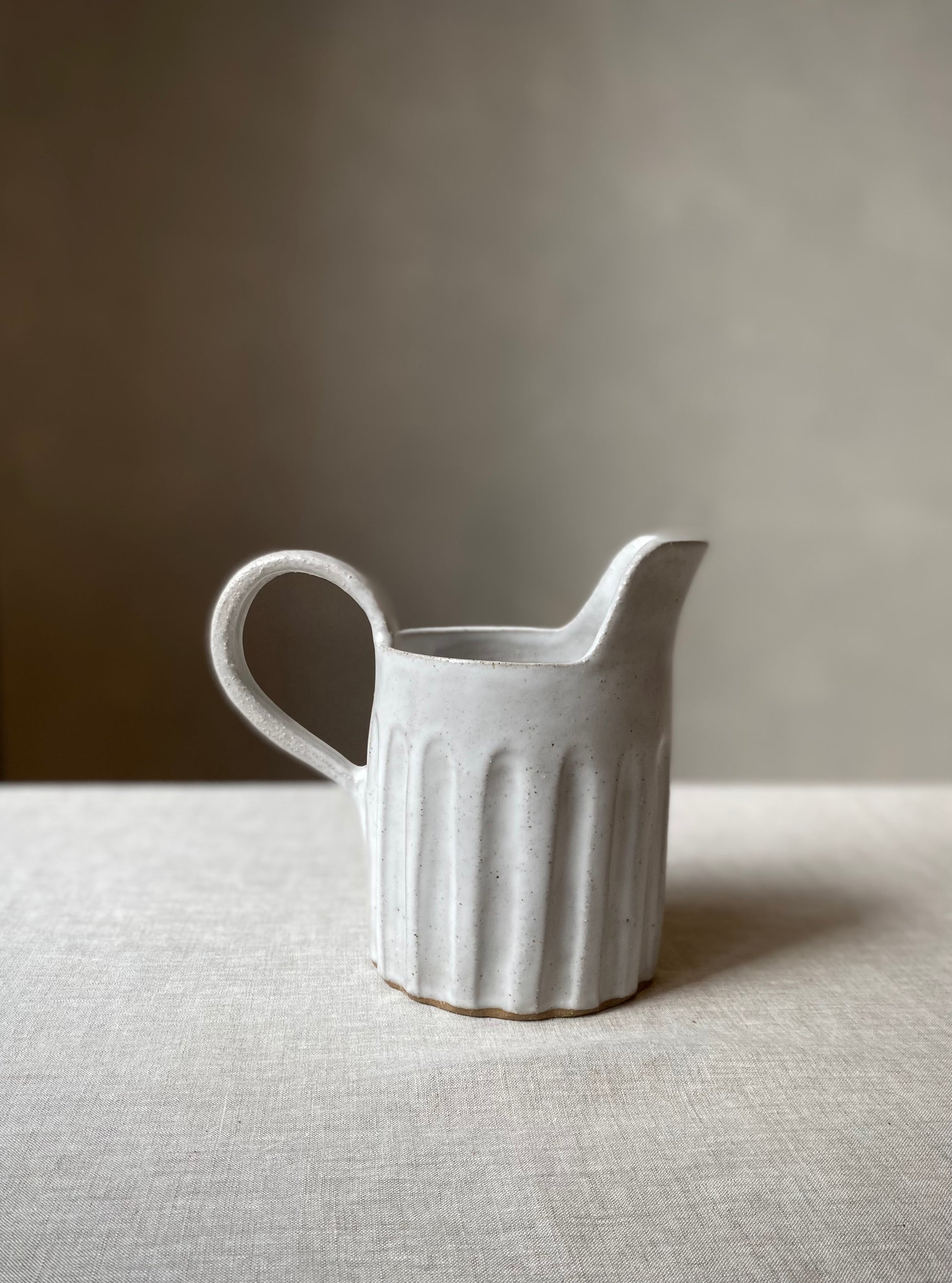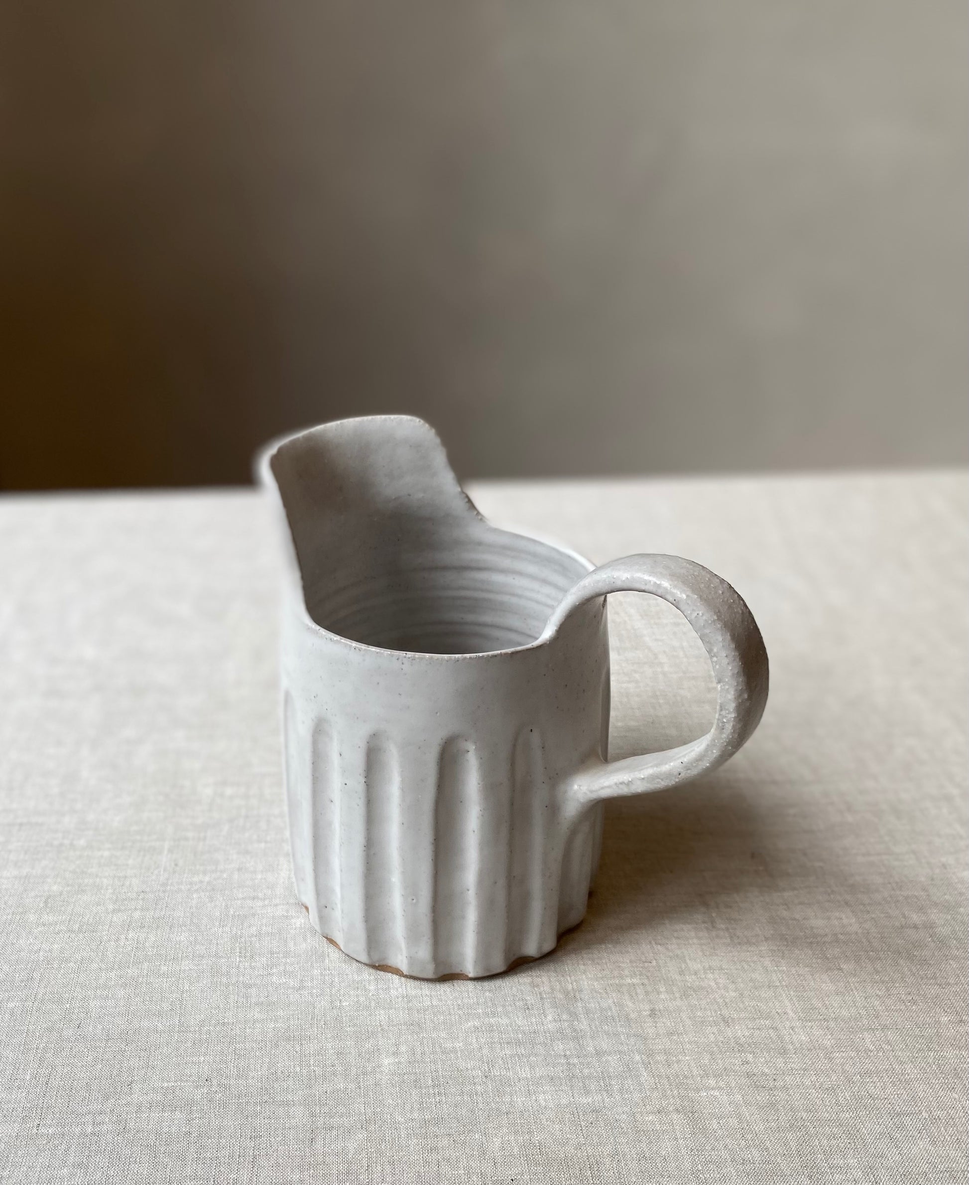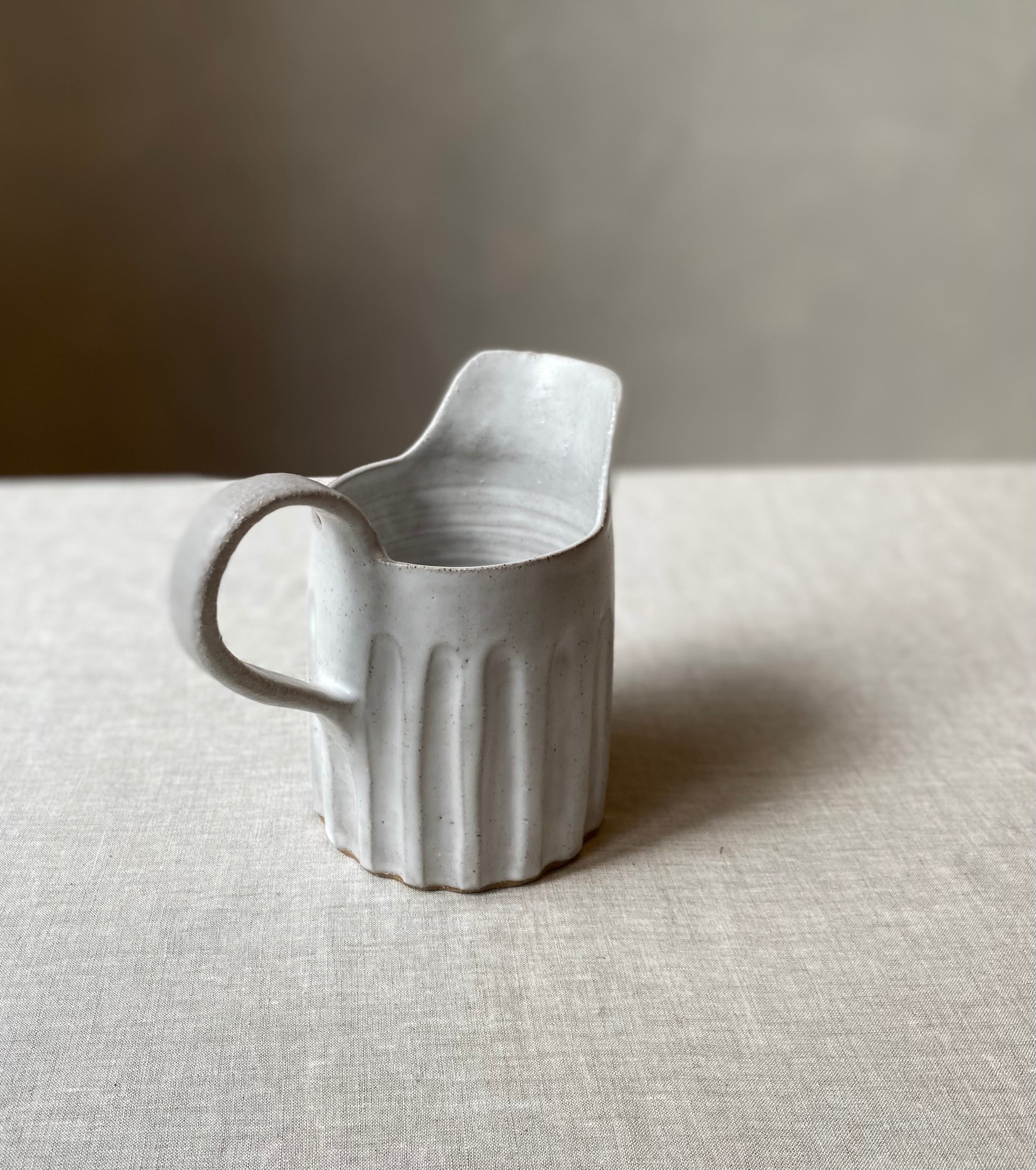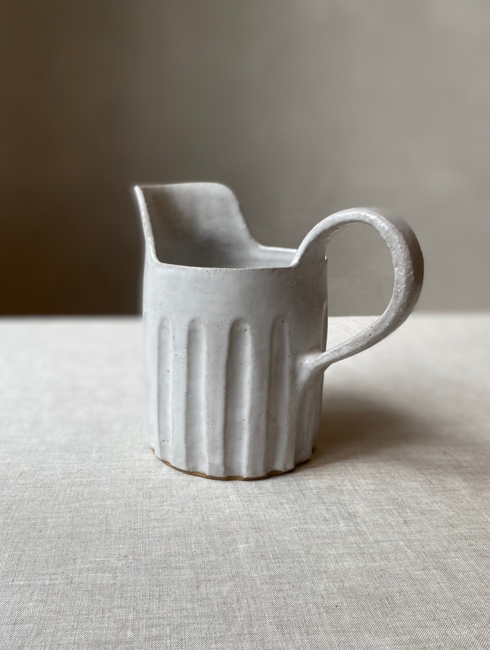 Wheel and hand formed jug in textured stoneware with a matt white glaze.