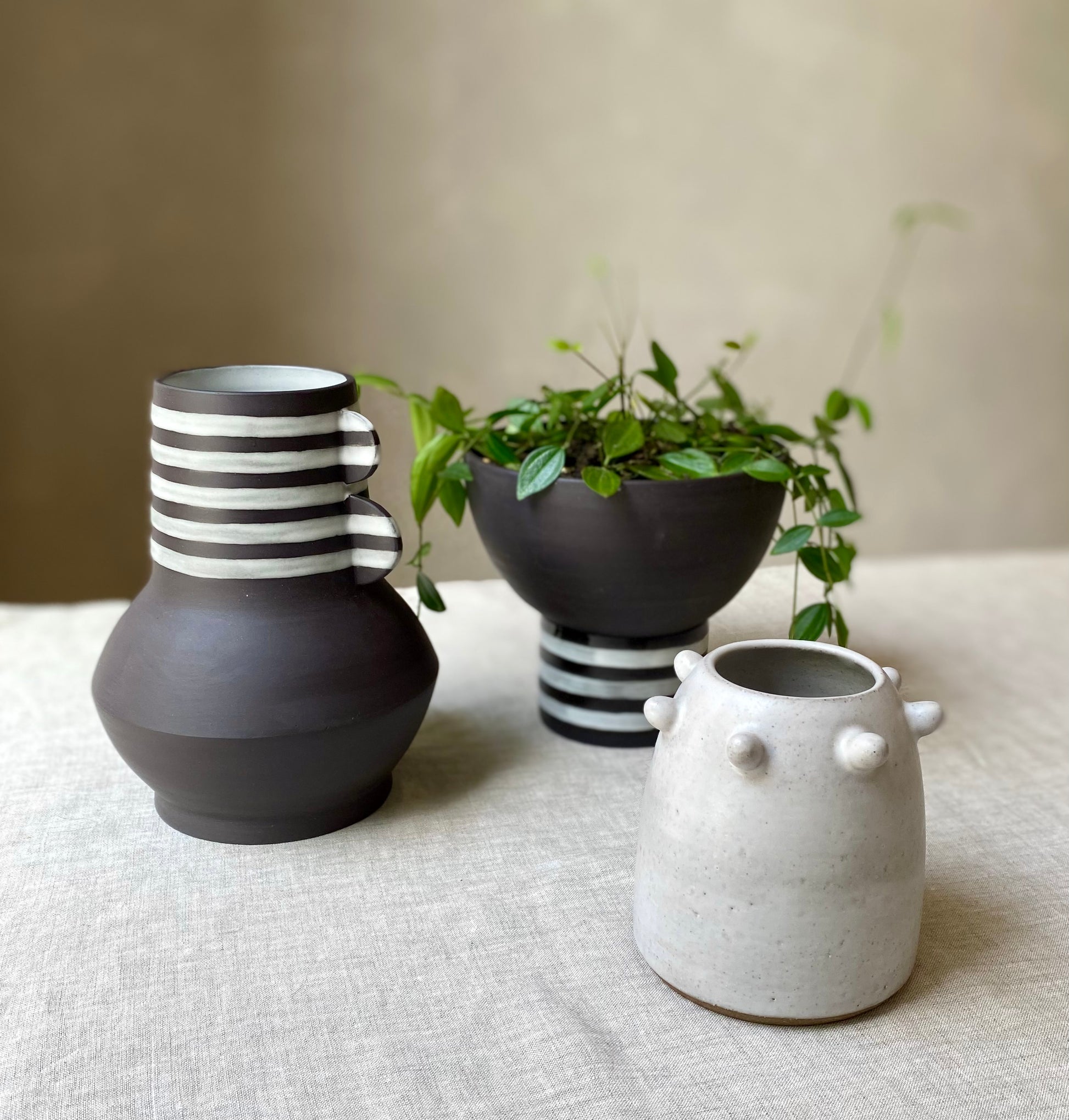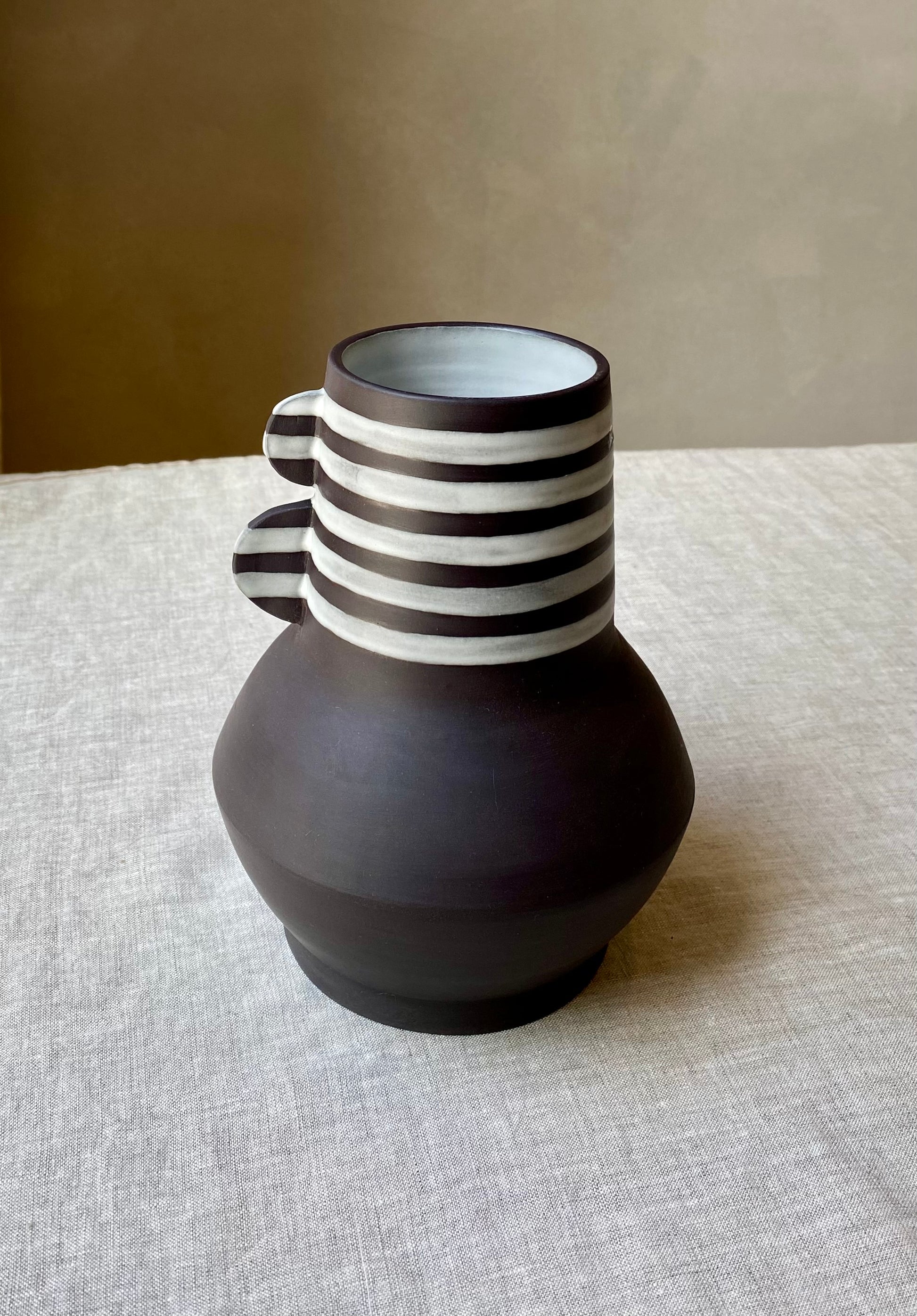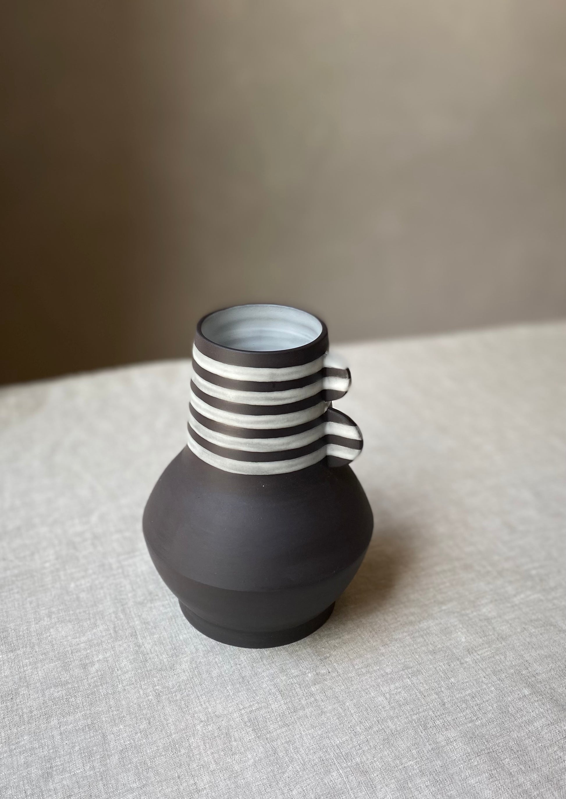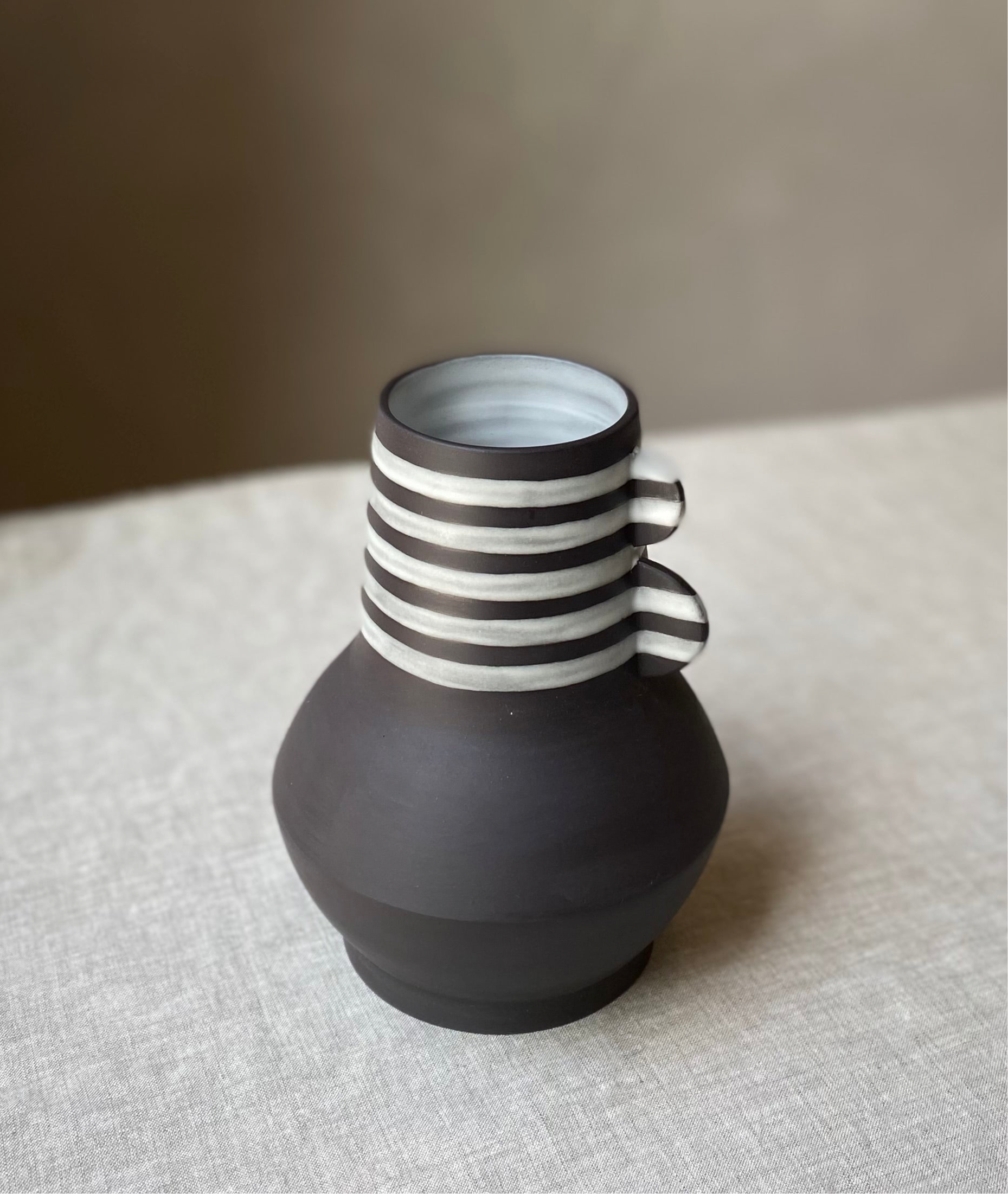 Wheel formed black stoneware with white matte stripes and hand formed tabs.
