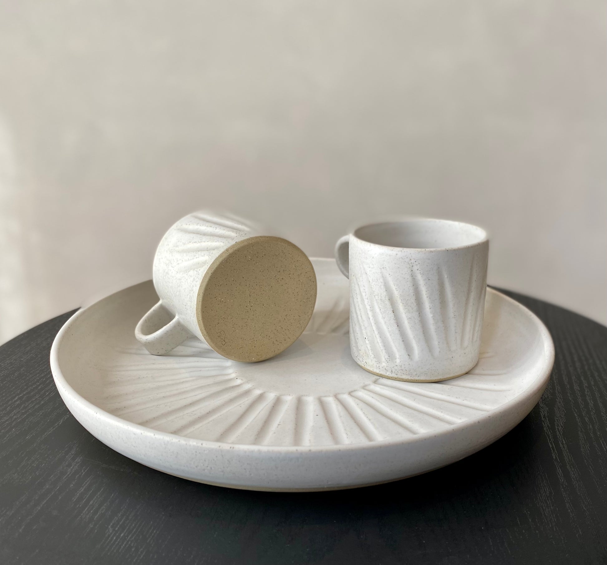 Wheel formed in textured stoneware with a matte white glaze and handcarved sunburst.