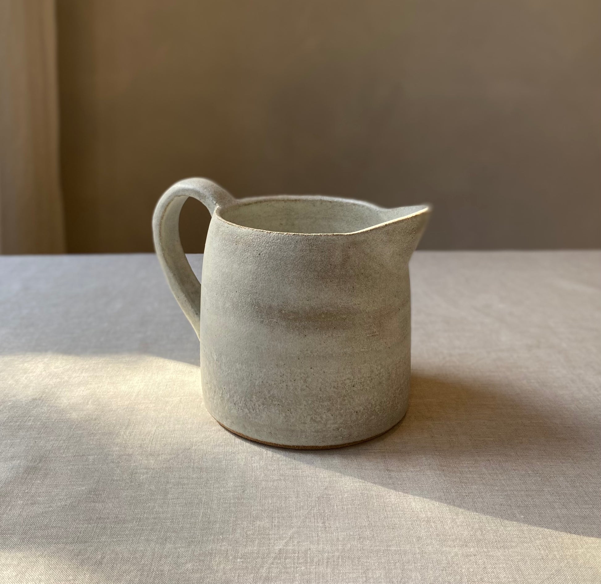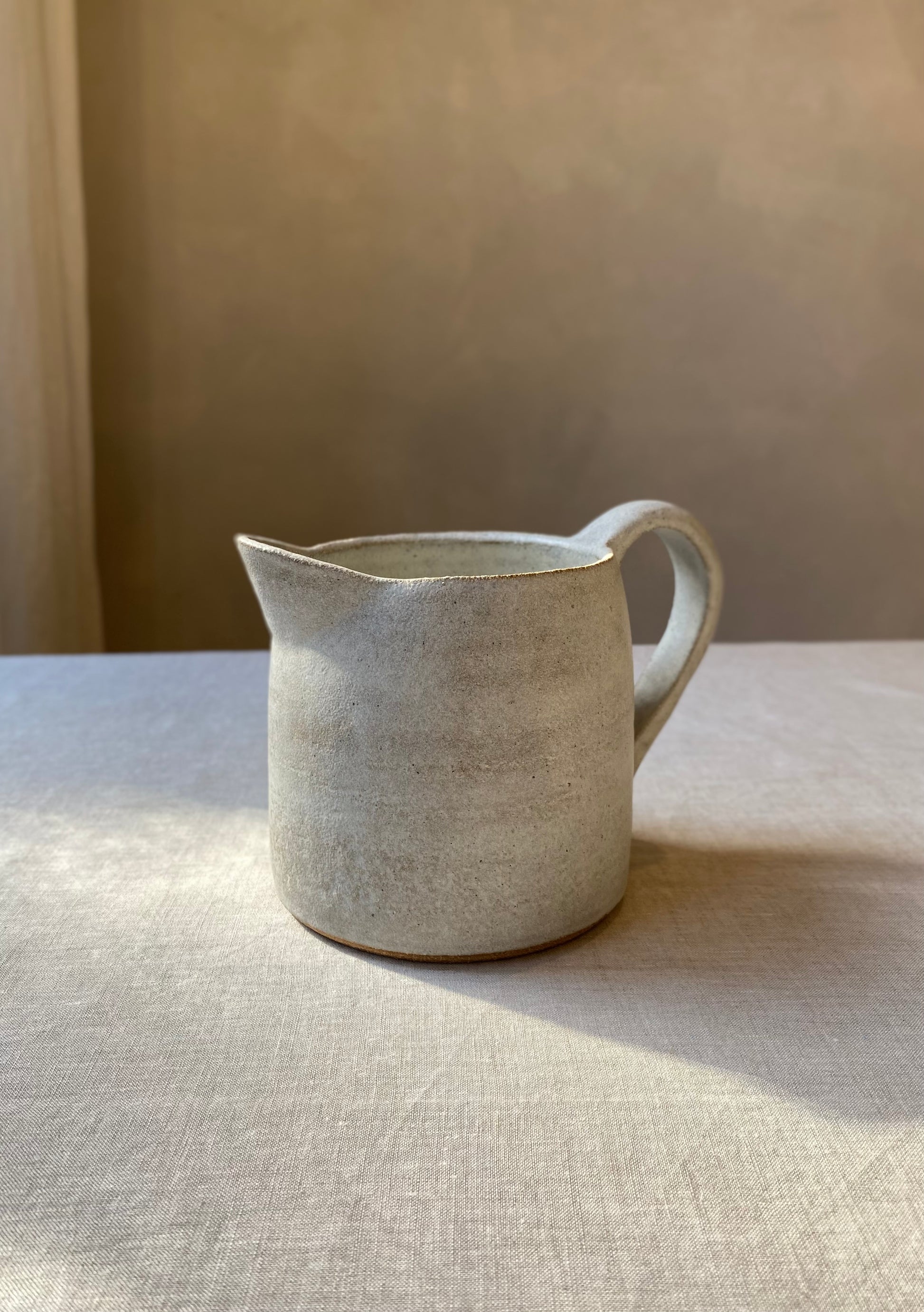 Wheel and hand formed jug in textured stoneware with a matt buff glaze.