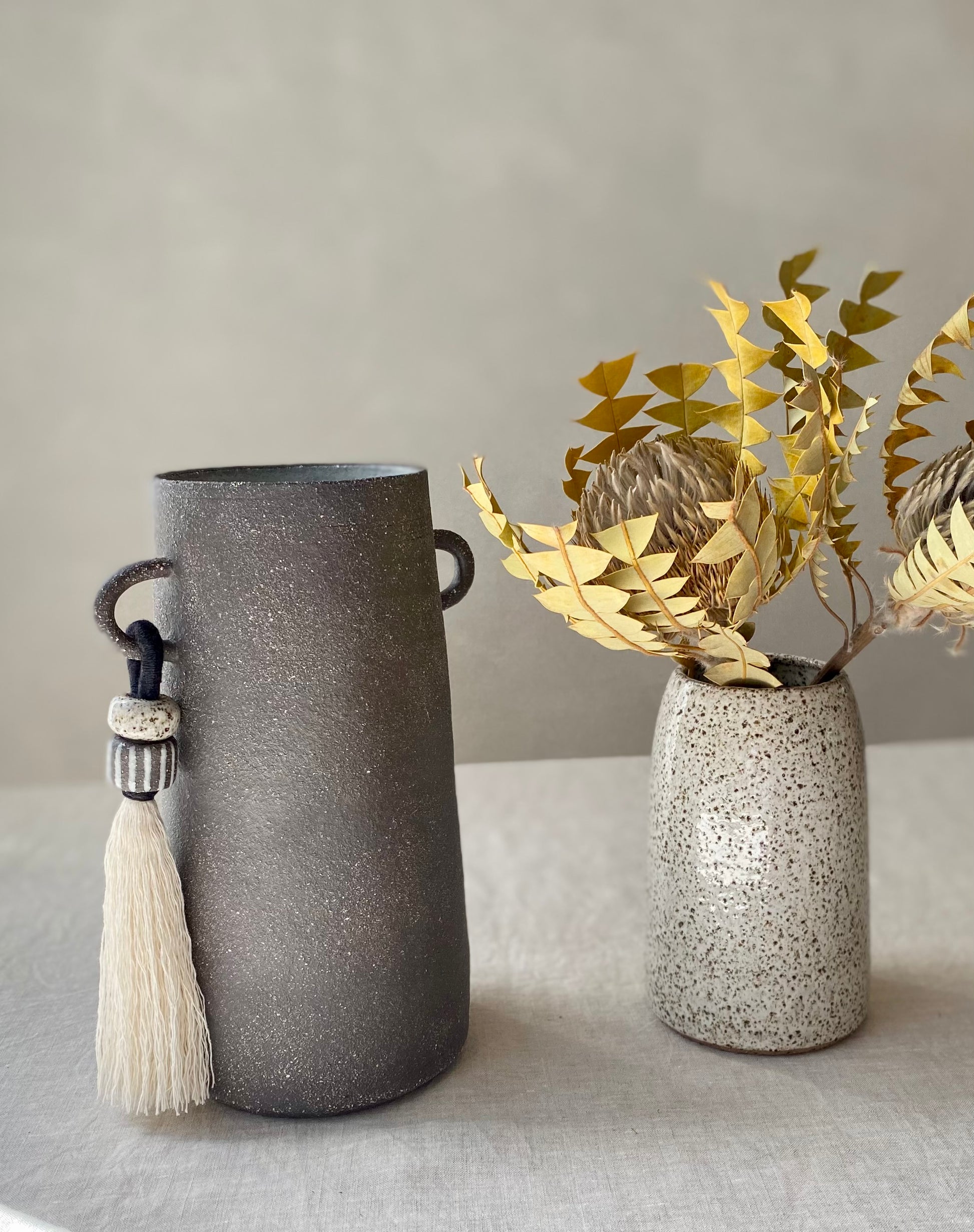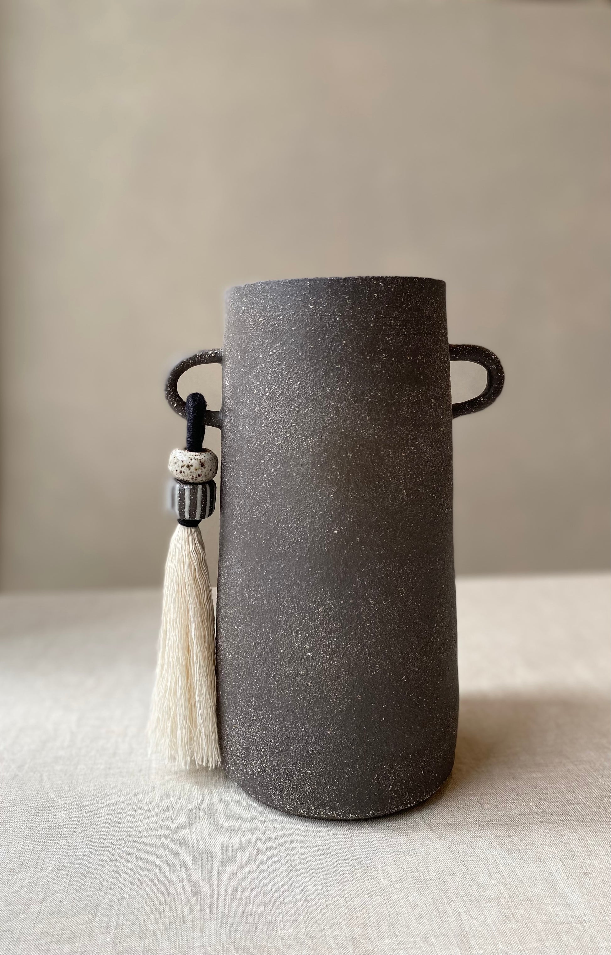Wheel formed highly textured stoneware with an internal matte white glaze and hand made ceramic bead and tassel.