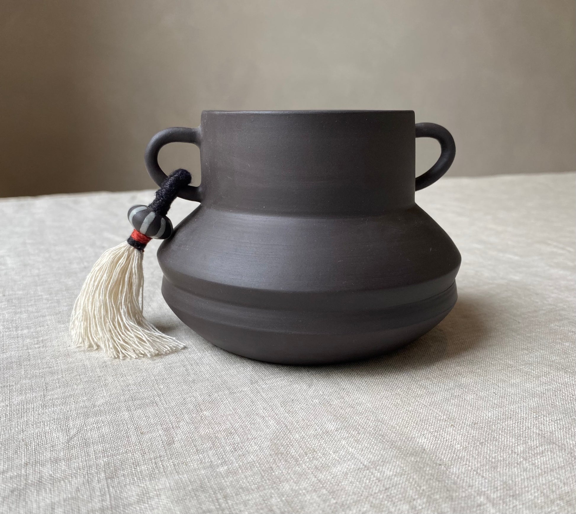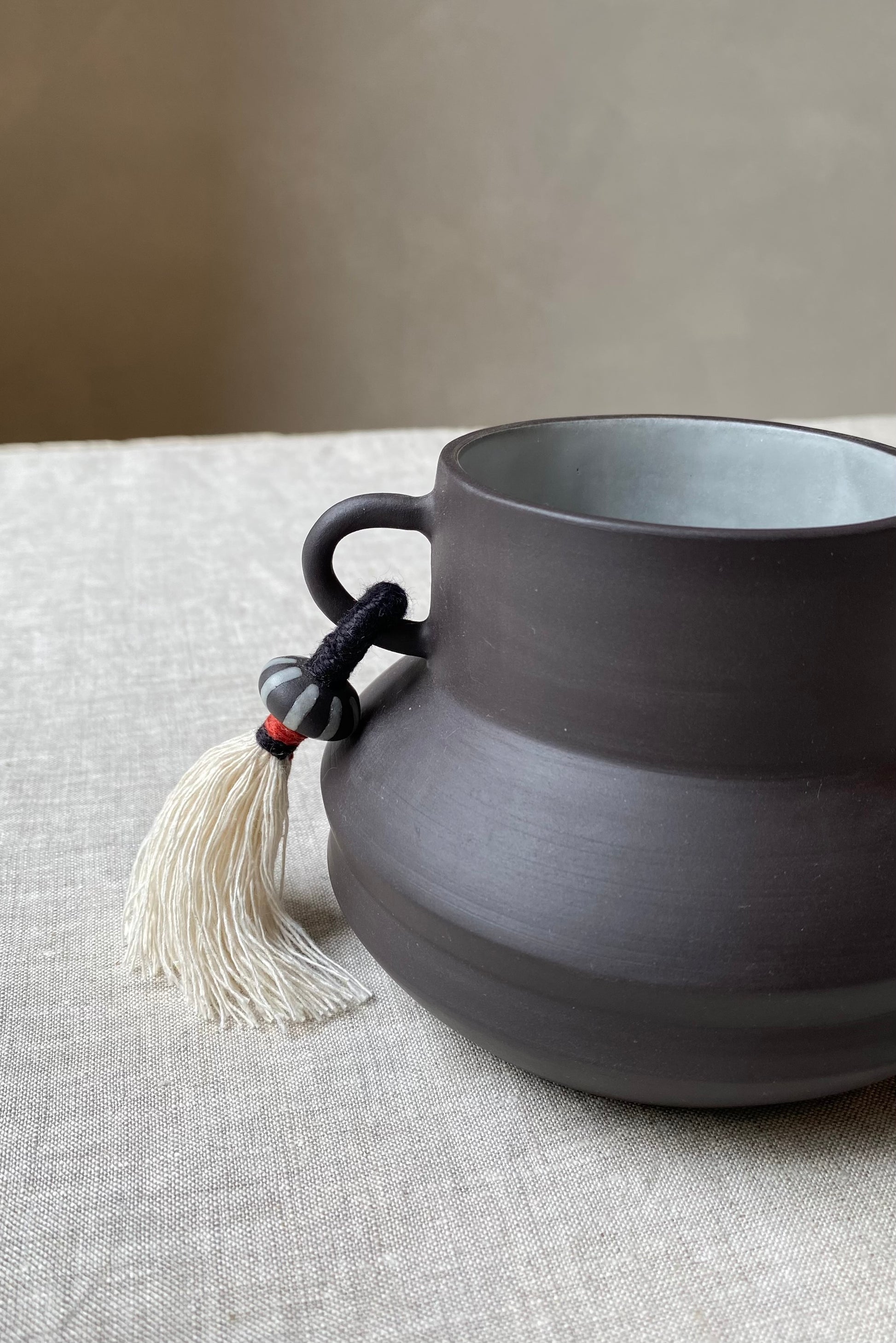 Wheel formed black stoneware with unglazed external surface, white matte glaze on the interior and hand formed 'loop' decoration. Hand made stoneware bead and tassel.