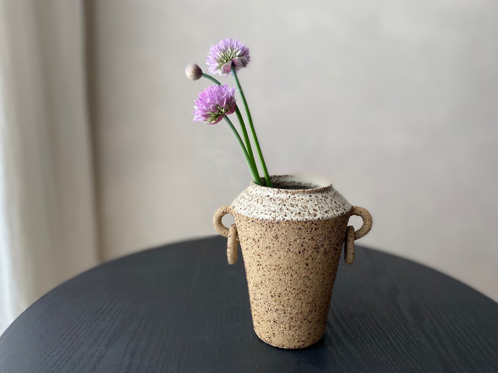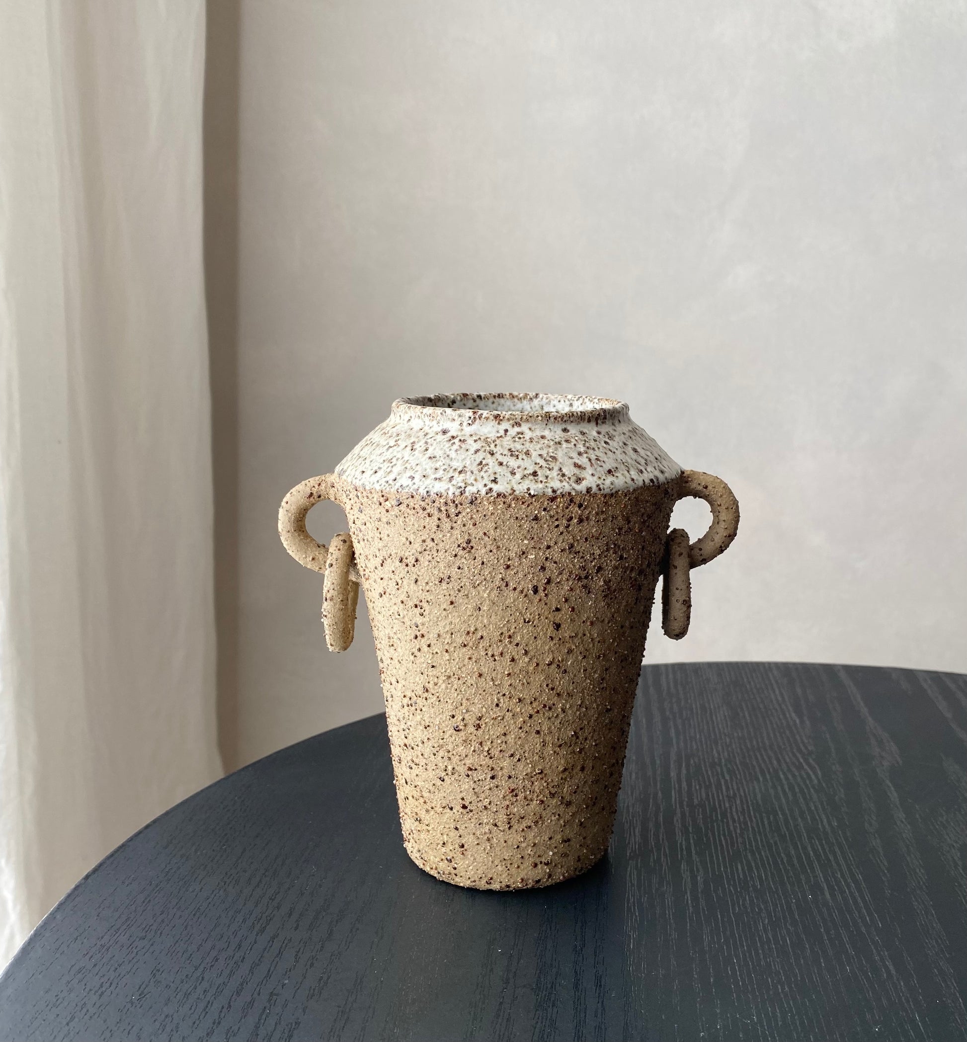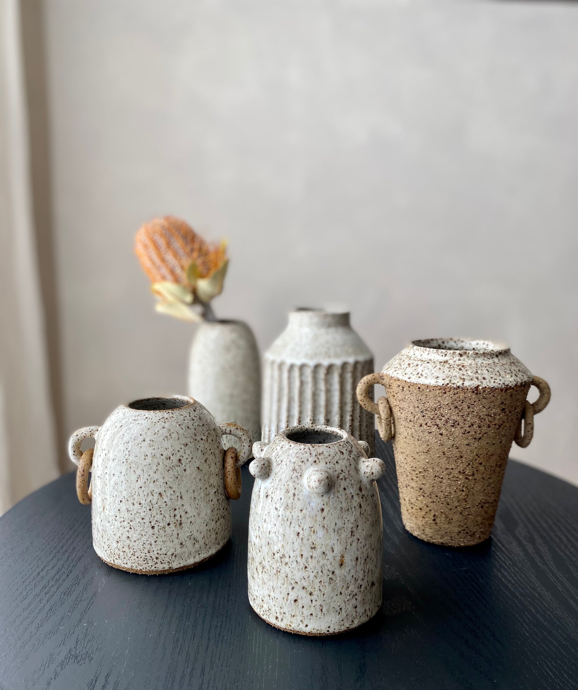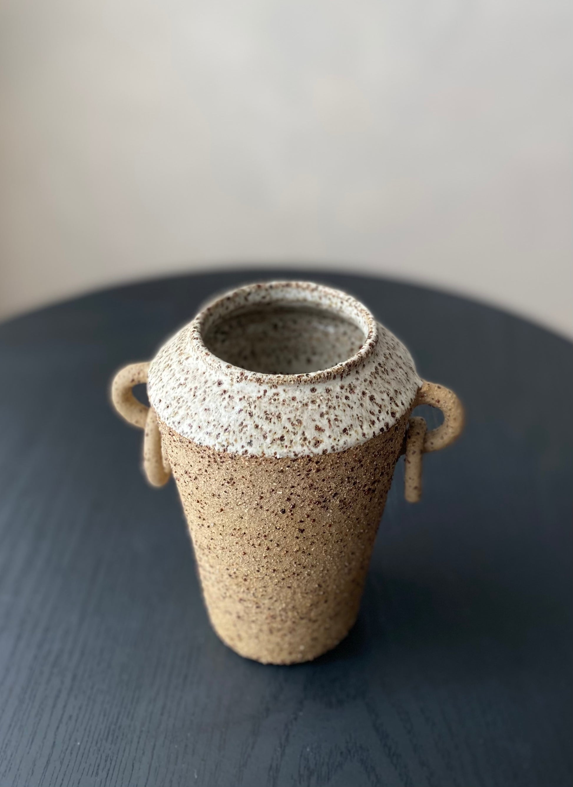 Wheel formed highly textured stoneware with speckled white glaze and hand formed 'earring' decoration