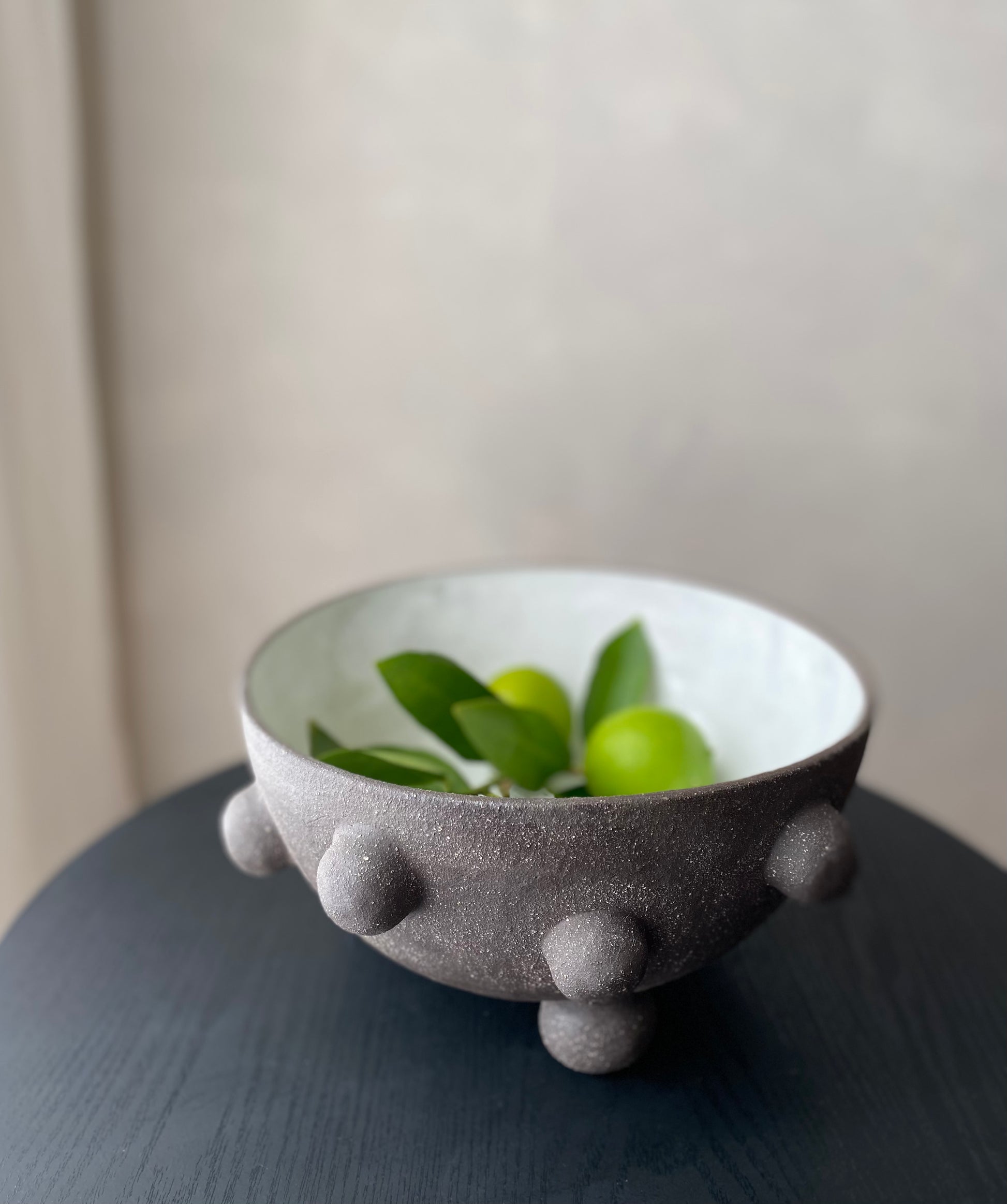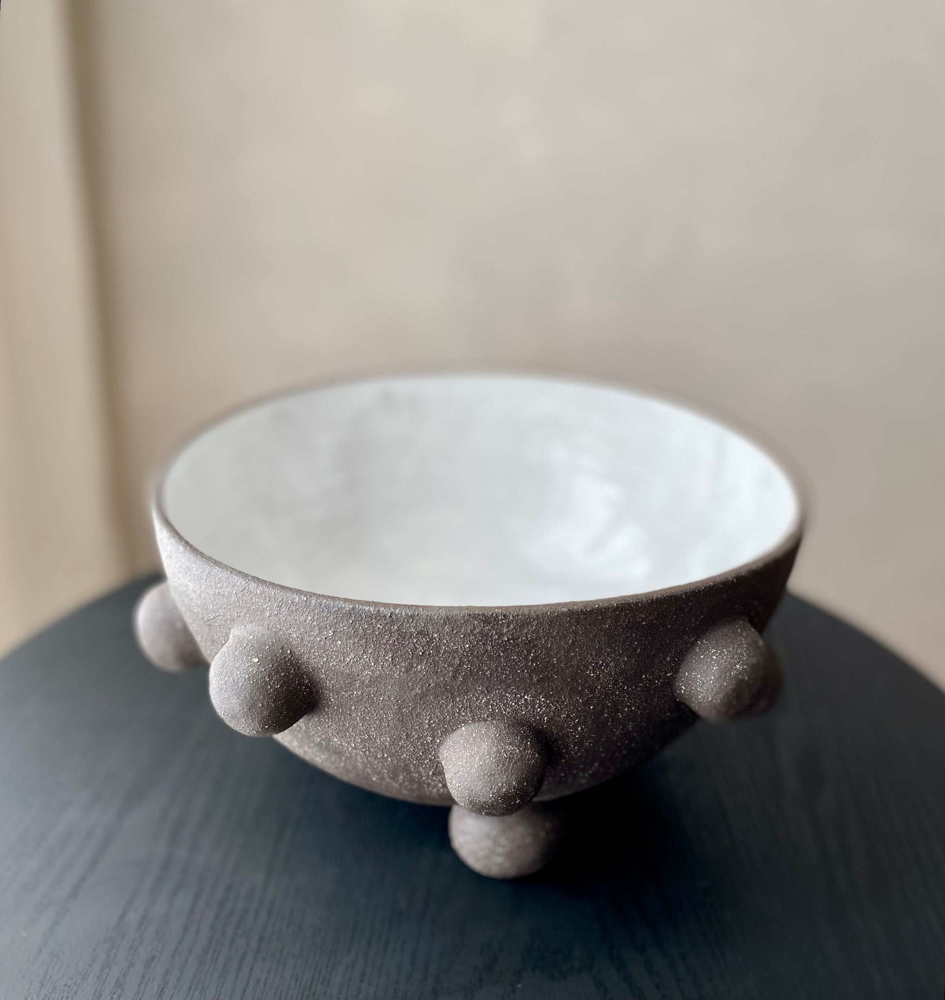 Wheel formed in black textured stoneware, raw external surface with matte white glaze inside. Hand formed decoration.