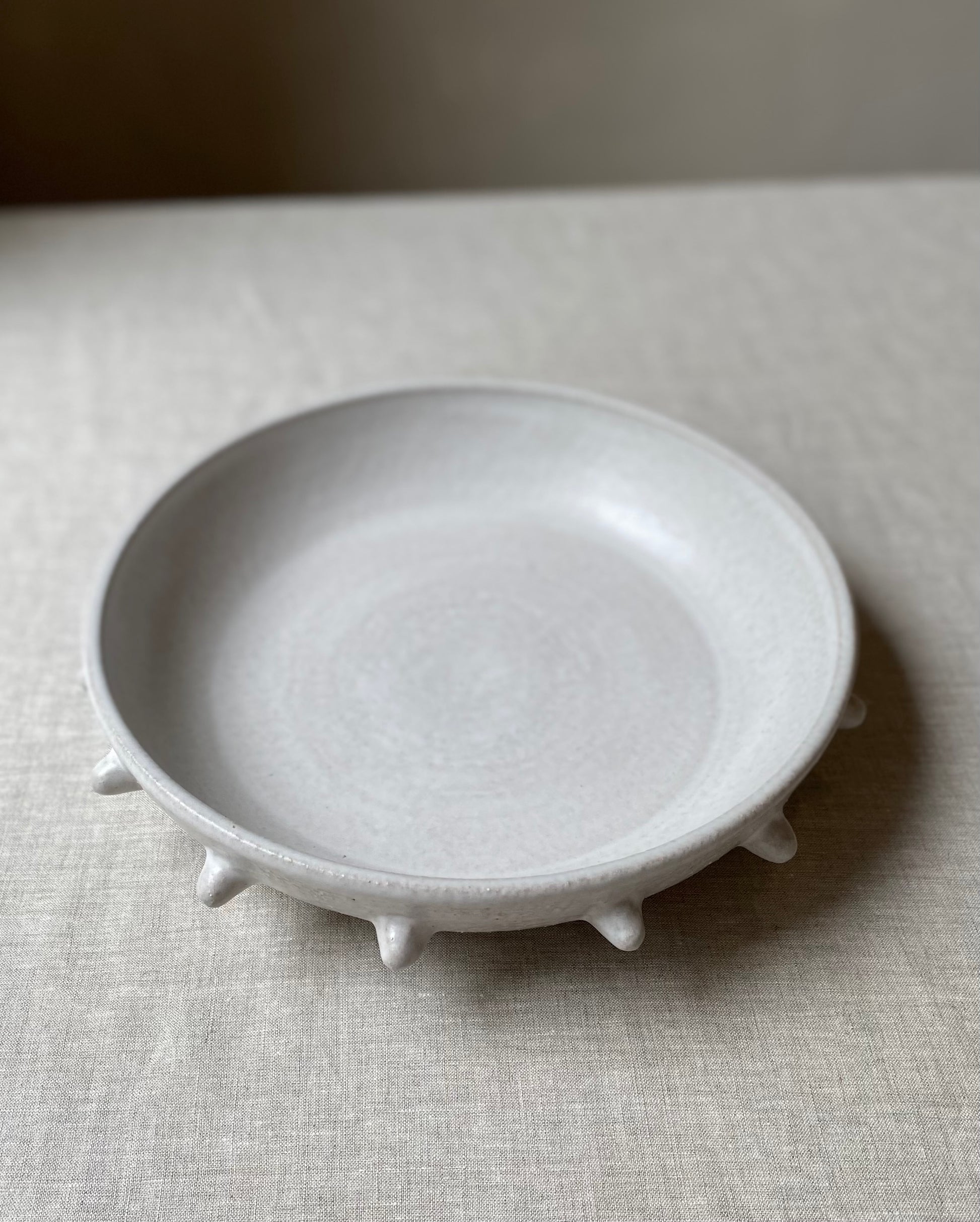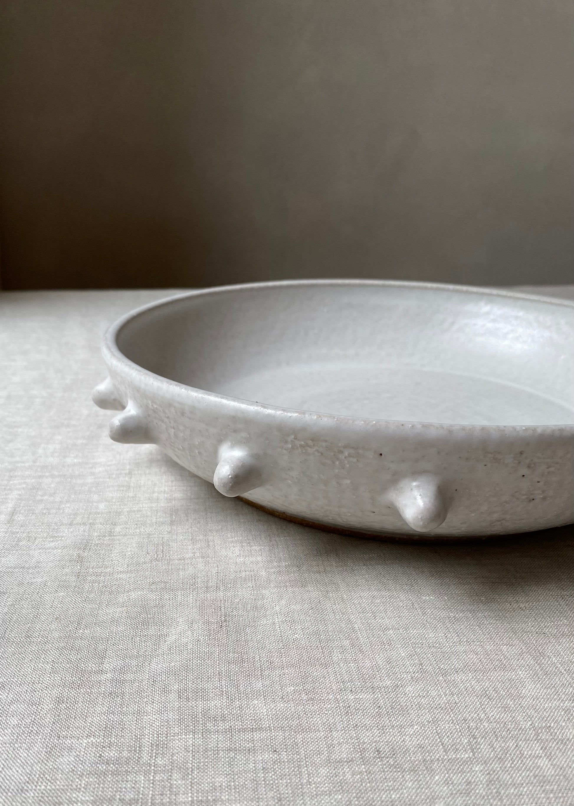 Wheel formed textured stoneware platter with matte white glaze, and handcrafted decoration around the rim.