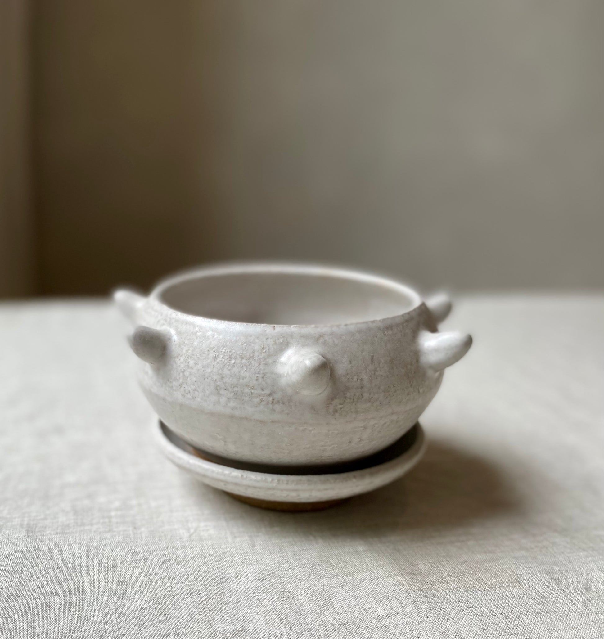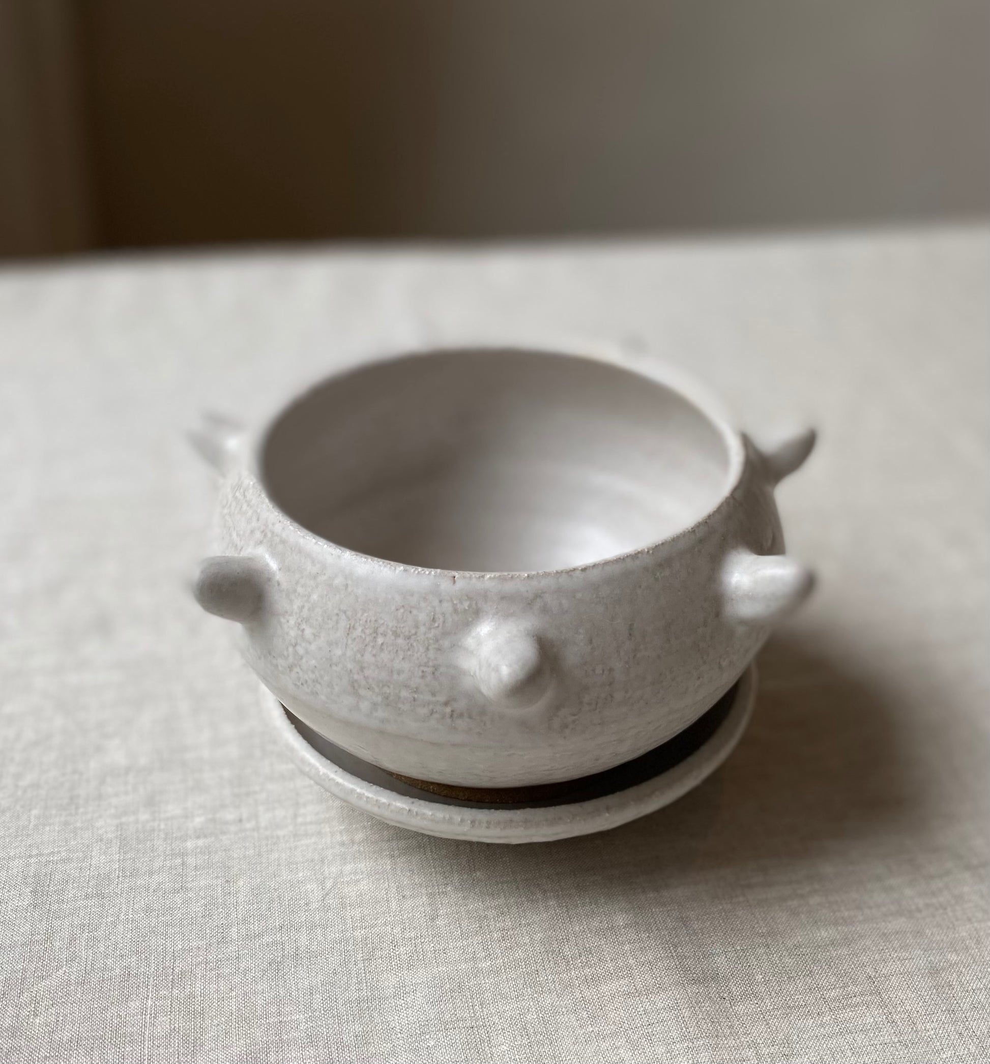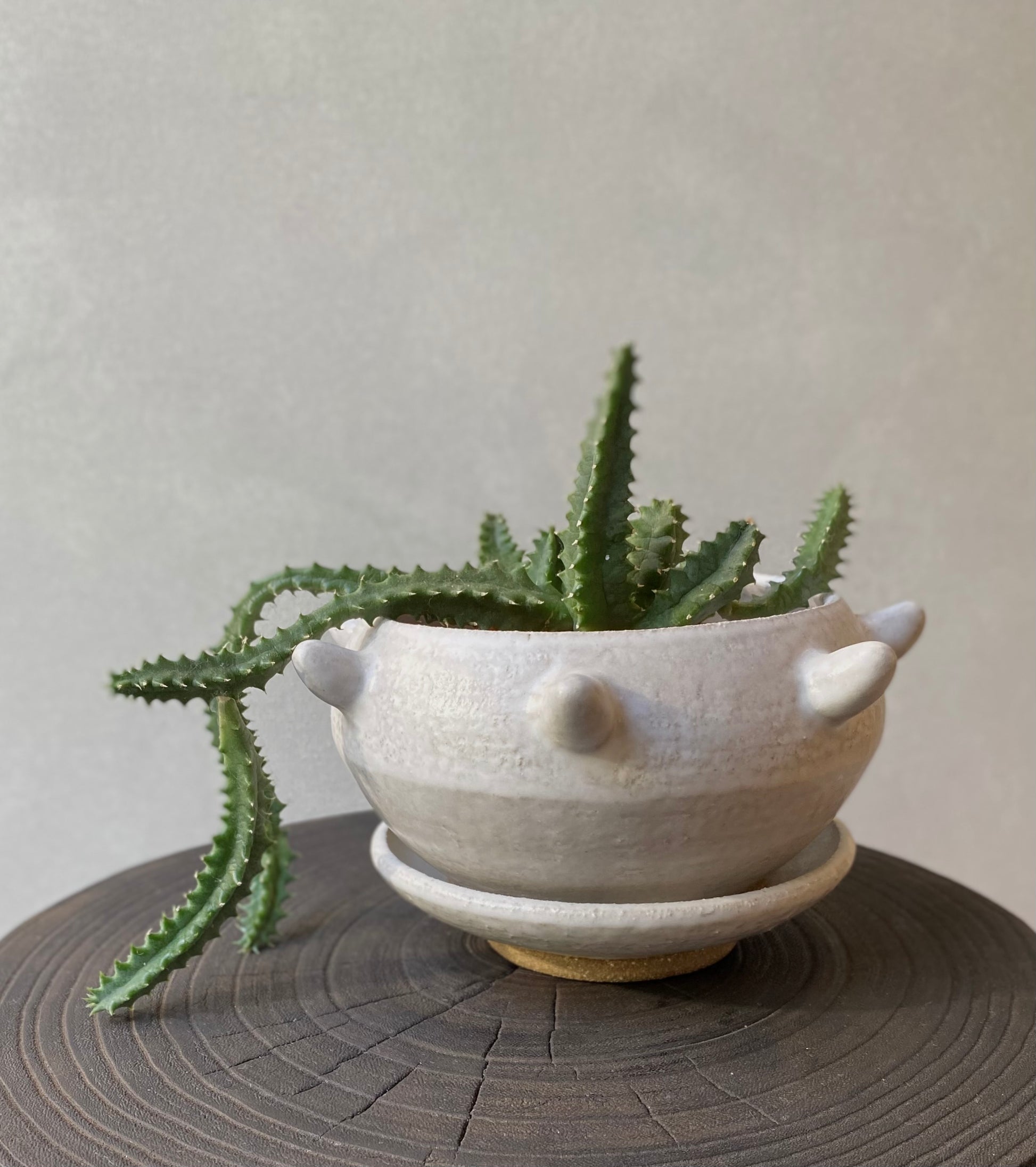 Wheel formed textured stoneware planter with saucer. Matt white glaze, and handcrafted decoration around the rim.