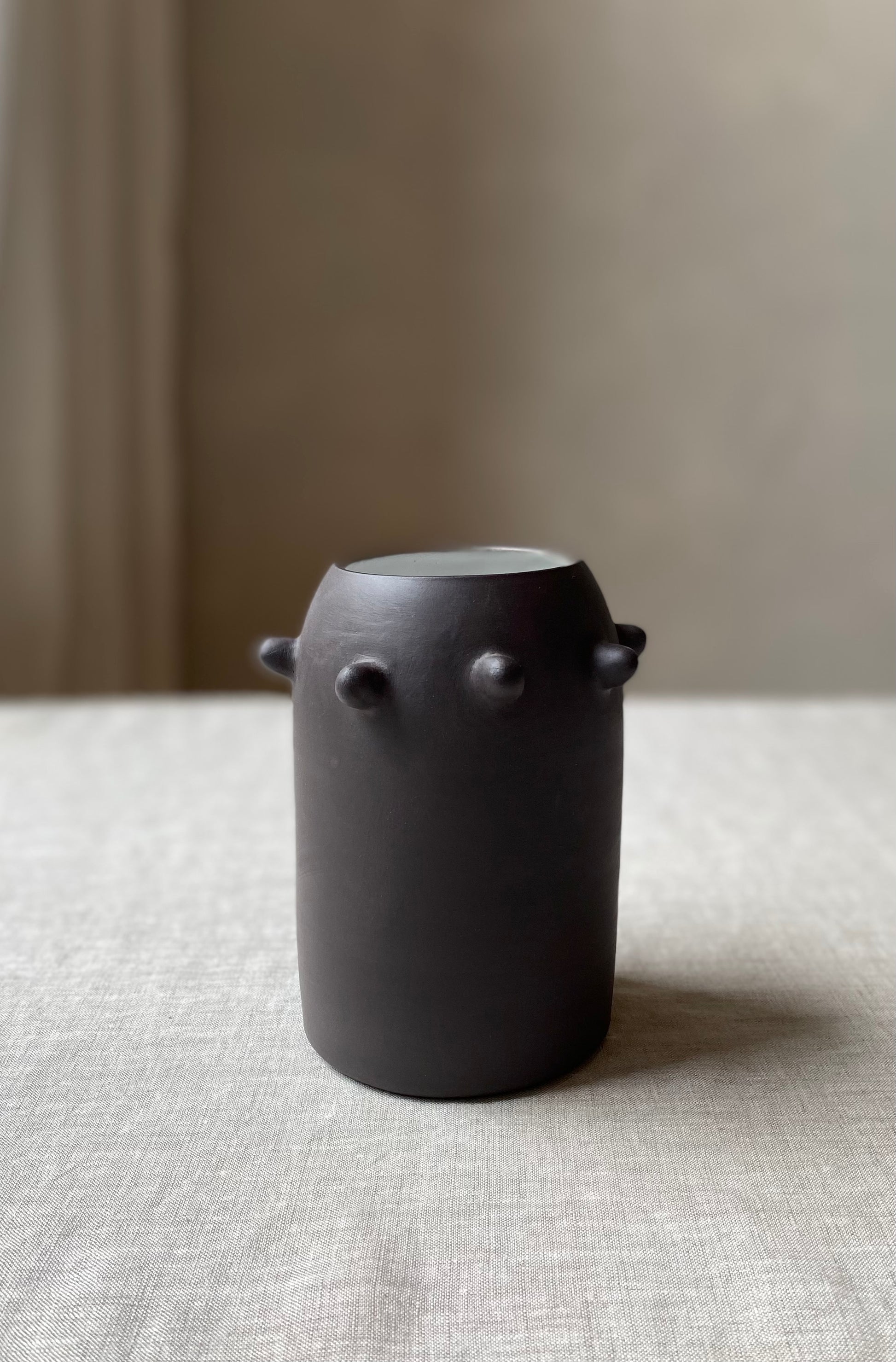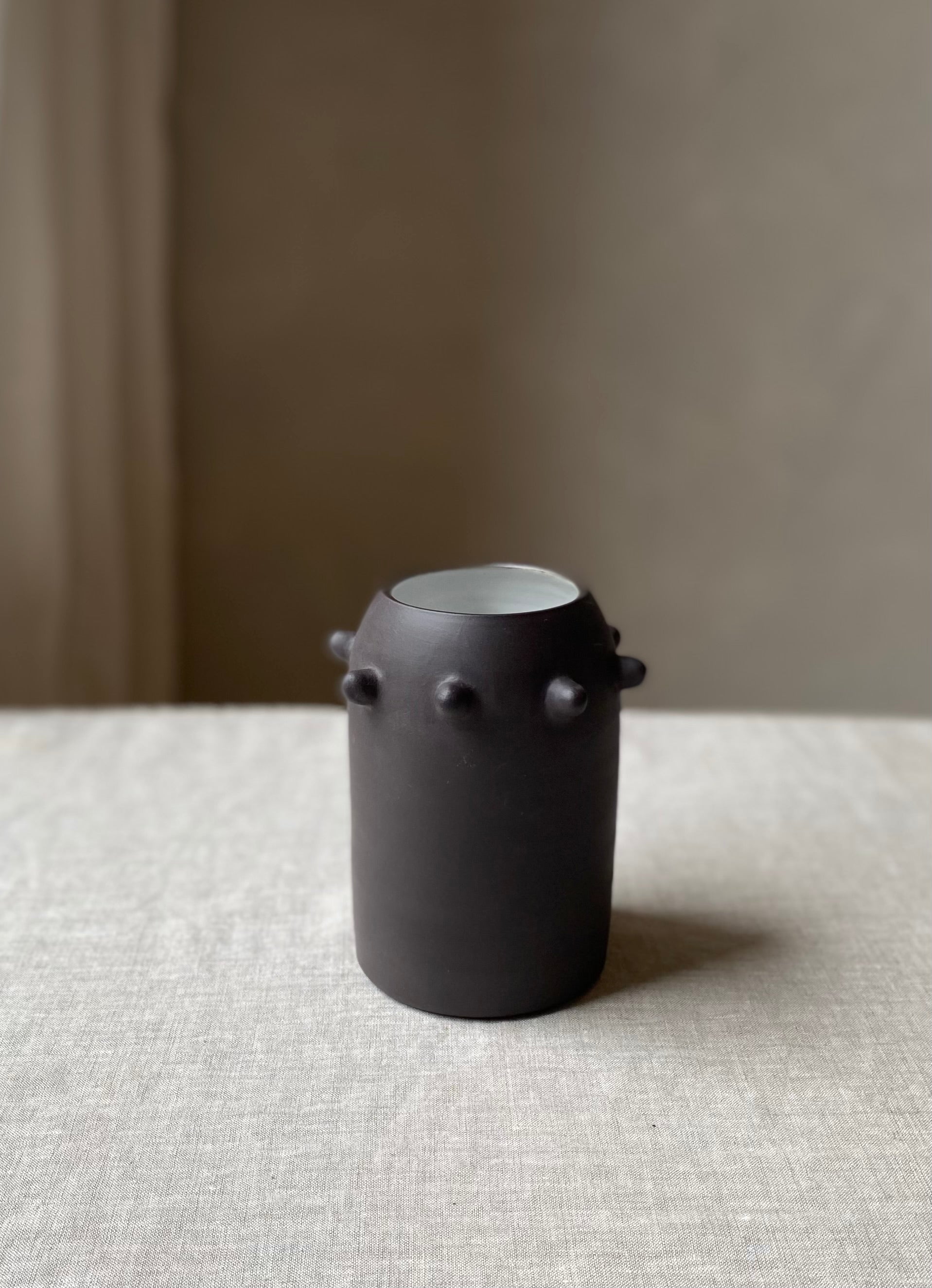 Wheel formed black stoneware with unglazed exterior surface, matt white glaze on the interior and hand formed decoration around the rim.