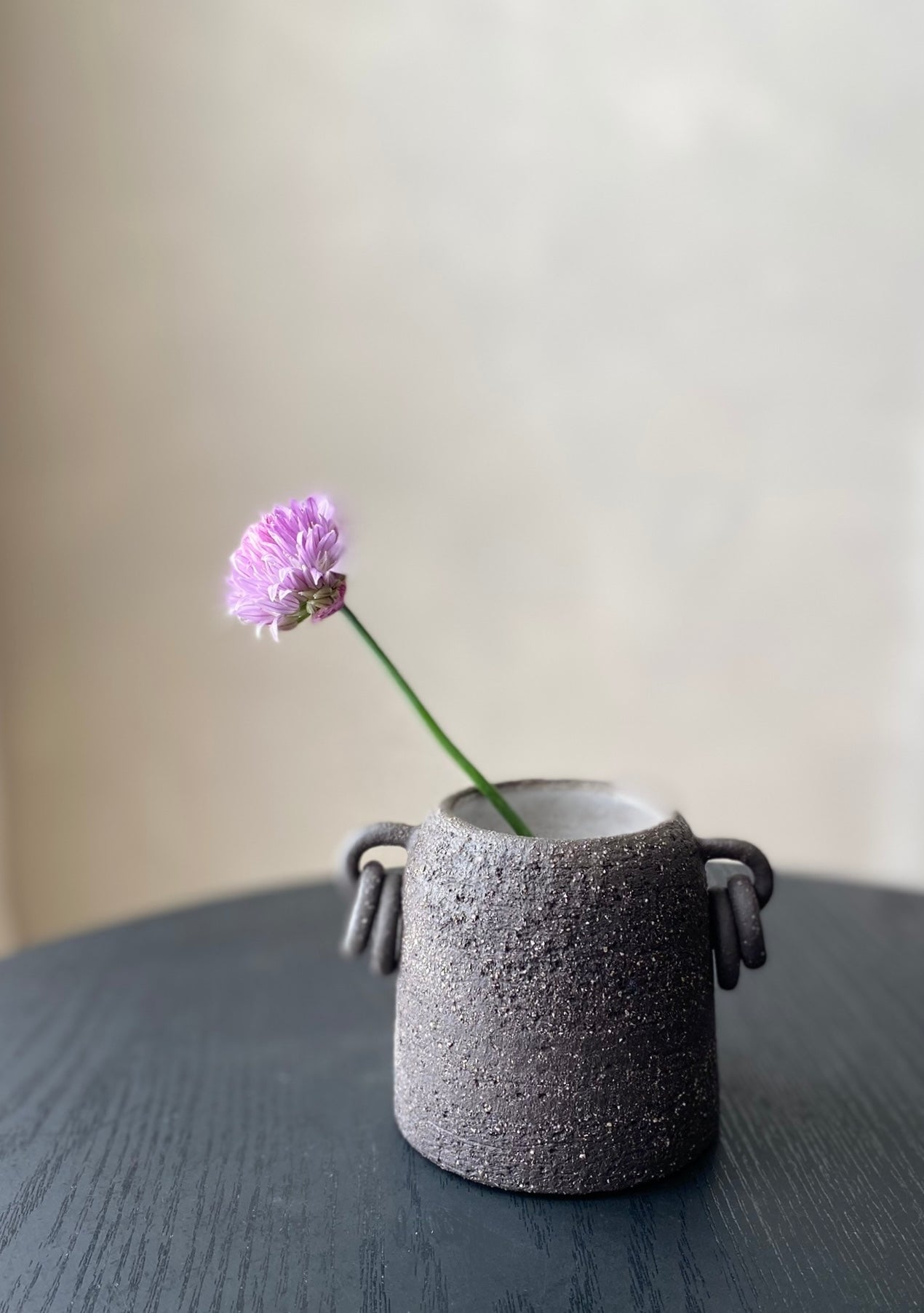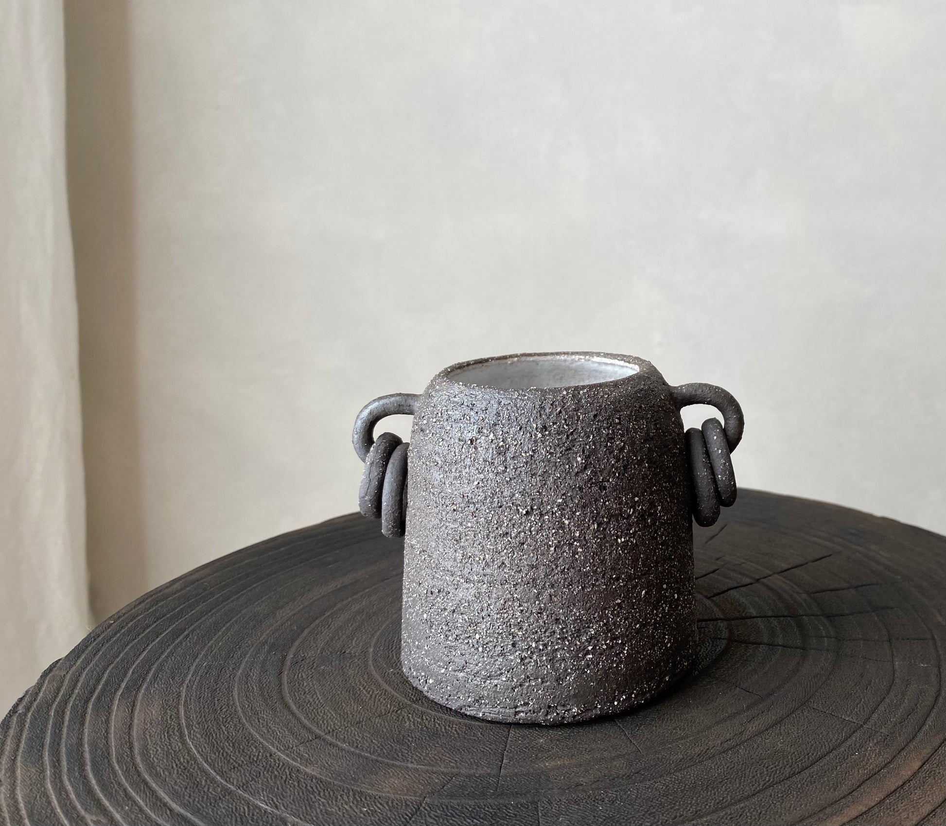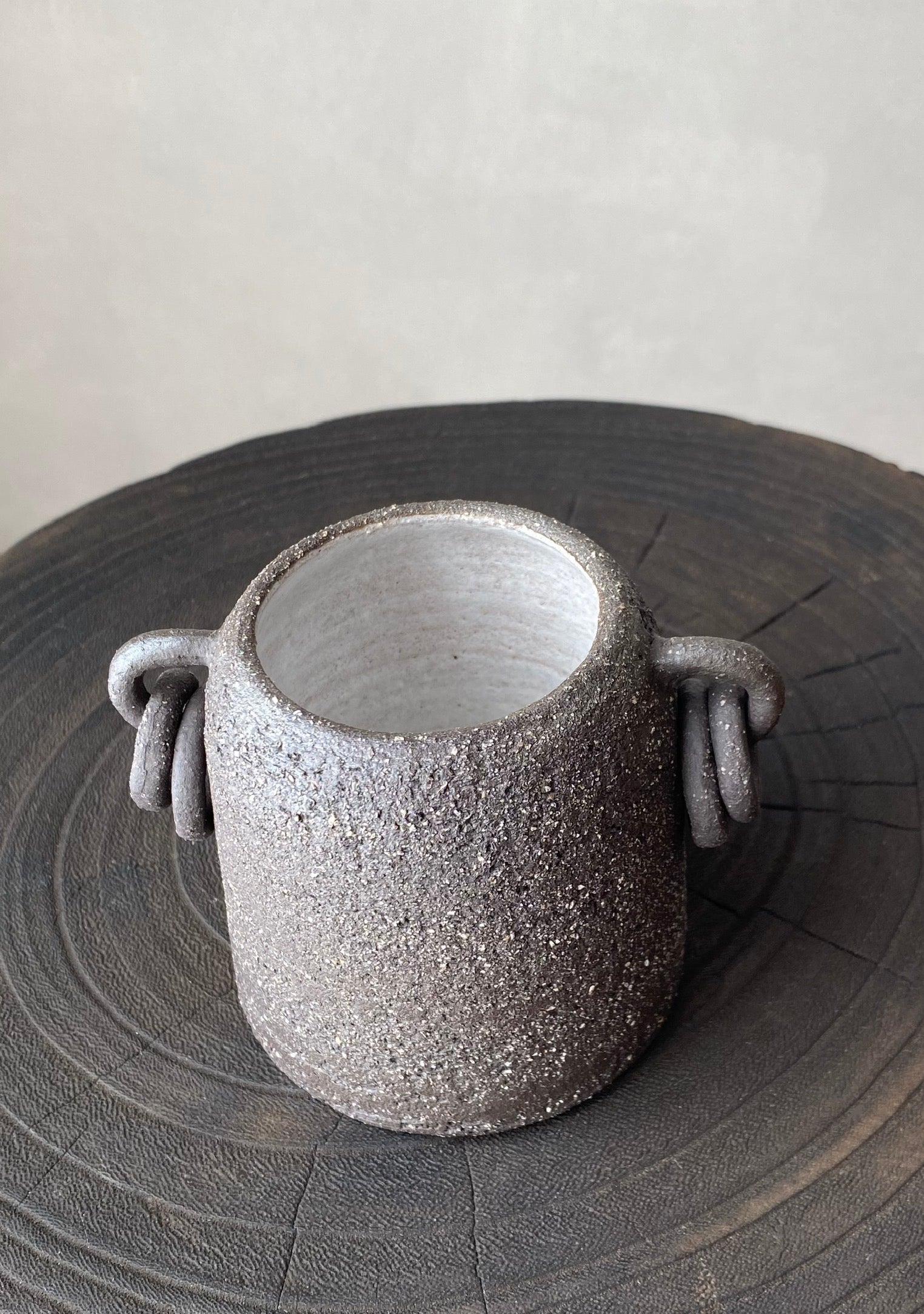 Wheel formed textured stoneware, unglazed surface with an internal matte white glaze and hand formed 'earring' decoration