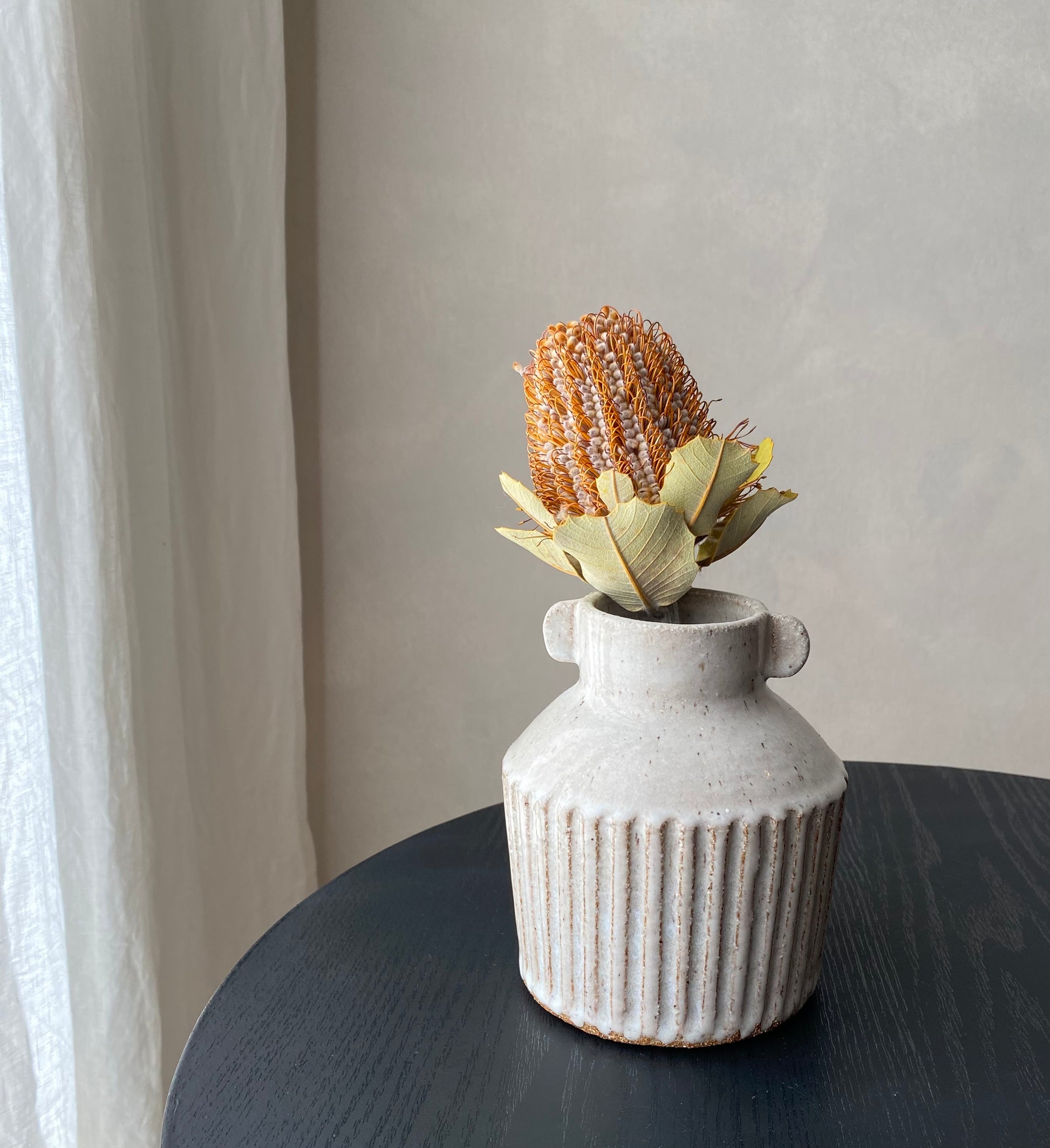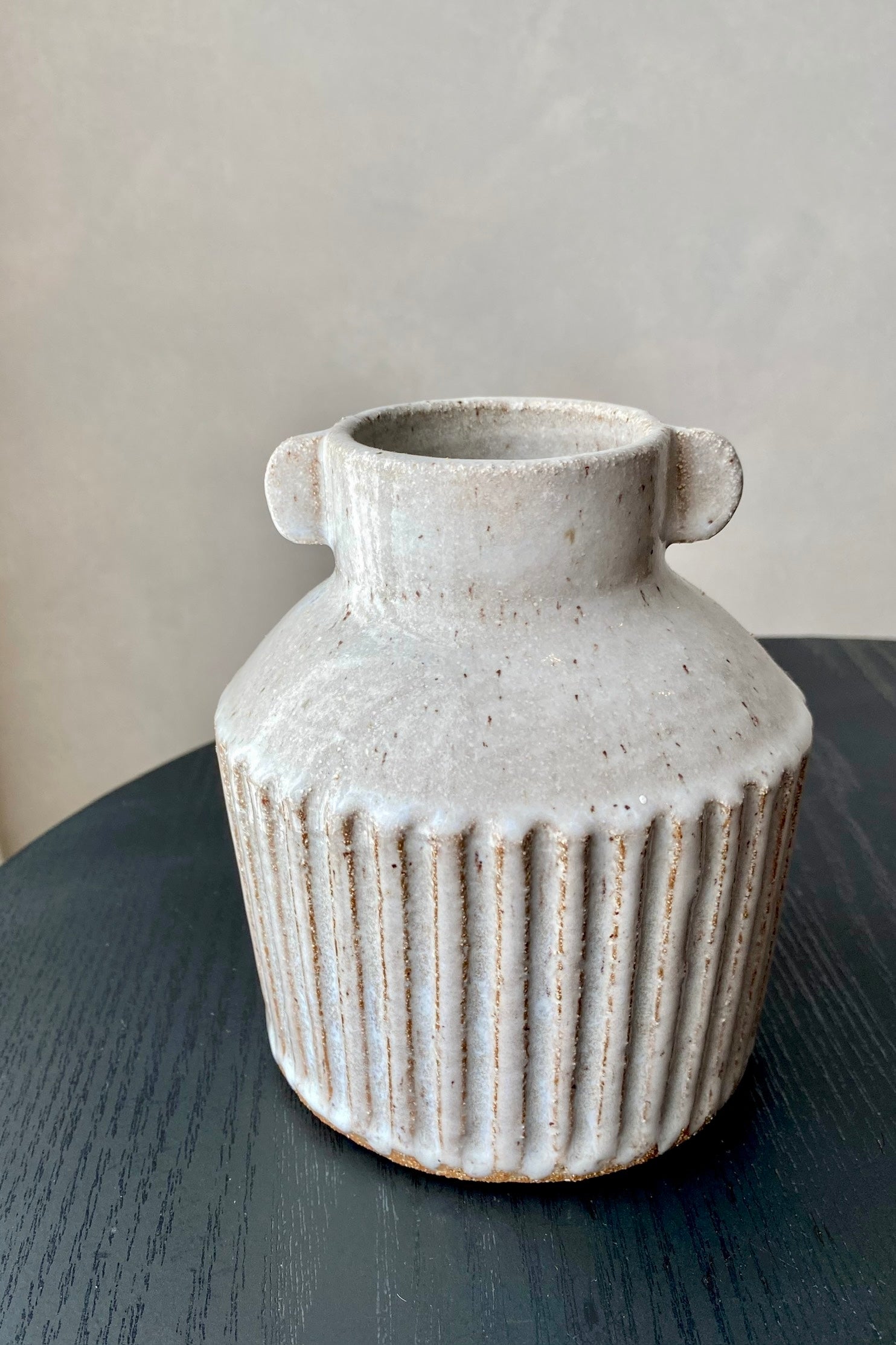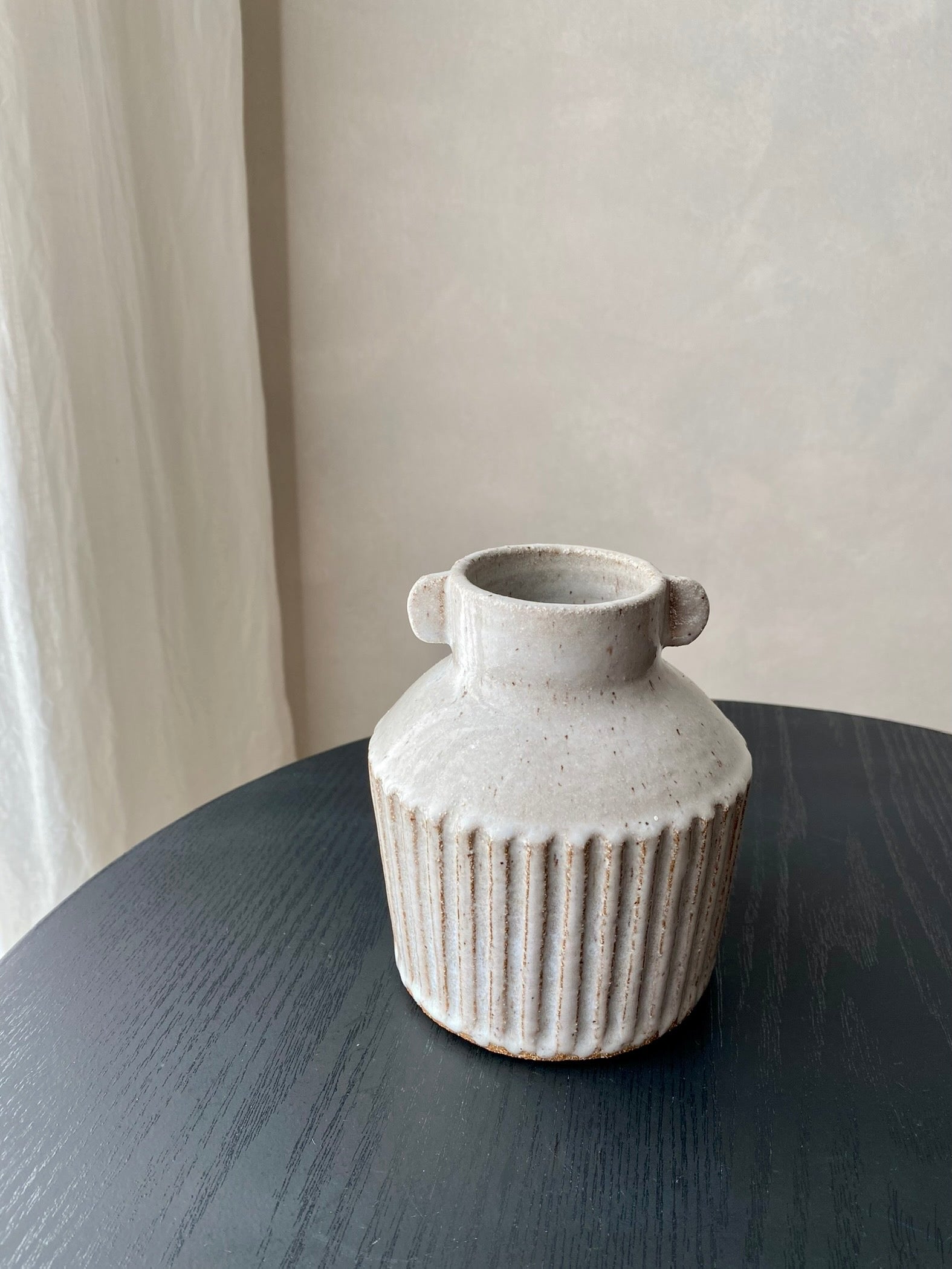 Wheel formed textured stoneware with speckled white gloss glaze. Hand carved fluting on external surface and hand formed tab decoration