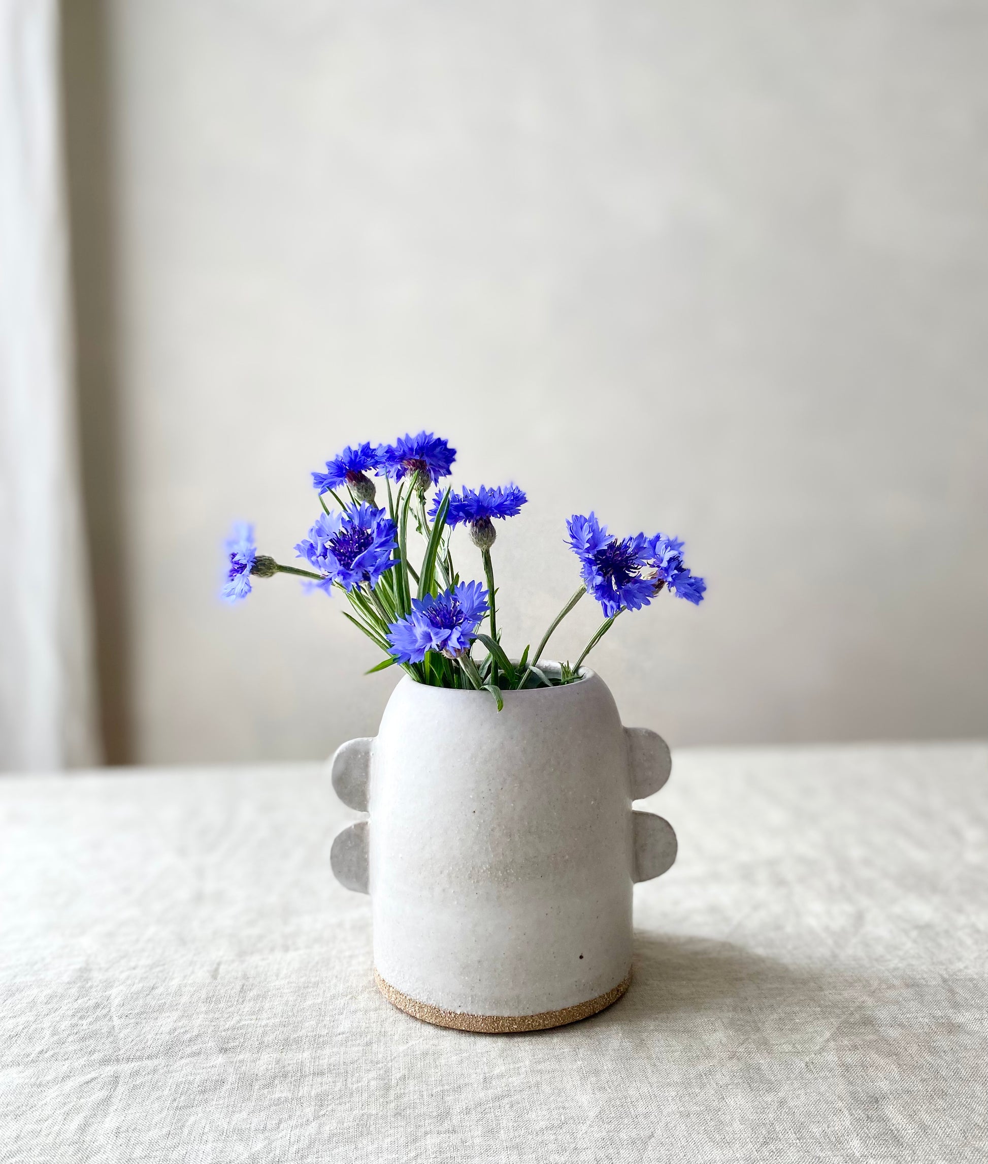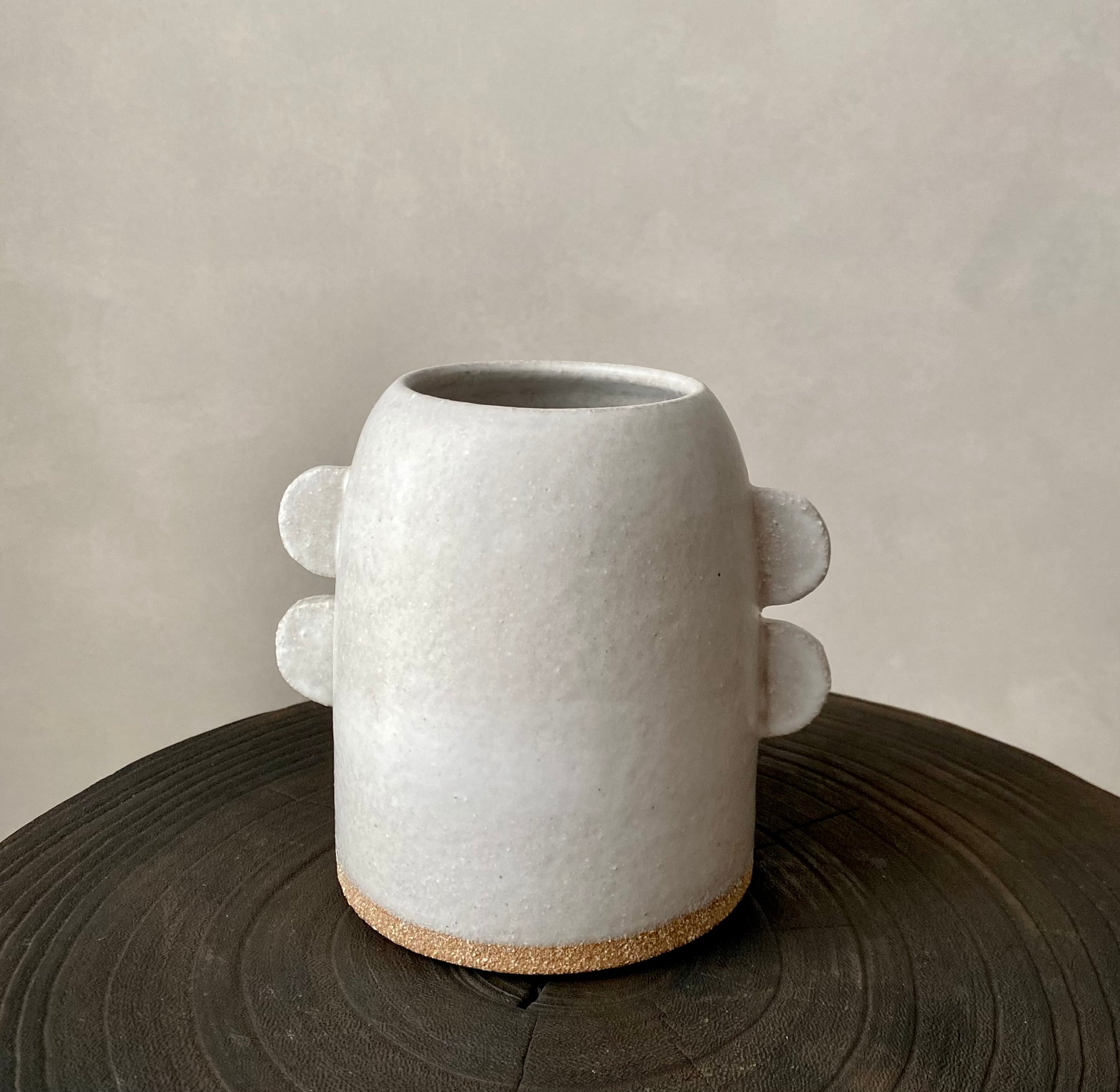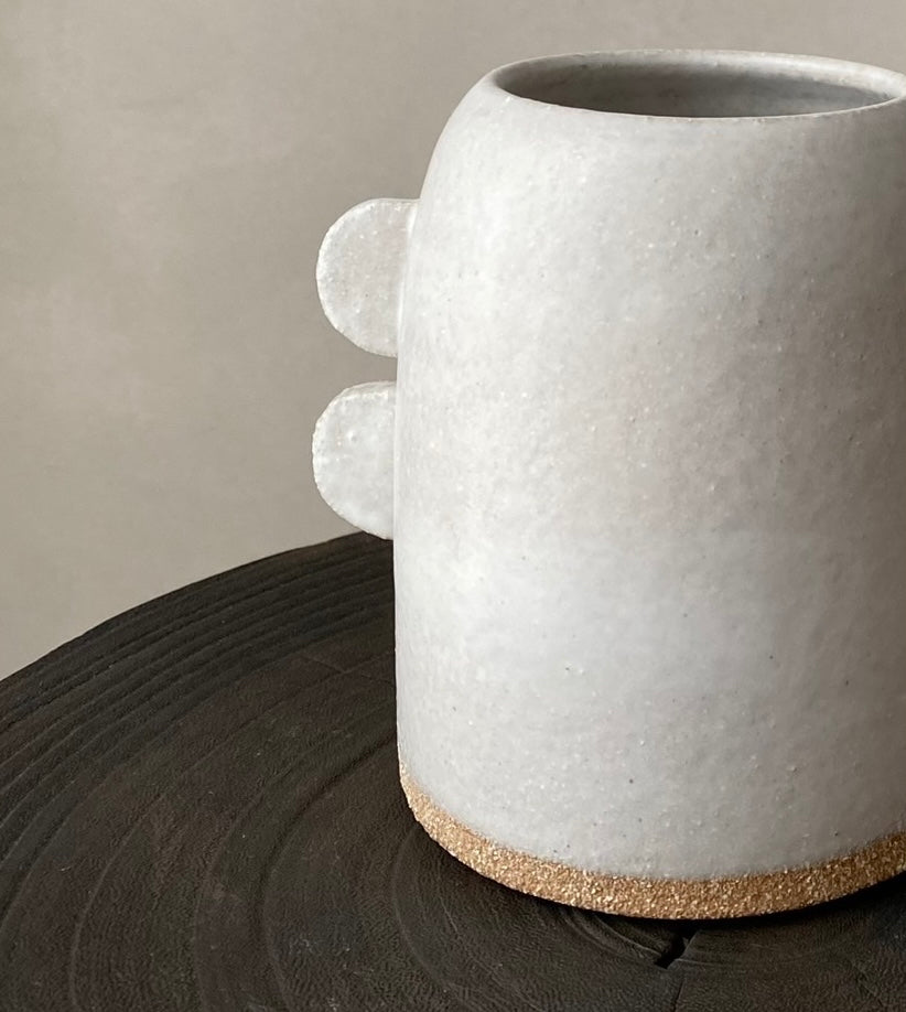 Wheel formed textured stoneware with matte white glaze and hand formed 'tab' decoration