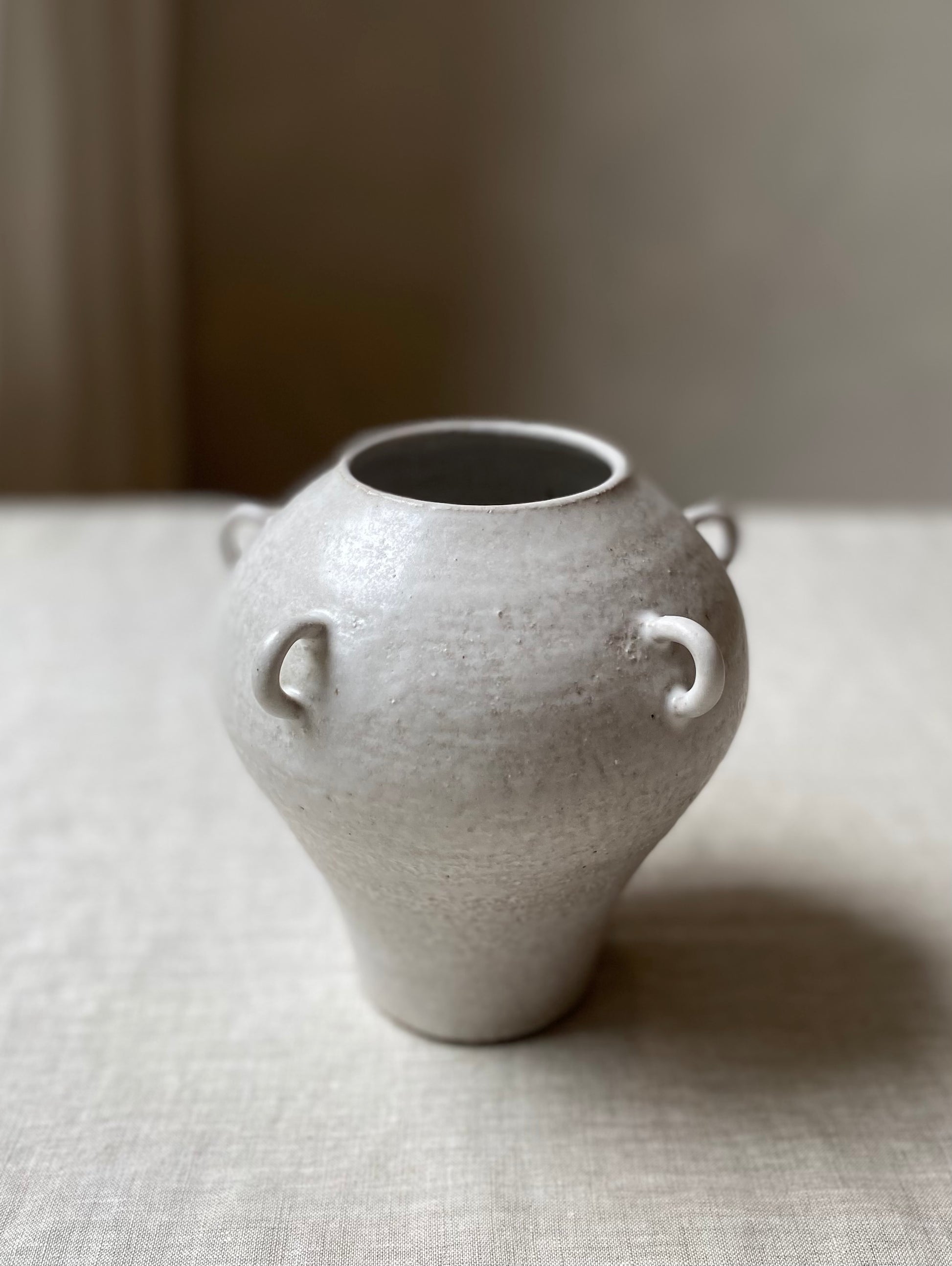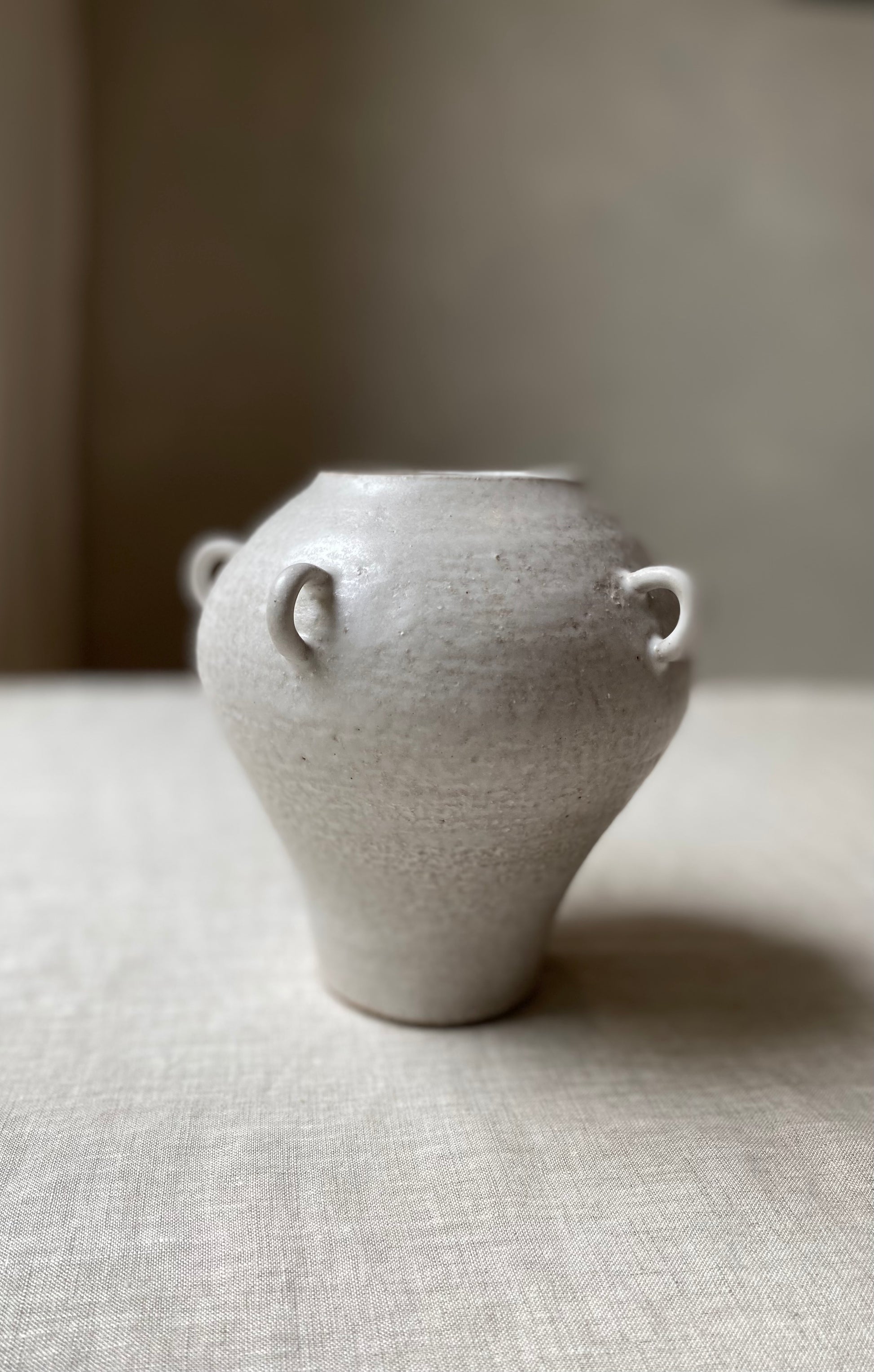 Wheel formed textured stoneware with matte white glaze and hand formed 'loop' decoration